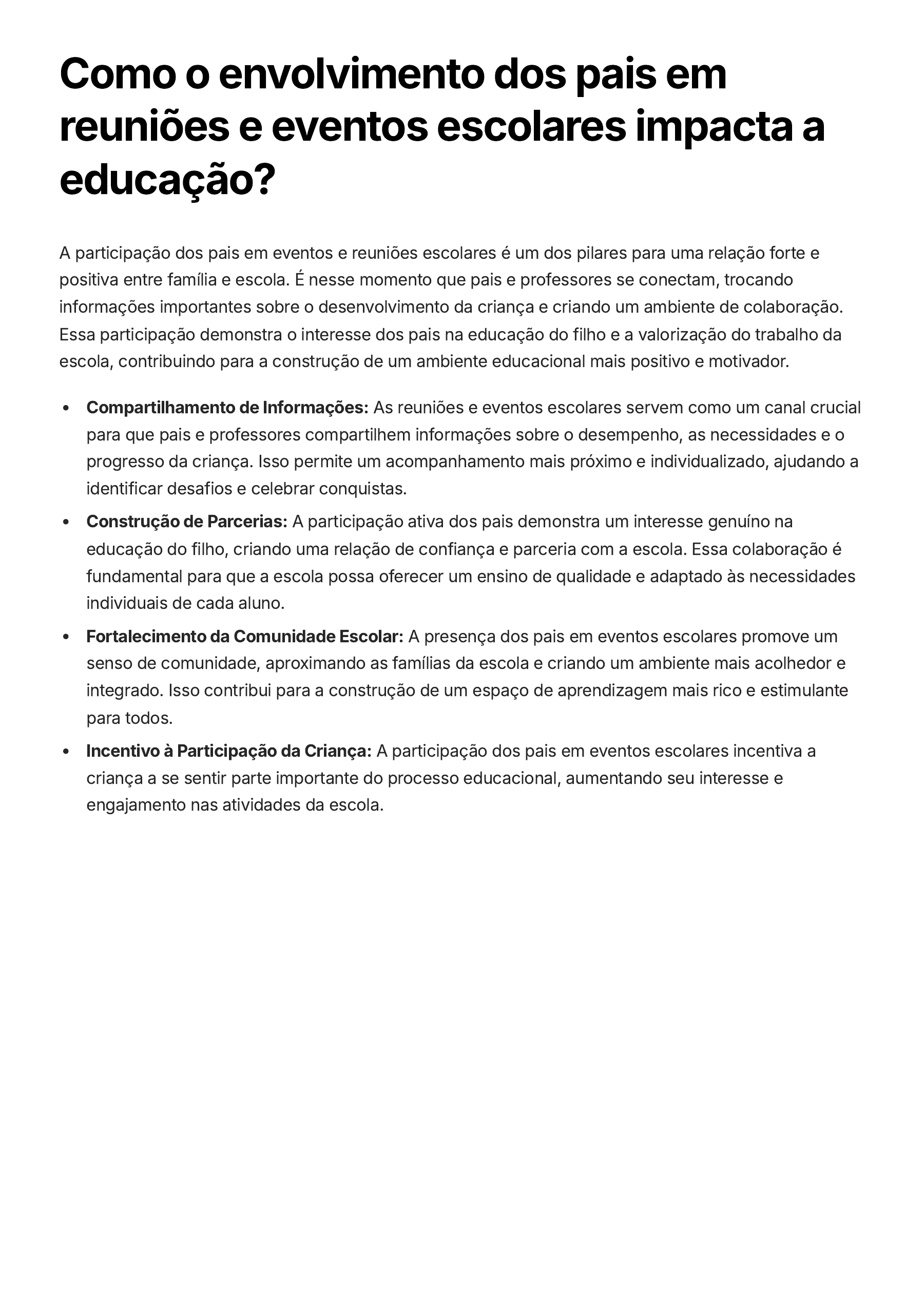 Como o envolvimento dos pais em reuniões e eventos escolares impacta a educação? A participação dos pais em eventos e reuniões escolares é um dos pilares para uma relação forte e positiva entre família e escola. É nesse momento que pais e professores se conectam, trocando informações importantes sobre o desenvolvimento da criança e criando um ambiente de colaboração. Essa participação demonstra o interesse dos pais na educação do filho e a valorização do trabalho da escola, contribuindo para a construção de um ambiente educacional mais positivo e motivador. Compartilhamento de Informações: As reuniões e eventos escolares servem como um canal crucial para que pais e professores compartilhem informações sobre o desempenho, as necessidades e o progresso da criança. Isso permite um acompanhamento mais próximo e individualizado, ajudando a identificar desafios e celebrar conquistas. Construção de Parcerias: A participação ativa dos pais demonstra um interesse genuíno na educação do filho, criando uma relação de confiança e parceria com a escola. Essa colaboração é fundamental para que a escola possa oferecer um ensino de qualidade e adaptado às necessidades individuais de cada aluno. Fortalecimento da Comunidade Escolar: A presença dos pais em eventos escolares promove um senso de comunidade, aproximando as famílias da escola e criando um ambiente mais acolhedor e integrado. Isso contribui para a construção de um espaço de aprendizagem mais rico e estimulante para todos. Incentivo à Participação da Criança: A participação dos pais em eventos escolares incentiva a criança a se sentir parte importante do processo educacional, aumentando seu interesse e engajamento nas atividades da escola. Por que é importante o acompanhamento dos pais nas tarefas de casa? O acompanhamento dos pais nas tarefas de casa é fundamental para o desenvolvimento da criança, desempenhando um papel crucial no aprendizado e na construção de uma relação positiva com a escola. Ao se envolverem nesse processo, os pais demonstram interesse e apoio à educação dos filhos, criando um ambiente propício ao aprendizado e ao desenvolvimento de habilidades importantes. A participação dos pais nas tarefas de casa pode assumir diferentes formas, desde a simples verificação da realização das atividades até a resolução de dúvidas e a orientação em áreas específicas. É importante que os pais estejam presentes e disponíveis para auxiliar a criança, mas sem interferir no processo de aprendizagem. O objetivo é oferecer apoio e orientação, e não fazer o trabalho por ela. O acompanhamento nas tarefas de casa proporciona diversos benefícios, como: Compreensão do conteúdo: Ao revisar as tarefas, os pais podem identificar dificuldades específicas e auxiliar a criança a entender melhor os conceitos aprendidos. Desenvolvimento da autonomia: O apoio dos pais durante a realização das tarefas estimula a criança a desenvolver autonomia e responsabilidade, incentivando-a a se esforçar para completar as atividades de forma independente. Melhoria do desempenho escolar: O acompanhamento regular das tarefas ajuda a identificar e corrigir erros, além de fortalecer o aprendizado e contribuir para a melhoria do desempenho escolar da criança. Fortalecimento do vínculo familiar: O tempo dedicado às tarefas de casa proporciona momentos de interação e comunicação entre pais e filhos, estreitando o vínculo familiar e criando um ambiente de confiança e apoio mútuo. É importante que os pais criem um ambiente tranquilo e livre de distrações para que a criança possa se concentrar nas tarefas. O acompanhamento deve ser feito de forma paciente e encorajadora, celebrando os progressos da criança e reconhecendo seu esforço. A comunicação aberta e o diálogo constante entre pais e professores são essenciais para garantir que o acompanhamento seja eficaz e contribua positivamente para o desenvolvimento da criança. Como a Escola Pode Apoiar as Famílias em Dificuldades? A escola desempenha um papel crucial no apoio às famílias que enfrentam desafios, atuando como um elo fundamental na rede de suporte à criança e ao seu desenvolvimento. A escola pode oferecer diversas formas de apoio, reconhecendo que as dificuldades familiares impactam diretamente o desempenho escolar e o bem-estar emocional dos alunos. Orientação e Aconselhamento: Oferecer suporte psicológico e pedagógico aos pais, auxiliando-os na compreensão das necessidades da criança e na superação de obstáculos. Recursos e Programas: Criar programas específicos para atender às famílias em situação de vulnerabilidade, como projetos de apoio alimentar, acompanhamento médico e psicológico, e atividades de enriquecimento cultural. Rede de Apoio: Estabelecer parcerias com outras instituições, como ONGs, serviços sociais e de saúde, para garantir um suporte integral às famílias. Comunicação Aberta: Manter um diálogo constante com os pais, informando-os sobre o progresso da criança, suas dificuldades e os recursos disponíveis para ajudá-los. As ações da escola devem ser personalizadas, levando em consideração as necessidades específicas de cada família. É fundamental que a escola promova um ambiente acolhedor e de confiança, onde os pais se sintam à vontade para buscar ajuda e compartilhar suas dificuldades, sem receios ou julgamentos.
