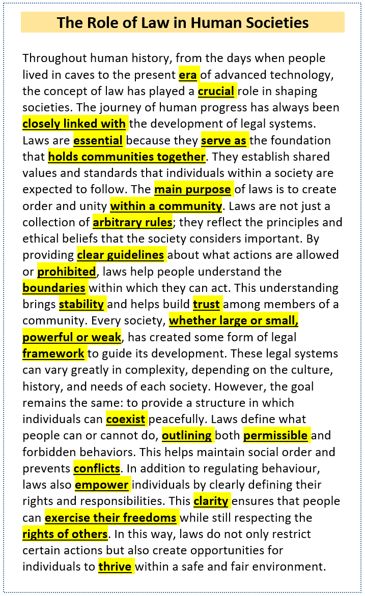 The Role of Law in Human Societies Throughout human history, from the days when people lived in caves to the present era of advanced technology, the concept of law has played a crucial role in shaping societies. The journey of human progress has always been closely linked with the development of legal systems. Laws are essential because they serve as the foundation that holds communities together. They establish shared values and standards that individuals within a society are expected to follow. The main purpose of laws is to create order and unity within a community. Laws are not just a collection of arbitrary rules; they reflect the principles and ethical beliefs that the society considers important. By providing clear guidelines about what actions are allowed or prohibited, laws help people understand the boundaries within which they can act. This understanding brings stability and helps build trust among members of a community. Every society, whether large or small, powerful or weak, has created some form of legal framework to guide its development. These legal systems can vary greatly in complexity, depending on the culture, history, and needs of each society. However, the goal remains the same: to provide a structure in which individuals can coexist peacefully. Laws define what people can or cannot do, outlining both permissible and forbidden behaviors. This helps maintain social order and prevents conflicts. In addition to regulating behaviour, laws also empower individuals by clearly defining their rights and responsibilities. This clarity ensures that people can exercise their freedoms while still respecting the rights of others. In this way, laws do not only restrict certain actions but also create opportunities for individuals to thrive within a safe and fair environment.