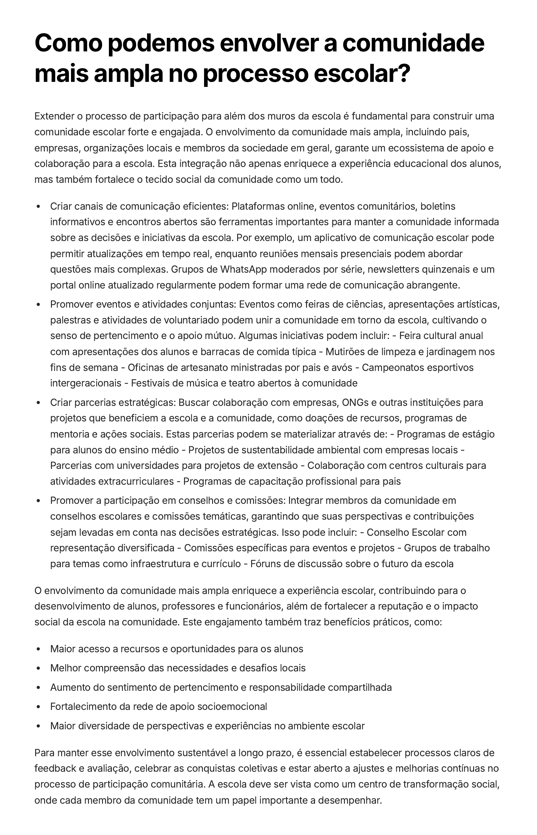 Como podemos envolver a comunidade mais ampla no processo escolar? Extender o processo de participação para além dos muros da escola é fundamental para construir uma comunidade escolar forte e engajada. O envolvimento da comunidade mais ampla, incluindo pais, empresas, organizações locais e membros da sociedade em geral, garante um ecossistema de apoio e colaboração para a escola. Esta integração não apenas enriquece a experiência educacional dos alunos, mas também fortalece o tecido social da comunidade como um todo. Criar canais de comunicação eficientes: Plataformas online, eventos comunitários, boletins informativos e encontros abertos são ferramentas importantes para manter a comunidade informada sobre as decisões e iniciativas da escola. Por exemplo, um aplicativo de comunicação escolar pode permitir atualizações em tempo real, enquanto reuniões mensais presenciais podem abordar questões mais complexas. Grupos de WhatsApp moderados por série, newsletters quinzenais e um portal online atualizado regularmente podem formar uma rede de comunicação abrangente. Promover eventos e atividades conjuntas: Eventos como feiras de ciências, apresentações artísticas, palestras e atividades de voluntariado podem unir a comunidade em torno da escola, cultivando o senso de pertencimento e o apoio mútuo. Algumas iniciativas podem incluir: - Feira cultural anual com apresentações dos alunos e barracas de comida típica - Mutirões de limpeza e jardinagem nos fins de semana - Oficinas de artesanato ministradas por pais e avós - Campeonatos esportivos intergeracionais - Festivais de música e teatro abertos à comunidade Criar parcerias estratégicas: Buscar colaboração com empresas, ONGs e outras instituições para projetos que beneficiem a escola e a comunidade, como doações de recursos, programas de mentoria e ações sociais. Estas parcerias podem se materializar através de: - Programas de estágio para alunos do ensino médio - Projetos de sustentabilidade ambiental com empresas locais - Parcerias com universidades para projetos de extensão - Colaboração com centros culturais para atividades extracurriculares - Programas de capacitação profissional para pais Promover a participação em conselhos e comissões: Integrar membros da comunidade em conselhos escolares e comissões temáticas, garantindo que suas perspectivas e contribuições sejam levadas em conta nas decisões estratégicas. Isso pode incluir: - Conselho Escolar com representação diversificada - Comissões específicas para eventos e projetos - Grupos de trabalho para temas como infraestrutura e currículo - Fóruns de discussão sobre o futuro da escola O envolvimento da comunidade mais ampla enriquece a experiência escolar, contribuindo para o desenvolvimento de alunos, professores e funcionários, além de fortalecer a reputação e o impacto social da escola na comunidade. Este engajamento também traz benefícios práticos, como: Maior acesso a recursos e oportunidades para os alunos Melhor compreensão das necessidades e desafios locais Aumento do sentimento de pertencimento e responsabilidade compartilhada Fortalecimento da rede de apoio socioemocional Maior diversidade de perspectivas e experiências no ambiente escolar Para manter esse envolvimento sustentável a longo prazo, é essencial estabelecer processos claros de feedback e avaliação, celebrar as conquistas coletivas e estar aberto a ajustes e melhorias contínuas no processo de participação comunitária. A escola deve ser vista como um centro de transformação social, onde cada membro da comunidade tem um papel importante a desempenhar.