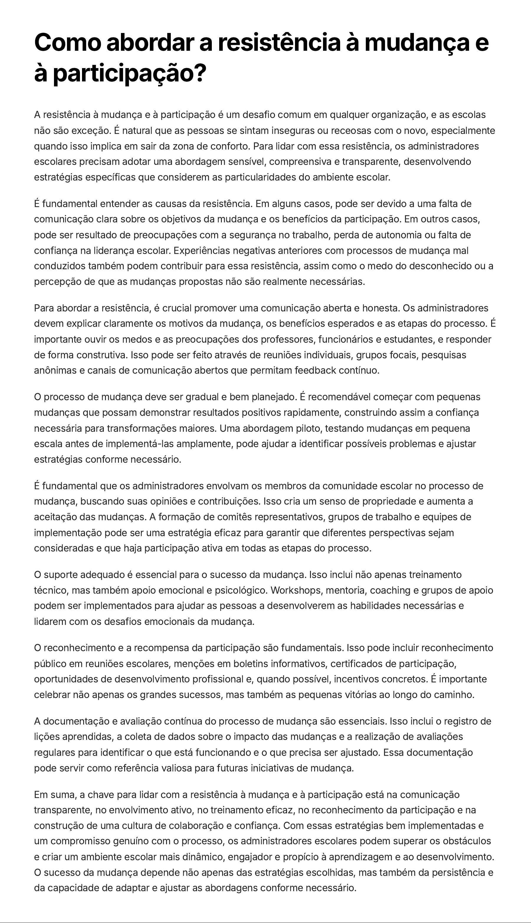 Como abordar a resistência à mudança e à participação? A resistência à mudança e à participação é um desafio comum em qualquer organização, e as escolas não são exceção. É natural que as pessoas se sintam inseguras ou receosas com o novo, especialmente quando isso implica em sair da zona de conforto. Para lidar com essa resistência, os administradores escolares precisam adotar uma abordagem sensível, compreensiva e transparente, desenvolvendo estratégias específicas que considerem as particularidades do ambiente escolar. É fundamental entender as causas da resistência. Em alguns casos, pode ser devido a uma falta de comunicação clara sobre os objetivos da mudança e os benefícios da participação. Em outros casos, pode ser resultado de preocupações com a segurança no trabalho, perda de autonomia ou falta de confiança na liderança escolar. Experiências negativas anteriores com processos de mudança mal conduzidos também podem contribuir para essa resistência, assim como o medo do desconhecido ou a percepção de que as mudanças propostas não são realmente necessárias. Para abordar a resistência, é crucial promover uma comunicação aberta e honesta. Os administradores devem explicar claramente os motivos da mudança, os benefícios esperados e as etapas do processo. É importante ouvir os medos e as preocupações dos professores, funcionários e estudantes, e responder de forma construtiva. Isso pode ser feito através de reuniões individuais, grupos focais, pesquisas anônimas e canais de comunicação abertos que permitam feedback contínuo. O processo de mudança deve ser gradual e bem planejado. É recomendável começar com pequenas mudanças que possam demonstrar resultados positivos rapidamente, construindo assim a confiança necessária para transformações maiores. Uma abordagem piloto, testando mudanças em pequena escala antes de implementá-las amplamente, pode ajudar a identificar possíveis problemas e ajustar estratégias conforme necessário. É fundamental que os administradores envolvam os membros da comunidade escolar no processo de mudança, buscando suas opiniões e contribuições. Isso cria um senso de propriedade e aumenta a aceitação das mudanças. A formação de comitês representativos, grupos de trabalho e equipes de implementação pode ser uma estratégia eficaz para garantir que diferentes perspectivas sejam consideradas e que haja participação ativa em todas as etapas do processo. O suporte adequado é essencial para o sucesso da mudança. Isso inclui não apenas treinamento técnico, mas também apoio emocional e psicológico. Workshops, mentoria, coaching e grupos de apoio podem ser implementados para ajudar as pessoas a desenvolverem as habilidades necessárias e lidarem com os desafios emocionais da mudança. O reconhecimento e a recompensa da participação são fundamentais. Isso pode incluir reconhecimento público em reuniões escolares, menções em boletins informativos, certificados de participação, oportunidades de desenvolvimento profissional e, quando possível, incentivos concretos. É importante celebrar não apenas os grandes sucessos, mas também as pequenas vitórias ao longo do caminho. A documentação e avaliação contínua do processo de mudança são essenciais. Isso inclui o registro de lições aprendidas, a coleta de dados sobre o impacto das mudanças e a realização de avaliações regulares para identificar o que está funcionando e o que precisa ser ajustado. Essa documentação pode servir como referência valiosa para futuras iniciativas de mudança. Em suma, a chave para lidar com a resistência à mudança e à participação está na comunicação transparente, no envolvimento ativo, no treinamento eficaz, no reconhecimento da participação e na construção de uma cultura de colaboração e confiança. Com essas estratégias bem implementadas e um compromisso genuíno com o processo, os administradores escolares podem superar os obstáculos e criar um ambiente escolar mais dinâmico, engajador e propício à aprendizagem e ao desenvolvimento. O sucesso da mudança depende não apenas das estratégias escolhidas, mas também da persistência e da capacidade de adaptar e ajustar as abordagens conforme necessário.
