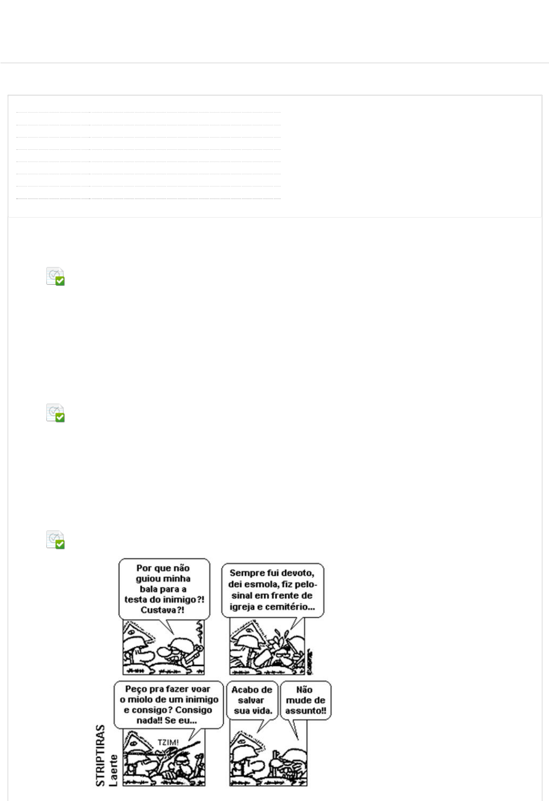 Revisar envio do teste: AVALIAÇÃO IESTUDOS DISCIPLINARES XI 6674-10_DP_CT_21_20242 CONTEÚDO Usuário darley.santos1 @aluno.unip.br Curso ESTUDOS DISCIPLINARES XI Teste AVALIAÇÃO I Iniciado 25/11/24 19:01 Enviado 25/11/24 19:14 Status Completada Resultado da tentativa 9 em 10 pontos Tempo decorrido 13 minutos Resultados exibidos Respostas enviadas, Perguntas respondidas incorretamente Pergunta 1 Resposta Selecionada: e. “Quando os europeus descobriram a América, julgaram ter encontrado o eldorado, a terra prometida, o paraíso. A obra do pré- modernismo que aborda a vinda de imigrantes ao Brasil e a procura destes por terra abundante e em paz é Canaã, de Graça Aranha.” Nesse enunciado, não encontramos: Sujeito simples o termo “de Graça Aranha”. Pergunta 2 Resposta Selecionada: b. (Fund. Carlos Chagas) Os períodos a seguir apresentam diferenças de pontuação. Assinale a letra correspondente ao período de pontuação correta: Hoje eu daria o mesmo conselho: menos doutrina e mais análise. Pergunta 3 Leia a tirinha de Laerte: UNIP EAD BIBLIOTECAS MURAL DO ALUNO TUTORIAISCONTEÚDOS ACADÊMICOS 1 em 1 pontos 1 em 1 pontos 1 em 1 pontos http://company.blackboard.com/ https://ava.ead.unip.br/webapps/blackboard/execute/courseMain?course_id=_371263_1 https://ava.ead.unip.br/webapps/blackboard/content/listContent.jsp?course_id=_371263_1&content_id=_4232611_1&mode=reset https://ava.ead.unip.br/webapps/portal/execute/tabs/tabAction?tab_tab_group_id=_10_1 https://ava.ead.unip.br/webapps/portal/execute/tabs/tabAction?tab_tab_group_id=_27_1 https://ava.ead.unip.br/webapps/portal/execute/tabs/tabAction?tab_tab_group_id=_47_1 https://ava.ead.unip.br/webapps/portal/execute/tabs/tabAction?tab_tab_group_id=_29_1 https://ava.ead.unip.br/webapps/portal/execute/tabs/tabAction?tab_tab_group_id=_25_1 https://ava.ead.unip.br/webapps/login/?action=logout Resposta Selecionada: e. I. Os verbos presentes na tirinha de Laerte são, predominantemente, do modo indicativo. II. Há um verbo no modo imperativo: mudar, presente no último quadro. III. O tempo dos verbos é, predominantemente, pretérito; uma vez que as ações já ocorreram no momento da fala. I, II e III estão corretas. Pergunta 4 Resposta Selecionada: d. Assinale a única frase correta quanto ao uso dos pronomes pessoais: Para mim, jogador de futebol tem que ter raça. Pergunta 5 Resposta Selecionada: c. Em qual frase a crase é empregada devido à exigência do verbo, ou seja, o verbo requer preposição a? Nós fomos à secretaria para protocolar a entrega do trabalho. Pergunta 6 Resposta Selecionada: c. A palavra poço tem como plural poços, pronunciado com “o” aberto. Assinale a alternativa em que todos os substantivos estão nesse mesmo caso: Foro, moço, almoço. Pergunta 7 Resposta Selecionada: d. São quatro substantivos grifados e um adjetivo grifado. Indique o adjetivo: A noite ventilada. Pergunta 8 Resposta Selecionada: d. (MM) A alternativa errada quanto ao emprego do porque é: Ele não veio por que estava doente. Pergunta 9 Complete as lacunas com o pronome adequado: 1- “_____ documento que tens à mão é importante, Pedrinho? 1 em 1 pontos 1 em 1 pontos 0 em 1 pontos 1 em 1 pontos 1 em 1 pontos 1 em 1 pontos Segunda-feira, 25 de Novembro de 2024 19h14min49s BRT Resposta Selecionada: a. 2- “A estrada do mar, larga e oscilante, _______, sim, o tentava.” 3- “Na traseira do caminhão lia-se ________ frase: Tristeza não paga dívida”. 4- “Cuidado, mergulhador, ________ animais são venenosos: a arraia miúda, o peixe-escorpião, a medusa, o mangangá.” Esse – essa – esta – estes. Pergunta 10 Resposta Selecionada: d. Leia o poema: “Não faças versos sobre acontecimentos, Não há criação nem morte perante a poesia. Diante dela, a vida é um sol estático, não aquece nem ilumina. As a�nidades, os aniversários, os incidentes pessoais não contam. [...] Penetra surdamente no reino das palavras. Lá estão os poemas que esperam ser escritos. [...] Chega mais perto e contempla as palavras. Cada uma tem mil faces secretas sob a face neutra e te pergunta, sem interesse pela resposta pobre ou terrível, que lhe deres: Trouxeste a chave?” Os verbos em destaque estão: No modo imperativo negativo e a�rmativo. ← OK 1 em 1 pontos