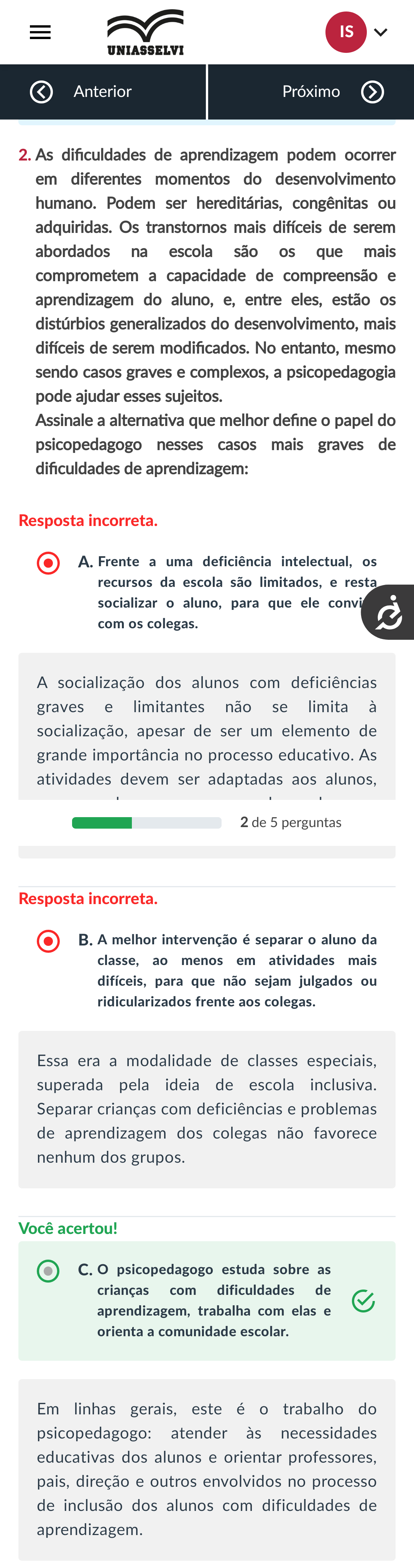 IS UNIASSELVI Anterior Próximo > 2. As dificuldades de aprendizagem podem ocorrer em diferentes momentos do desenvolvimento humano. Podem ser hereditárias, congênitas ou adquiridas. Os transtornos mais difíceis de serem abordados na escola são os que mais comprometem a capacidade de compreensão e aprendizagem do aluno, e, entre eles, estão os distúrbios generalizados do desenvolvimento, mais difíceis de serem modificados. No entanto, mesmo sendo casos graves e complexos, a psicopedagogia pode ajudar esses sujeitos. Assinale a alternativa que melhor define o papel do psicopedagogo nesses casos mais graves de dificuldades de aprendizagem: Resposta incorreta. A. Frente a uma deficiência intelectual, os recursos da escola são limitados, e resta socializar o aluno, para que ele convi com os colegas. A socialização dos alunos com deficiências graves e limitantes não se limita à socialização, apesar de ser um elemento de grande importância no processo educativo. As atividades devem ser adaptadas aos alunos, 2 de 5 perguntas Resposta incorreta. B. A melhor intervenção é separar o aluno da classe, ao menos em atividades mais difíceis, para que não sejam julgados ou ridicularizados frente aos colegas. Essa era a modalidade de classes especiais, superada pela ideia de escola inclusiva. Separar crianças com deficiências e problemas de aprendizagem dos colegas não favorece nenhum dos grupos. Você acertou! C. psicopedagogo estuda sobre as crianças com dificuldades de aprendizagem, trabalha com elas e orienta a comunidade escolar. Em linhas gerais, este é o trabalho do psicopedagogo: atender às necessidades educativas dos alunos e orientar professores, pais, direção e outros envolvidos no processo de inclusão dos alunos com dificuldades de aprendizagem.