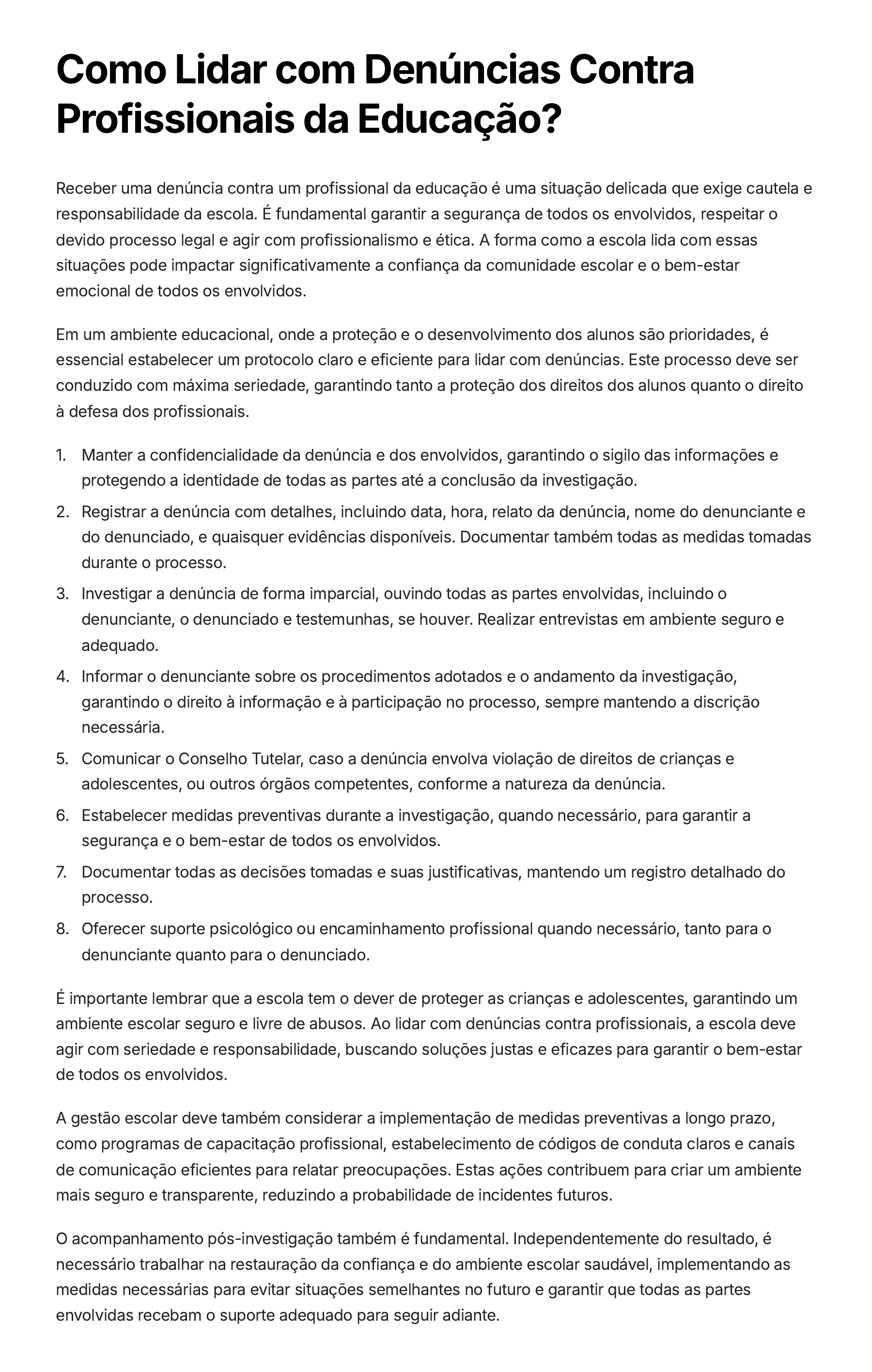 Como Lidar com Denúncias Contra Profissionais da Educação? Receber uma denúncia contra um profissional da educação é uma situação delicada que exige cautela e responsabilidade da escola. É fundamental garantir a segurança de todos os envolvidos, respeitar o devido processo legal e agir com profissionalismo e ética. A forma como a escola lida com essas situações pode impactar significativamente a confiança da comunidade escolar e o bem-estar emocional de todos os envolvidos. Em um ambiente educacional, onde a proteção e o desenvolvimento dos alunos são prioridades, é essencial estabelecer um protocolo claro e eficiente para lidar com denúncias. Este processo deve ser conduzido com máxima seriedade, garantindo tanto a proteção dos direitos dos alunos quanto o direito à defesa dos profissionais. Manter a confidencialidade da denúncia e dos envolvidos, garantindo o sigilo das informações e protegendo a identidade de todas as partes até a conclusão da investigação. 1. Registrar a denúncia com detalhes, incluindo data, hora, relato da denúncia, nome do denunciante e do denunciado, e quaisquer evidências disponíveis. Documentar também todas as medidas tomadas durante o processo. 2. Investigar a denúncia de forma imparcial, ouvindo todas as partes envolvidas, incluindo o denunciante, o denunciado e testemunhas, se houver. Realizar entrevistas em ambiente seguro e adequado. 3. Informar o denunciante sobre os procedimentos adotados e o andamento da investigação, garantindo o direito à informação e à participação no processo, sempre mantendo a discrição necessária. 4. Comunicar o Conselho Tutelar, caso a denúncia envolva violação de direitos de crianças e adolescentes, ou outros órgãos competentes, conforme a natureza da denúncia. 5. Estabelecer medidas preventivas durante a investigação, quando necessário, para garantir a segurança e o bem-estar de todos os envolvidos. 6. Documentar todas as decisões tomadas e suas justificativas, mantendo um registro detalhado do processo. 7. Oferecer suporte psicológico ou encaminhamento profissional quando necessário, tanto para o denunciante quanto para o denunciado. 8. É importante lembrar que a escola tem o dever de proteger as crianças e adolescentes, garantindo um ambiente escolar seguro e livre de abusos. Ao lidar com denúncias contra profissionais, a escola deve agir com seriedade e responsabilidade, buscando soluções justas e eficazes para garantir o bem-estar de todos os envolvidos. A gestão escolar deve também considerar a implementação de medidas preventivas a longo prazo, como programas de capacitação profissional, estabelecimento de códigos de conduta claros e canais de comunicação eficientes para relatar preocupações. Estas ações contribuem para criar um ambiente mais seguro e transparente, reduzindo a probabilidade de incidentes futuros. O acompanhamento pós-investigação também é fundamental. Independentemente do resultado, é necessário trabalhar na restauração da confiança e do ambiente escolar saudável, implementando as medidas necessárias para evitar situações semelhantes no futuro e garantir que todas as partes envolvidas recebam o suporte adequado para seguir adiante.