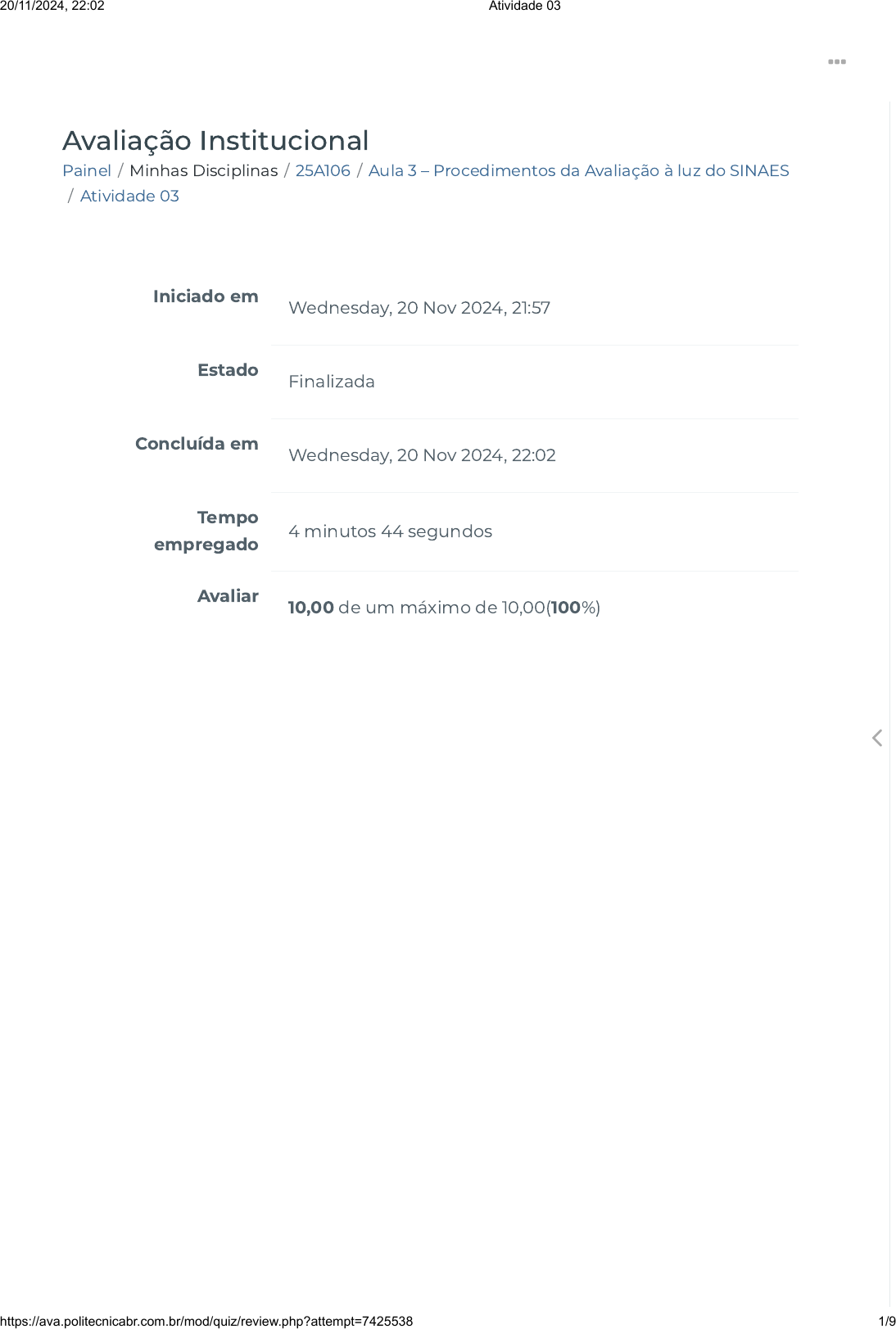 Painel / Minhas Disciplinas / 25A106 / Aula 3 – Procedimentos da Avaliação à luz do SINAES / Atividade 03 Avaliação Institucional Iniciado em Wednesday, 20 Nov 2024, 21:57 Estado Finalizada Concluída em Wednesday, 20 Nov 2024, 22:02 Tempo empregado 4 minutos 44 segundos Avaliar 10,00 de um máximo de 10,00(100%) 20/11/2024, 22:02 Atividade 03 https://ava.politecnicabr.com.br/mod/quiz/review.php?attempt=7425538 1/9 https://ava.politecnicabr.com.br/my/ https://ava.politecnicabr.com.br/my/ https://ava.politecnicabr.com.br/course/view.php?id=989 https://ava.politecnicabr.com.br/course/view.php?id=989#section-4 https://ava.politecnicabr.com.br/mod/quiz/view.php?id=26679 https://ava.politecnicabr.com.br/ Questão 1 Correto Atingiu 1,50 de 1,50 Foi instituído com o objetivo de garantir qualidade ao processo nacional de avaliação das Instituições de Educação Superior, dos cursos de graduação e do desempenho acadêmico de seus estudantes. Escolha uma opção: a. LDB b. SINAES c. ENADE d. CAPES 20/11/2024, 22:02 Atividade 03 https://ava.politecnicabr.com.br/mod/quiz/review.php?attempt=7425538 2/9 https://ava.politecnicabr.com.br/ Questão 2 Correto Atingiu 1,50 de 1,50 Compreende o processo de Avaliação Institucional das Instituições de Ensino Superior, apresentado pelo SINAES, exceto a opção: Escolha uma opção: a. Avaliação dos Cursos de Graduação (ACG) b. Avaliação do Desempenho dos Estudantes (ENADE) c. Avaliação das Instituições de Ensino Superior (AIES) d. Avaliação externa in loco, realizada por Comissão Externa de Avaliação Institucional designada pelo Instituto Nacional de Estudos e Pesquisas Educacionais (Inep). 20/11/2024, 22:02 Atividade 03 https://ava.politecnicabr.com.br/mod/quiz/review.php?attempt=7425538 3/9 https://ava.politecnicabr.com.br/ Questão 3 Correto Atingiu 1,50 de 1,50 O atual SINAES estabelece três grandes eixos de trabalho. Não faz parte desses eixos a opção: Escolha uma opção: a. Desenvolvimento b. Preparação c. Consolidação d. Sensibilização 20/11/2024, 22:02 Atividade 03 https://ava.politecnicabr.com.br/mod/quiz/review.php?attempt=7425538 4/9 https://ava.politecnicabr.com.br/ Questão 4 Correto Atingiu 1,50 de 1,50 Segundo o autor (BORDIGNON, 1995, p. 404), para que Avaliação Institucional atinja um estágio de relevância, é preciso apresentar para as instituições alguns pressupostos. Não faz parte desses pressupostos a opção: Escolha uma opção: a. Promover mudanças na realidade. b. Alcançar, por meio dos objetivos institucionais, a qualidade do ensino e a educação cidadã. c. Cumprir a função diagnóstica na identi�cação das di�culdades. d. Ser referencial de qualidade na crítica da realidade. e. Buscar atribuir valores a meios e processos às pessoas, superando a atual prática autoritária. 20/11/2024, 22:02 Atividade 03 https://ava.politecnicabr.com.br/mod/quiz/review.php?attempt=7425538 5/9 https://ava.politecnicabr.com.br/ Questão 5 Correto Atingiu 1,50 de 1,50 O ENADE foi operacionalizado por meio de quatro instrumentos. Não faz parte desses instrumentos a opção: Escolha uma opção: a. O Questionário aplicado aos alunos de Curso, respondido por eles em sala de aula com dia e horário devidamente agendado. b. O Questionário aplicado aos Coordenadores de Curso, respondido por eles on-line até quinze dias após a aplicação do Exame. c. O Questionário Socioeconômico, questionário com 103 questões, enviado aos estudantes antes do dia da prova e entregue por eles no dia do Exame. d. O Questionário de Impressões sobre a Prova, preenchido pelos participantes juntamente com a prova. 20/11/2024, 22:02 Atividade 03 https://ava.politecnicabr.com.br/mod/quiz/review.php?attempt=7425538 6/9 https://ava.politecnicabr.com.br/ Questão 6 Correto Atingiu 1,50 de 1,50 Podemos a�rmar que a Lei de Diretrizes e Bases da Educação Nacional (LDB), Lei 9.394 de 20 de dezembro de 1996, além de ser importante marco de transformações para a Educação Superior, priorizou os processos avaliativos como caminho mais seguro para a melhoria da qualidade de ensino e as políticas educacionais passaram a valorizar ainda mais a avaliação da Educação Superior. Escolha uma opção: Verdadeiro Falso 20/11/2024, 22:02 Atividade 03 https://ava.politecnicabr.com.br/mod/quiz/review.php?attempt=7425538 7/9 https://ava.politecnicabr.com.br/ Questão 7 Correto Atingiu 1,00 de 1,00 Para desenvolver as diretrizes para avaliação externa das Instituições de Educação Superior, o SINAES pautou-se por princípios e concepções de orientação, predominantemente, formativa. Não faz parte desses princípios a opção: Escolha uma opção: a. O respeito à identidade, à missão e à história das instituições. b. O reconhecimento da diversidade do sistema. c. A responsabilidade social com a qualidade da Educação em todo o país. d. A continuidade do processo avaliativo como instrumento de política educacional e o sistema de Educação Superior em seu conjunto. Entre em Contato https://www.politecnicabr.com.br 0800 084 2627 0800 084 2627 Links Úteis Dicas da nossa Diretora Acadêmica Planner de Estudos Declaração de Matrícula Orientações do AVA Abertura de Ticket Fale com o Tutor Cronograma de Estudos Manual de Estágio Manual de Competência 20/11/2024, 22:02 Atividade 03 https://ava.politecnicabr.com.br/mod/quiz/review.php?attempt=7425538 8/9 https://www.politecnicabr.com.br/ https://soundcloud.com/user-501638417/sets/escola-politecnica-brasileira https://soundcloud.com/user-501638417/sets/escola-politecnica-brasileira https://storage.googleapis.com/sirius-pubstore/semestre_plannerdeestudo%20poli.pdf https://storage.googleapis.com/sirius-pubstore/semestre_plannerdeestudo%20poli.pdf https://storage.googleapis.com/sirius-pubstore/declaracao_matricula.pdf https://storage.googleapis.com/sirius-pubstore/declaracao_matricula.pdf https://storage.googleapis.com/sirius-pubstore/orientacoes_ava.pdf https