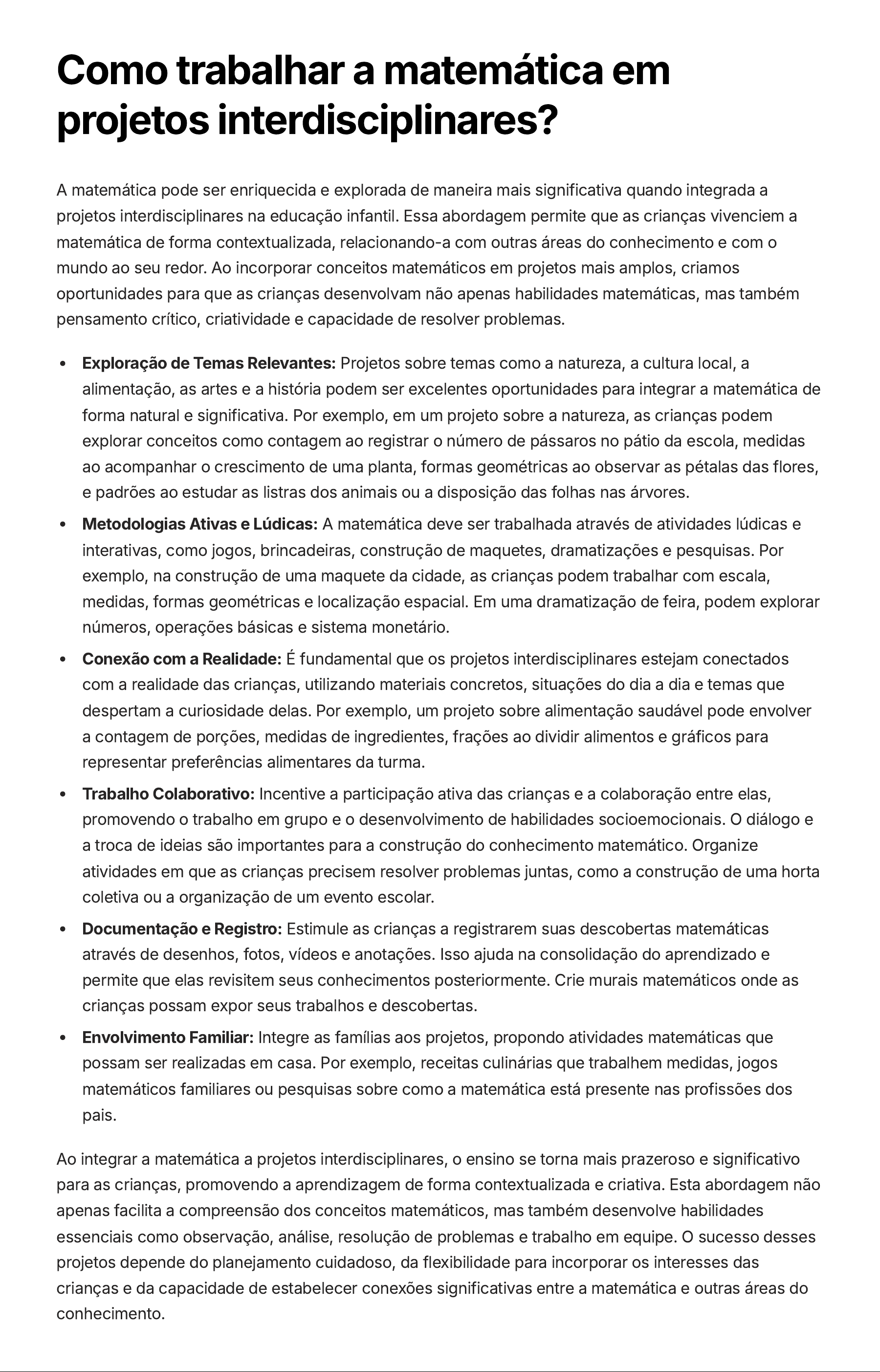 Como trabalhar a matemática em projetos interdisciplinares? A matemática pode ser enriquecida e explorada de maneira mais significativa quando integrada a projetos interdisciplinares na educação infantil. Essa abordagem permite que as crianças vivenciem a matemática de forma contextualizada, relacionando-a com outras áreas do conhecimento e com o mundo ao seu redor. Ao incorporar conceitos matemáticos em projetos mais amplos, criamos oportunidades para que as crianças desenvolvam não apenas habilidades matemáticas, mas também pensamento crítico, criatividade e capacidade de resolver problemas. Exploração de Temas Relevantes: Projetos sobre temas como a natureza, a cultura local, a alimentação, as artes e a história podem ser excelentes oportunidades para integrar a matemática de forma natural e significativa. Por exemplo, em um projeto sobre a natureza, as crianças podem explorar conceitos como contagem ao registrar o número de pássaros no pátio da escola, medidas ao acompanhar o crescimento de uma planta, formas geométricas ao observar as pétalas das flores, e padrões ao estudar as listras dos animais ou a disposição das folhas nas árvores. Metodologias Ativas e Lúdicas: A matemática deve ser trabalhada através de atividades lúdicas e interativas, como jogos, brincadeiras, construção de maquetes, dramatizações e pesquisas. Por exemplo, na construção de uma maquete da cidade, as crianças podem trabalhar com escala, medidas, formas geométricas e localização espacial. Em uma dramatização de feira, podem explorar números, operações básicas e sistema monetário. Conexão com a Realidade: É fundamental que os projetos interdisciplinares estejam conectados com a realidade das crianças, utilizando materiais concretos, situações do dia a dia e temas que despertam a curiosidade delas. Por exemplo, um projeto sobre alimentação saudável pode envolver a contagem de porções, medidas de ingredientes, frações ao dividir alimentos e gráficos para representar preferências alimentares da turma. Trabalho Colaborativo: Incentive a participação ativa das crianças e a colaboração entre elas, promovendo o trabalho em grupo e o desenvolvimento de habilidades socioemocionais. O diálogo e a troca de ideias são importantes para a construção do conhecimento matemático. Organize atividades em que as crianças precisem resolver problemas juntas, como a construção de uma horta coletiva ou a organização de um evento escolar. Documentação e Registro: Estimule as crianças a registrarem suas descobertas matemáticas através de desenhos, fotos, vídeos e anotações. Isso ajuda na consolidação do aprendizado e permite que elas revisitem seus conhecimentos posteriormente. Crie murais matemáticos onde as crianças possam expor seus trabalhos e descobertas. Envolvimento Familiar: Integre as famílias aos projetos, propondo atividades matemáticas que possam ser realizadas em casa. Por exemplo, receitas culinárias que trabalhem medidas, jogos matemáticos familiares ou pesquisas sobre como a matemática está presente nas profissões dos pais. Ao integrar a matemática a projetos interdisciplinares, o ensino se torna mais prazeroso e significativo para as crianças, promovendo a aprendizagem de forma contextualizada e criativa. Esta abordagem não apenas facilita a compreensão dos conceitos matemáticos, mas também desenvolve habilidades essenciais como observação, análise, resolução de problemas e trabalho em equipe. O sucesso desses projetos depende do planejamento cuidadoso, da flexibilidade para incorporar os interesses das crianças e da capacidade de estabelecer conexões significativas entre a matemática e outras áreas do conhecimento.