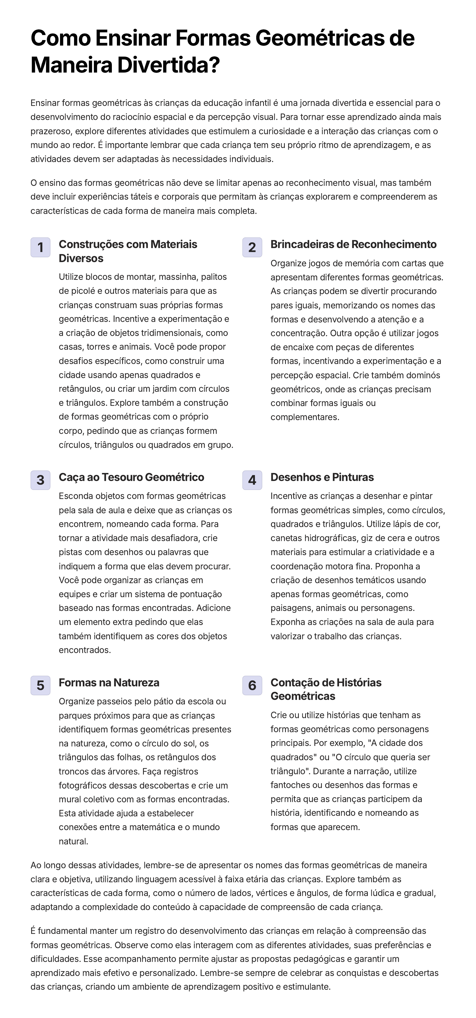 Como Ensinar Formas Geométricas de Maneira Divertida? Ensinar formas geométricas às crianças da educação infantil é uma jornada divertida e essencial para o desenvolvimento do raciocínio espacial e da percepção visual. Para tornar esse aprendizado ainda mais prazeroso, explore diferentes atividades que estimulem a curiosidade e a interação das crianças com o mundo ao redor. É importante lembrar que cada criança tem seu próprio ritmo de aprendizagem, e as atividades devem ser adaptadas às necessidades individuais. O ensino das formas geométricas não deve se limitar apenas ao reconhecimento visual, mas também deve incluir experiências táteis e corporais que permitam às crianças explorarem e compreenderem as características de cada forma de maneira mais completa. 1 Construções com Materiais Diversos Utilize blocos de montar, massinha, palitos de picolé e outros materiais para que as crianças construam suas próprias formas geométricas. Incentive a experimentação e a criação de objetos tridimensionais, como casas, torres e animais. Você pode propor desafios específicos, como construir uma cidade usando apenas quadrados e retângulos, ou criar um jardim com círculos e triângulos. Explore também a construção de formas geométricas com o próprio corpo, pedindo que as crianças formem círculos, triângulos ou quadrados em grupo. 2 Brincadeiras de Reconhecimento Organize jogos de memória com cartas que apresentam diferentes formas geométricas. As crianças podem se divertir procurando pares iguais, memorizando os nomes das formas e desenvolvendo a atenção e a concentração. Outra opção é utilizar jogos de encaixe com peças de diferentes formas, incentivando a experimentação e a percepção espacial. Crie também dominós geométricos, onde as crianças precisam combinar formas iguais ou complementares. 3 Caça ao Tesouro Geométrico Esconda objetos com formas geométricas pela sala de aula e deixe que as crianças os encontrem, nomeando cada forma. Para tornar a atividade mais desafiadora, crie pistas com desenhos ou palavras que indiquem a forma que elas devem procurar. Você pode organizar as crianças em equipes e criar um sistema de pontuação baseado nas formas encontradas. Adicione um elemento extra pedindo que elas também identifiquem as cores dos objetos encontrados. 4 Desenhos e Pinturas Incentive as crianças a desenhar e pintar formas geométricas simples, como círculos, quadrados e triângulos. Utilize lápis de cor, canetas hidrográficas, giz de cera e outros materiais para estimular a criatividade e a coordenação motora fina. Proponha a criação de desenhos temáticos usando apenas formas geométricas, como paisagens, animais ou personagens. Exponha as criações na sala de aula para valorizar o trabalho das crianças. 5 Formas na Natureza Organize passeios pelo pátio da escola ou parques próximos para que as crianças identifiquem formas geométricas presentes na natureza, como o círculo do sol, os triângulos das folhas, os retângulos dos troncos das árvores. Faça registros fotográficos dessas descobertas e crie um mural coletivo com as formas encontradas. Esta atividade ajuda a estabelecer conexões entre a matemática e o mundo natural. 6 Contação de Histórias Geométricas Crie ou utilize histórias que tenham as formas geométricas como personagens principais. Por exemplo, "A cidade dos quadrados" ou "O círculo que queria ser triângulo". Durante a narração, utilize fantoches ou desenhos das formas e permita que as crianças participem da história, identificando e nomeando as formas que aparecem. Ao longo dessas atividades, lembre-se de apresentar os nomes das formas geométricas de maneira clara e objetiva, utilizando linguagem acessível à faixa etária das crianças. Explore também as características de cada forma, como o número de lados, vértices e ângulos, de forma lúdica e gradual, adaptando a complexidade do conteúdo à capacidade de compreensão de cada criança. É fundamental manter um registro do desenvolvimento das crianças em relação à compreensão das formas geométricas. Observe como elas interagem com as diferentes atividades, suas preferências e dificuldades. Esse acompanhamento permite ajustar as propostas pedagógicas e garantir um aprendizado mais efetivo e personalizado. Lembre-se sempre de celebrar as conquistas e descobertas das crianças, criando um ambiente de aprendizagem positivo e estimulante.