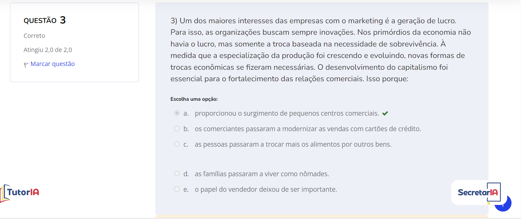 3 3) Um dos maiores interesses das empresas com o marketing é a geração de lucro. Para isso, as organizações buscam sempre inovações. Nos primórdios da economia não havia o lucro, mas somente a troca baseada na necessidade de sobrevivência. À e 2,0 medida que a especialização da produção foi crescendo e evoluindo, novas formas de estão trocas econômicas se fizeram necessárias. O desenvolvimento do capitalismo foi essencial para o fortalecimento das relações comerciais. Isso porque: Escolha uma opção: a. proporcionou o surgimento de pequenos centros comerciais. b. os comerciantes passaram a modernizar as vendas com cartões de crédito. C. as pessoas passaram a trocar mais os alimentos por outros bens. d. as famílias passaram a viver como nômades. e. o papel do vendedor deixou de ser importante.