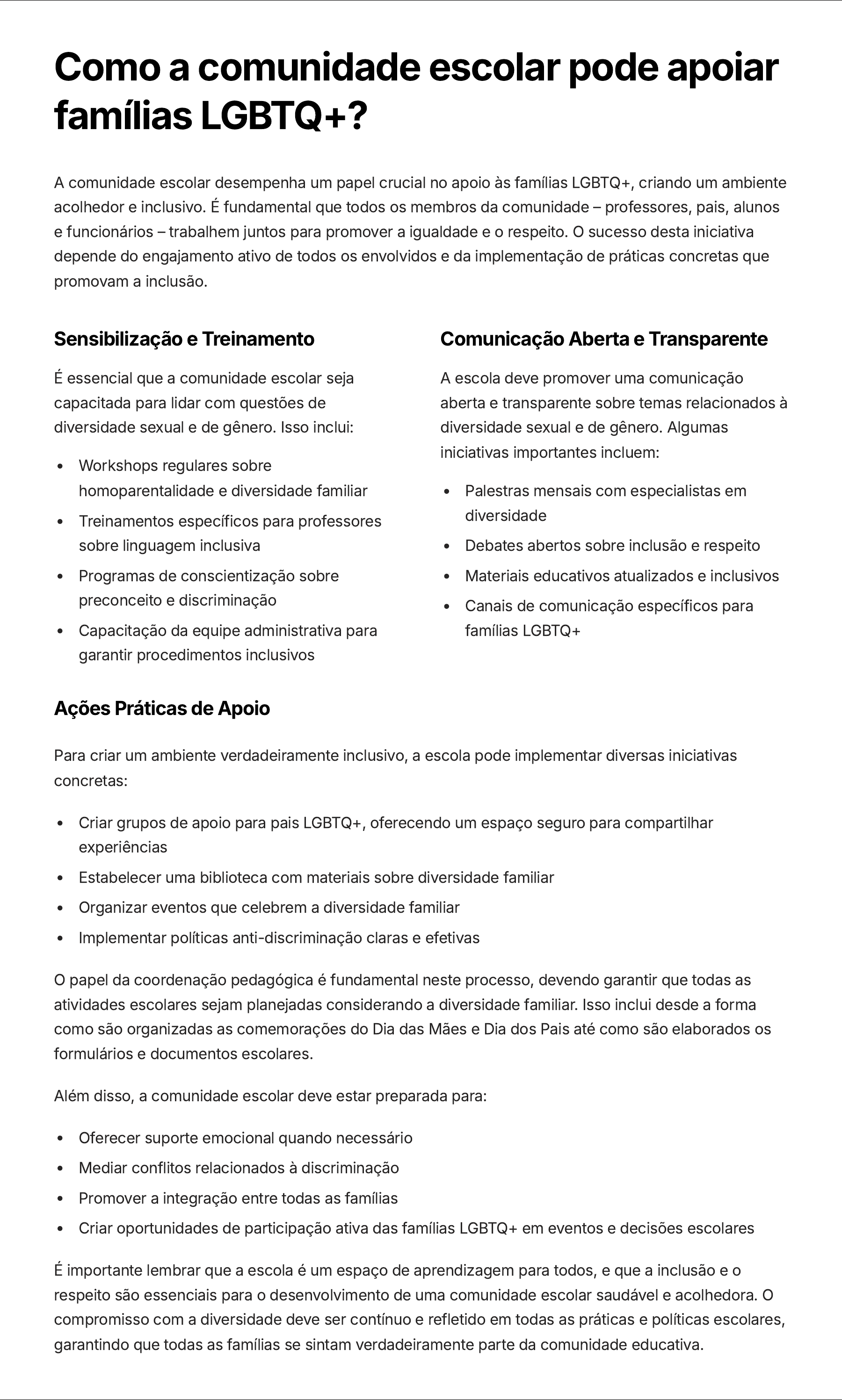 Como a comunidade escolar pode apoiar famílias LGBTQ+? A comunidade escolar desempenha um papel crucial no apoio às famílias LGBTQ+, criando um ambiente acolhedor e inclusivo. É fundamental que todos os membros da comunidade – professores, pais, alunos e funcionários – trabalhem juntos para promover a igualdade e o respeito. O sucesso desta iniciativa depende do engajamento ativo de todos os envolvidos e da implementação de práticas concretas que promovam a inclusão. Sensibilização e Treinamento É essencial que a comunidade escolar seja capacitada para lidar com questões de diversidade sexual e de gênero. Isso inclui: Workshops regulares sobre homoparentalidade e diversidade familiar Treinamentos específicos para professores sobre linguagem inclusiva Programas de conscientização sobre preconceito e discriminação Capacitação da equipe administrativa para garantir procedimentos inclusivos Comunicação Aberta e Transparente A escola deve promover uma comunicação aberta e transparente sobre temas relacionados à diversidade sexual e de gênero. Algumas iniciativas importantes incluem: Palestras mensais com especialistas em diversidade Debates abertos sobre inclusão e respeito Materiais educativos atualizados e inclusivos Canais de comunicação específicos para famílias LGBTQ+ Ações Práticas de Apoio Para criar um ambiente verdadeiramente inclusivo, a escola pode implementar diversas iniciativas concretas: Criar grupos de apoio para pais LGBTQ+, oferecendo um espaço seguro para compartilhar experiências Estabelecer uma biblioteca com materiais sobre diversidade familiar Organizar eventos que celebrem a diversidade familiar Implementar políticas anti-discriminação claras e efetivas O papel da coordenação pedagógica é fundamental neste processo, devendo garantir que todas as atividades escolares sejam planejadas considerando a diversidade familiar. Isso inclui desde a forma como são organizadas as comemorações do Dia das Mães e Dia dos Pais até como são elaborados os formulários e documentos escolares. Além disso, a comunidade escolar deve estar preparada para: Oferecer suporte emocional quando necessário Mediar conflitos relacionados à discriminação Promover a integração entre todas as famílias Criar oportunidades de participação ativa das famílias LGBTQ+ em eventos e decisões escolares É importante lembrar que a escola é um espaço de aprendizagem para todos, e que a inclusão e o respeito são essenciais para o desenvolvimento de uma comunidade escolar saudável e acolhedora. O compromisso com a diversidade deve ser contínuo e refletido em todas as práticas e políticas escolares, garantindo que todas as famílias se sintam verdadeiramente parte da comunidade educativa.