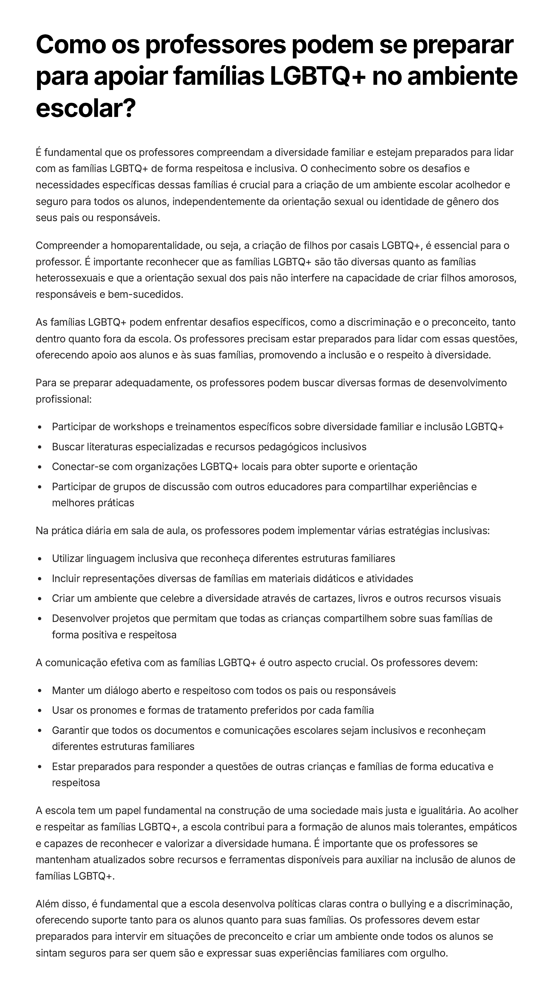 Como os professores podem se preparar para apoiar famílias LGBTQ+ no ambiente escolar? É fundamental que os professores compreendam a diversidade familiar e estejam preparados para lidar com as famílias LGBTQ+ de forma respeitosa e inclusiva. O conhecimento sobre os desafios e necessidades específicas dessas famílias é crucial para a criação de um ambiente escolar acolhedor e seguro para todos os alunos, independentemente da orientação sexual ou identidade de gênero dos seus pais ou responsáveis. Compreender a homoparentalidade, ou seja, a criação de filhos por casais LGBTQ+, é essencial para o professor. É importante reconhecer que as famílias LGBTQ+ são tão diversas quanto as famílias heterossexuais e que a orientação sexual dos pais não interfere na capacidade de criar filhos amorosos, responsáveis e bem-sucedidos. As famílias LGBTQ+ podem enfrentar desafios específicos, como a discriminação e o preconceito, tanto dentro quanto fora da escola. Os professores precisam estar preparados para lidar com essas questões, oferecendo apoio aos alunos e às suas famílias, promovendo a inclusão e o respeito à diversidade. Para se preparar adequadamente, os professores podem buscar diversas formas de desenvolvimento profissional: Participar de workshops e treinamentos específicos sobre diversidade familiar e inclusão LGBTQ+ Buscar literaturas especializadas e recursos pedagógicos inclusivos Conectar-se com organizações LGBTQ+ locais para obter suporte e orientação Participar de grupos de discussão com outros educadores para compartilhar experiências e melhores práticas Na prática diária em sala de aula, os professores podem implementar várias estratégias inclusivas: Utilizar linguagem inclusiva que reconheça diferentes estruturas familiares Incluir representações diversas de famílias em materiais didáticos e atividades Criar um ambiente que celebre a diversidade através de cartazes, livros e outros recursos visuais Desenvolver projetos que permitam que todas as crianças compartilhem sobre suas famílias de forma positiva e respeitosa A comunicação efetiva com as famílias LGBTQ+ é outro aspecto crucial. Os professores devem: Manter um diálogo aberto e respeitoso com todos os pais ou responsáveis Usar os pronomes e formas de tratamento preferidos por cada família Garantir que todos os documentos e comunicações escolares sejam inclusivos e reconheçam diferentes estruturas familiares Estar preparados para responder a questões de outras crianças e famílias de forma educativa e respeitosa A escola tem um papel fundamental na construção de uma sociedade mais justa e igualitária. Ao acolher e respeitar as famílias LGBTQ+, a escola contribui para a formação de alunos mais tolerantes, empáticos e capazes de reconhecer e valorizar a diversidade humana. É importante que os professores se mantenham atualizados sobre recursos e ferramentas disponíveis para auxiliar na inclusão de alunos de famílias LGBTQ+. Além disso, é fundamental que a escola desenvolva políticas claras contra o bullying e a discriminação, oferecendo suporte tanto para os alunos quanto para suas famílias. Os professores devem estar preparados para intervir em situações de preconceito e criar um ambiente onde todos os alunos se sintam seguros para ser quem são e expressar suas experiências familiares com orgulho.