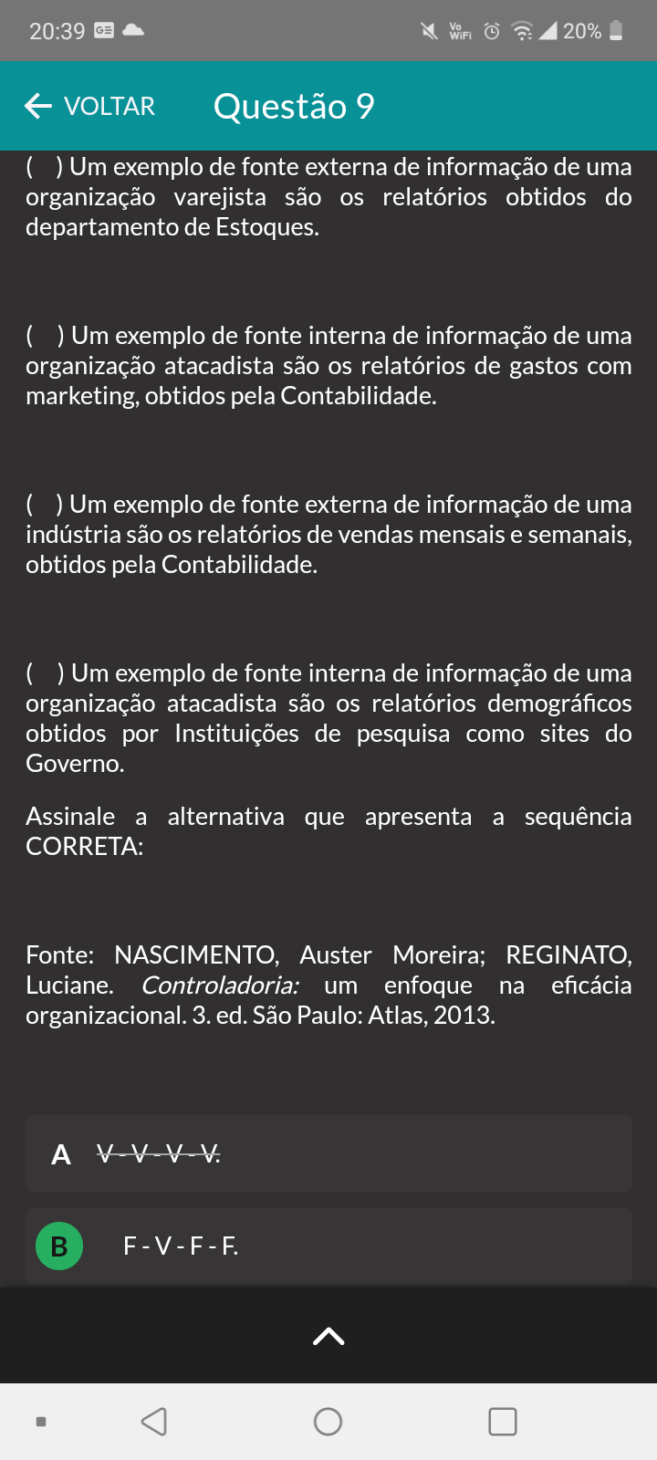20:39 GE Vo 20% VOLTAR Questão 9 ( ) Um exemplo de fonte externa de informação de uma organização varejista são os relatórios obtidos do departamento de Estoques. ( ) Um exemplo de fonte interna de informação de uma organização atacadista são os relatórios de gastos com marketing, obtidos pela Contabilidade. ( ) Um exemplo de fonte externa de informação de uma indústria são os relatórios de vendas mensais e semanais, obtidos pela Contabilidade. ( ) Um exemplo de fonte interna de informação de uma organização atacadista são os relatórios demográficos obtidos por Instituições de pesquisa como sites do Governo. Assinale a alternativa que apresenta a sequência CORRETA: Fonte: NASCIMENTO, Auster Moreira; REGINATO, Luciane. Controladoria: um enfoque na eficácia organizacional. 3. ed. São Paulo: Atlas, 2013. A