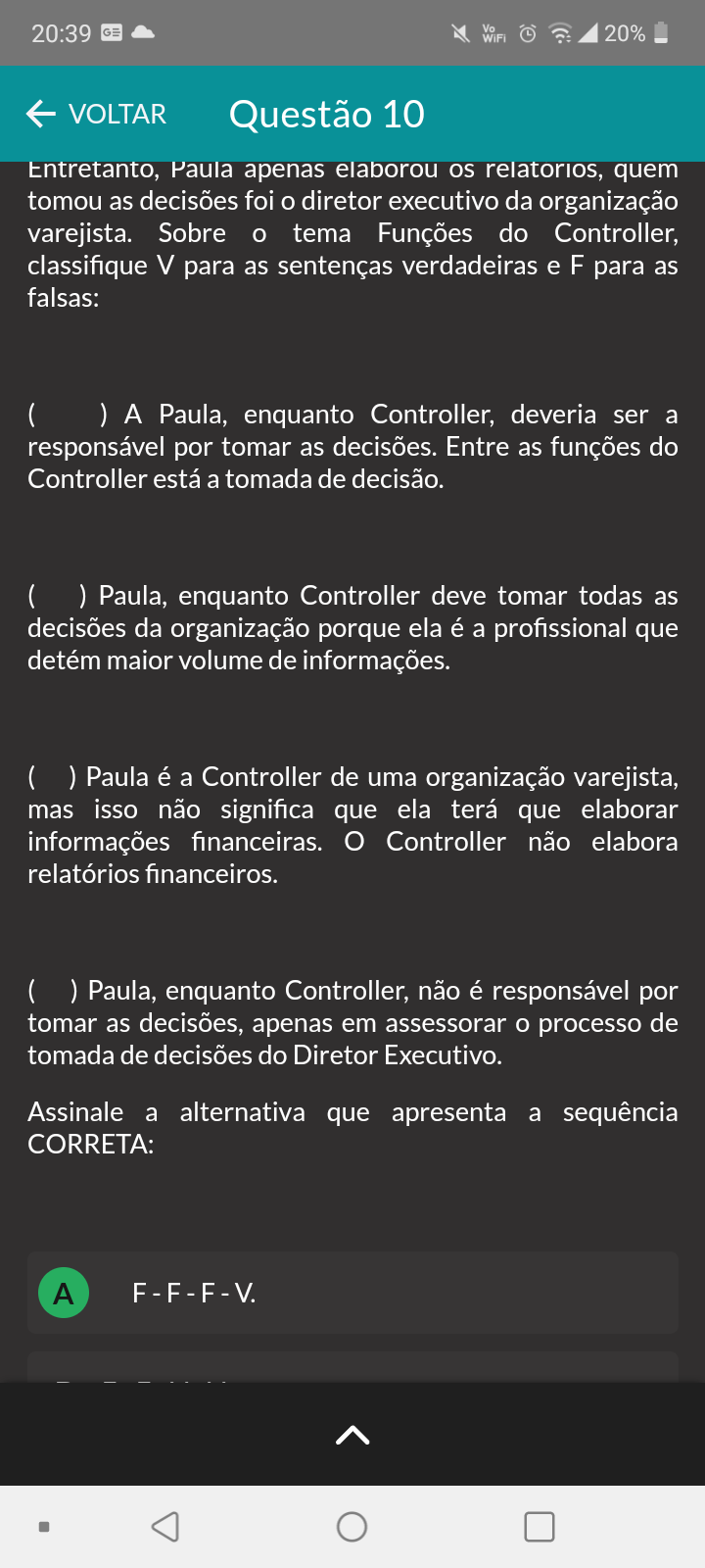 20:39 GE Vo WiFi 20% VOLTAR Questão 10 Entretanto, Paula apenas elaborou os relatorios, quem tomou as decisões foi diretor executivo da organização varejista. Sobre tema Funções do Controller, classifique V para as sentenças verdadeiras e F para as falsas: ( ) A Paula, enquanto Controller, deveria ser a responsável por tomar as decisões. Entre as funções do Controller está a tomada de decisão. ( ) Paula, enquanto Controller deve tomar todas as decisões da organização porque ela é a profissional que detém maior volume de informações. ( ) Paula é a Controller de uma organização varejista, mas isso não significa que ela terá que elaborar informações financeiras. O Controller não elabora relatórios financeiros. ( ) Paula, enquanto Controller, não é responsável por tomar as decisões, apenas em assessorar processo de tomada de decisões do Diretor Executivo. Assinale a alternativa que apresenta a sequência CORRETA: A