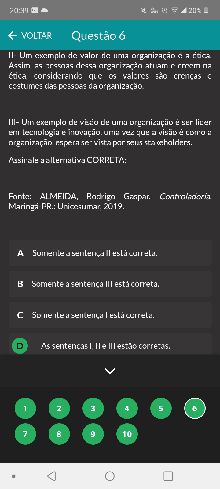 20:39 Vo WiFi 20% VOLTAR Questão 6 II- Um exemplo de valor de uma organização é a ética. Assim, as pessoas dessa organização atuam e creem na ética, considerando que os valores são crenças e costumes das pessoas da organização. III- Um exemplo de visão de uma organização é ser líder em tecnologia e inovação, uma vez que a visão é como a organização, espera ser vista por seus stakeholders. Assinale a alternativa CORRETA: Fonte: ALMEIDA, Rodrigo Gaspar. Controladoria. Maringá-PR.: Unicesumar, 2019. A Somente a sentença II está correta. B Somente a sentença correta. Somente a sentença correta. D As sentenças I, II e III estão corretas. 1 2 3 4 5 6 7 8 9 10