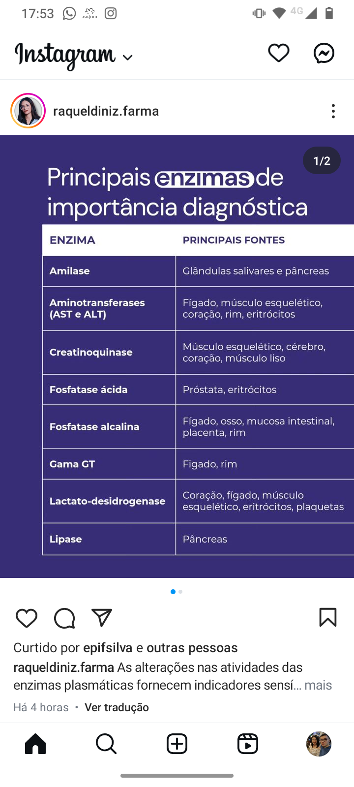 17:53 4G Instagram raqueldiniz.farma : 1/2 Principais enzimas de importância diagnóstica ENZIMA PRINCIPAIS FONTES Amilase Glândulas salivares e pâncreas Aminotransferases Fígado, músculo esquelético, (AST e ALT) coração, rim, eritrócitos Creatinoquinase Músculo esquelético, cérebro, coração, músculo liso Fosfatase ácida Próstata, eritrócitos Fosfatase alcalina Fígado, osso, mucosa intestinal, placenta, rim Gama GT Figado, rim Coração, fígado, músculo Lactato-desidrogenase esquelético, eritrócitos, plaquetas Lipase Pâncreas Curtido por epifsilva e outras pessoas raqueldiniz.farma As alterações nas atividades das enzimas plasmáticas fornecem indicadores mais Há 4 horas Ver tradução +
