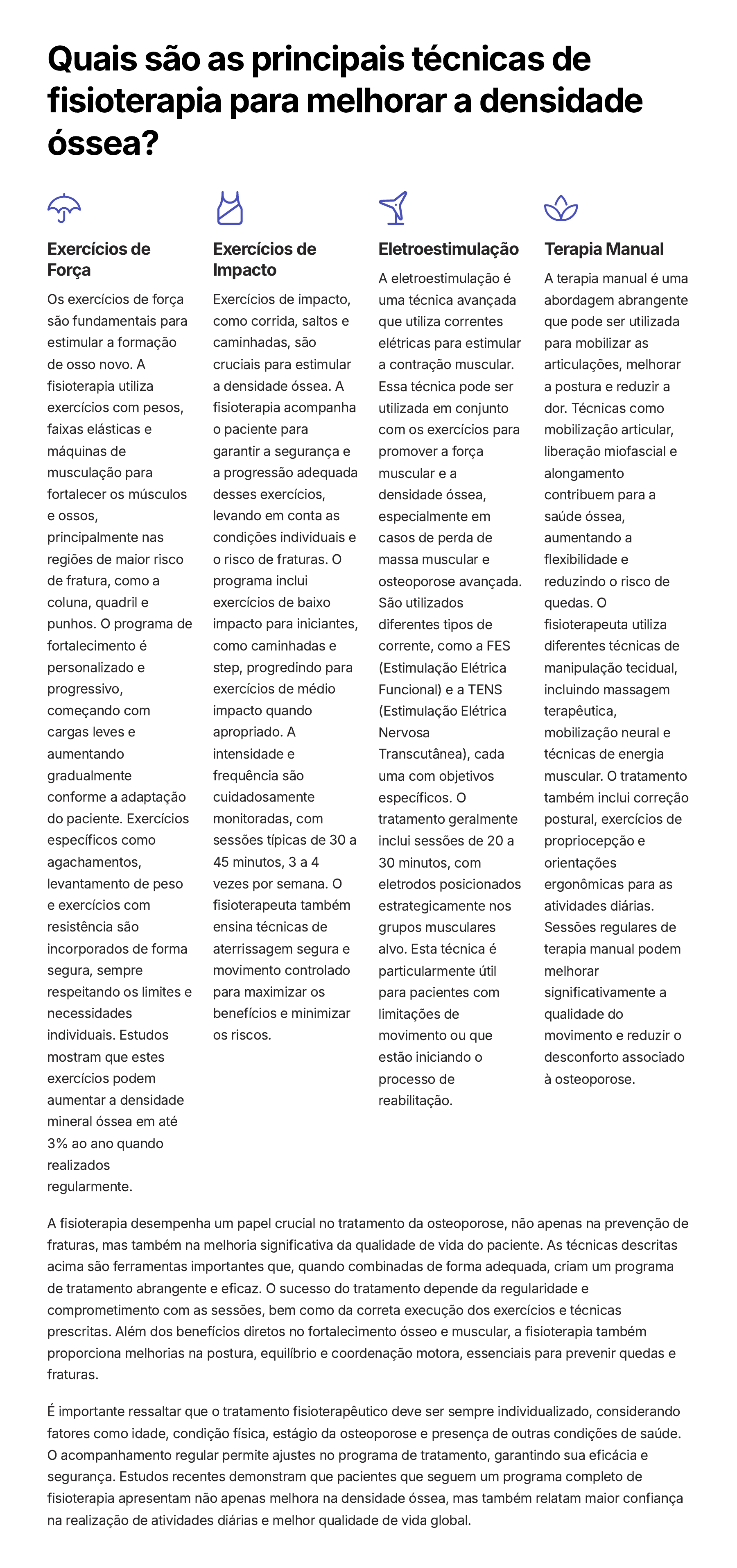 Quais são as principais técnicas de fisioterapia para melhorar a densidade óssea? Exercícios de Força Os exercícios de força são fundamentais para estimular a formação de osso novo. A fisioterapia utiliza exercícios com pesos, faixas elásticas e máquinas de musculação para fortalecer os músculos e ossos, principalmente nas regiões de maior risco de fratura, como a coluna, quadril e punhos. O programa de fortalecimento é personalizado e progressivo, começando com cargas leves e aumentando gradualmente conforme a adaptação do paciente. Exercícios específicos como agachamentos, levantamento de peso e exercícios com resistência são incorporados de forma segura, sempre respeitando os limites e necessidades individuais. Estudos mostram que estes exercícios podem aumentar a densidade mineral óssea em até 3% ao ano quando realizados regularmente. Exercícios de Impacto Exercícios de impacto, como corrida, saltos e caminhadas, são cruciais para estimular a densidade óssea. A fisioterapia acompanha o paciente para garantir a segurança e a progressão adequada desses exercícios, levando em conta as condições individuais e o risco de fraturas. O programa inclui exercícios de baixo impacto para iniciantes, como caminhadas e step, progredindo para exercícios de médio impacto quando apropriado. A intensidade e frequência são cuidadosamente monitoradas, com sessões típicas de 30 a 45 minutos, 3 a 4 vezes por semana. O fisioterapeuta também ensina técnicas de aterrissagem segura e movimento controlado para maximizar os benefícios e minimizar os riscos. Eletroestimulação A eletroestimulação é uma técnica avançada que utiliza correntes elétricas para estimular a contração muscular. Essa técnica pode ser utilizada em conjunto com os exercícios para promover a força muscular e a densidade óssea, especialmente em casos de perda de massa muscular e osteoporose avançada. São utilizados diferentes tipos de corrente, como a FES (Estimulação Elétrica Funcional) e a TENS (Estimulação Elétrica Nervosa Transcutânea), cada uma com objetivos específicos. O tratamento geralmente inclui sessões de 20 a 30 minutos, com eletrodos posicionados estrategicamente nos grupos musculares alvo. Esta técnica é particularmente útil para pacientes com limitações de movimento ou que estão iniciando o processo de reabilitação. Terapia Manual A terapia manual é uma abordagem abrangente que pode ser utilizada para mobilizar as articulações, melhorar a postura e reduzir a dor. Técnicas como mobilização articular, liberação miofascial e alongamento contribuem para a saúde óssea, aumentando a flexibilidade e reduzindo o risco de quedas. O fisioterapeuta utiliza diferentes técnicas de manipulação tecidual, incluindo massagem terapêutica, mobilização neural e técnicas de energia muscular. O tratamento também inclui correção postural, exercícios de propriocepção e orientações ergonômicas para as atividades diárias. Sessões regulares de terapia manual podem melhorar significativamente a qualidade do movimento e reduzir o desconforto associado à osteoporose. A fisioterapia desempenha um papel crucial no tratamento da osteoporose, não apenas na prevenção de fraturas, mas também na melhoria significativa da qualidade de vida do paciente. As técnicas descritas acima são ferramentas importantes que, quando combinadas de forma adequada, criam um programa de tratamento abrangente e eficaz. O sucesso do tratamento depende da regularidade e comprometimento com as sessões, bem como da correta execução dos exercícios e técnicas prescritas. Além dos benefícios diretos no fortalecimento ósseo e muscular, a fisioterapia também proporciona melhorias na postura, equilíbrio e coordenação motora, essenciais para prevenir quedas e fraturas. É importante ressaltar que o tratamento fisioterapêutico deve ser sempre individualizado, considerando fatores como idade, condição física, estágio da osteoporose e presença de outras condições de saúde. O acompanhamento regular permite ajustes no programa de tratamento, garantindo sua eficácia e segurança. Estudos recentes demonstram que pacientes que seguem um programa completo de fisioterapia apresentam não apenas melhora na densidade óssea, mas também relatam maior confiança na realização de atividades diárias e melhor qualidade de vida global.