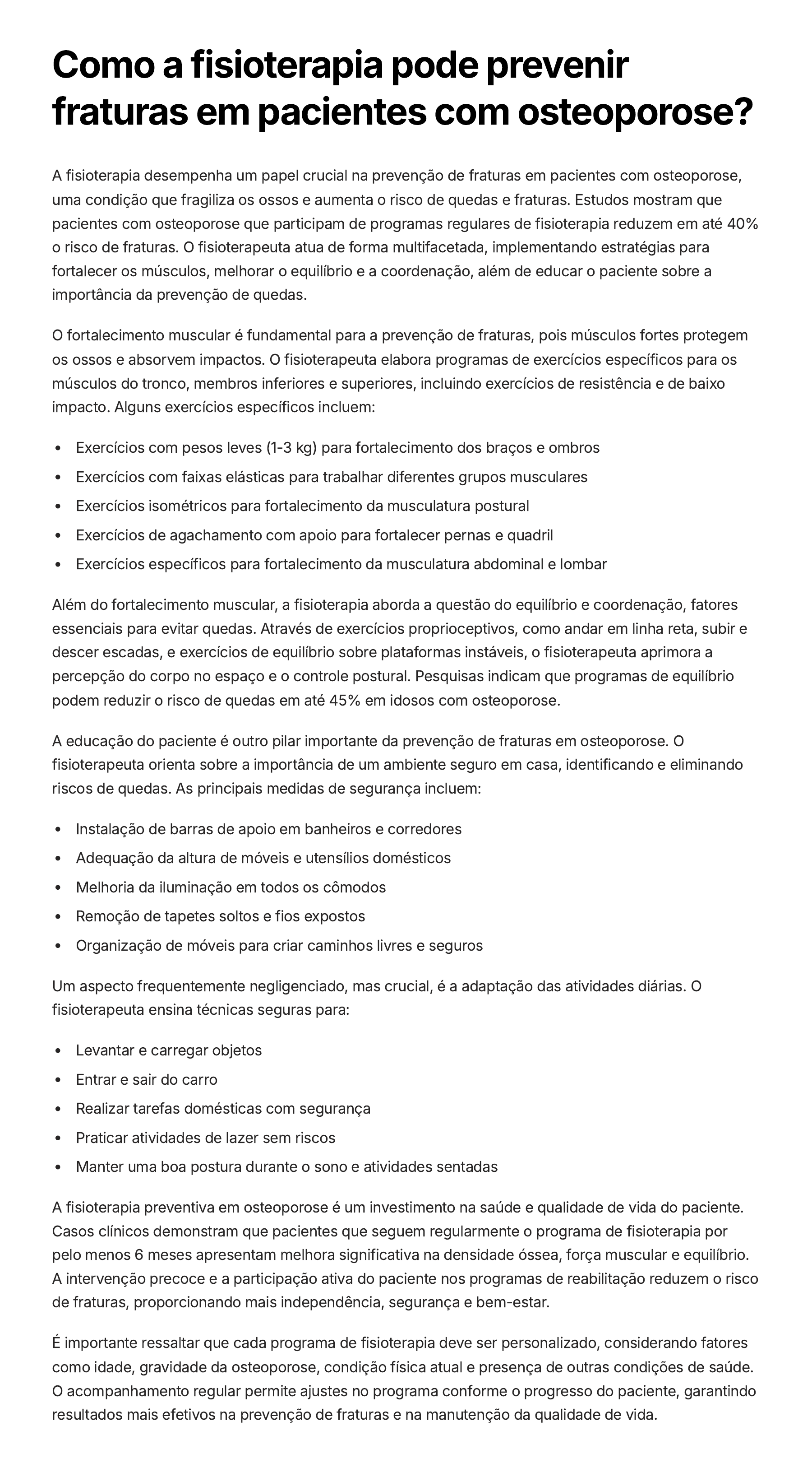 Como a fisioterapia pode prevenir fraturas em pacientes com osteoporose? A fisioterapia desempenha um papel crucial na prevenção de fraturas em pacientes com osteoporose, uma condição que fragiliza os ossos e aumenta o risco de quedas e fraturas. Estudos mostram que pacientes com osteoporose que participam de programas regulares de fisioterapia reduzem em até 40% o risco de fraturas. O fisioterapeuta atua de forma multifacetada, implementando estratégias para fortalecer os músculos, melhorar o equilíbrio e a coordenação, além de educar o paciente sobre a importância da prevenção de quedas. O fortalecimento muscular é fundamental para a prevenção de fraturas, pois músculos fortes protegem os ossos e absorvem impactos. O fisioterapeuta elabora programas de exercícios específicos para os músculos do tronco, membros inferiores e superiores, incluindo exercícios de resistência e de baixo impacto. Alguns exercícios específicos incluem: Exercícios com pesos leves (1-3 kg) para fortalecimento dos braços e ombros Exercícios com faixas elásticas para trabalhar diferentes grupos musculares Exercícios isométricos para fortalecimento da musculatura postural Exercícios de agachamento com apoio para fortalecer pernas e quadril Exercícios específicos para fortalecimento da musculatura abdominal e lombar Além do fortalecimento muscular, a fisioterapia aborda a questão do equilíbrio e coordenação, fatores essenciais para evitar quedas. Através de exercícios proprioceptivos, como andar em linha reta, subir e descer escadas, e exercícios de equilíbrio sobre plataformas instáveis, o fisioterapeuta aprimora a percepção do corpo no espaço e o controle postural. Pesquisas indicam que programas de equilíbrio podem reduzir o risco de quedas em até 45% em idosos com osteoporose. A educação do paciente é outro pilar importante da prevenção de fraturas em osteoporose. O fisioterapeuta orienta sobre a importância de um ambiente seguro em casa, identificando e eliminando riscos de quedas. As principais medidas de segurança incluem: Instalação de barras de apoio em banheiros e corredores Adequação da altura de móveis e utensílios domésticos Melhoria da iluminação em todos os cômodos Remoção de tapetes soltos e fios expostos Organização de móveis para criar caminhos livres e seguros Um aspecto frequentemente negligenciado, mas crucial, é a adaptação das atividades diárias. O fisioterapeuta ensina técnicas seguras para: Levantar e carregar objetos Entrar e sair do carro Realizar tarefas domésticas com segurança Praticar atividades de lazer sem riscos Manter uma boa postura durante o sono e atividades sentadas A fisioterapia preventiva em osteoporose é um investimento na saúde e qualidade de vida do paciente. Casos clínicos demonstram que pacientes que seguem regularmente o programa de fisioterapia por pelo menos 6 meses apresentam melhora significativa na densidade óssea, força muscular e equilíbrio. A intervenção precoce e a participação ativa do paciente nos programas de reabilitação reduzem o risco de fraturas, proporcionando mais independência, segurança e bem-estar. É importante ressaltar que cada programa de fisioterapia deve ser personalizado, considerando fatores como idade, gravidade da osteoporose, condição física atual e presença de outras condições de saúde. O acompanhamento regular permite ajustes no programa conforme o progresso do paciente, garantindo resultados mais efetivos na prevenção de fraturas e na manutenção da qualidade de vida.