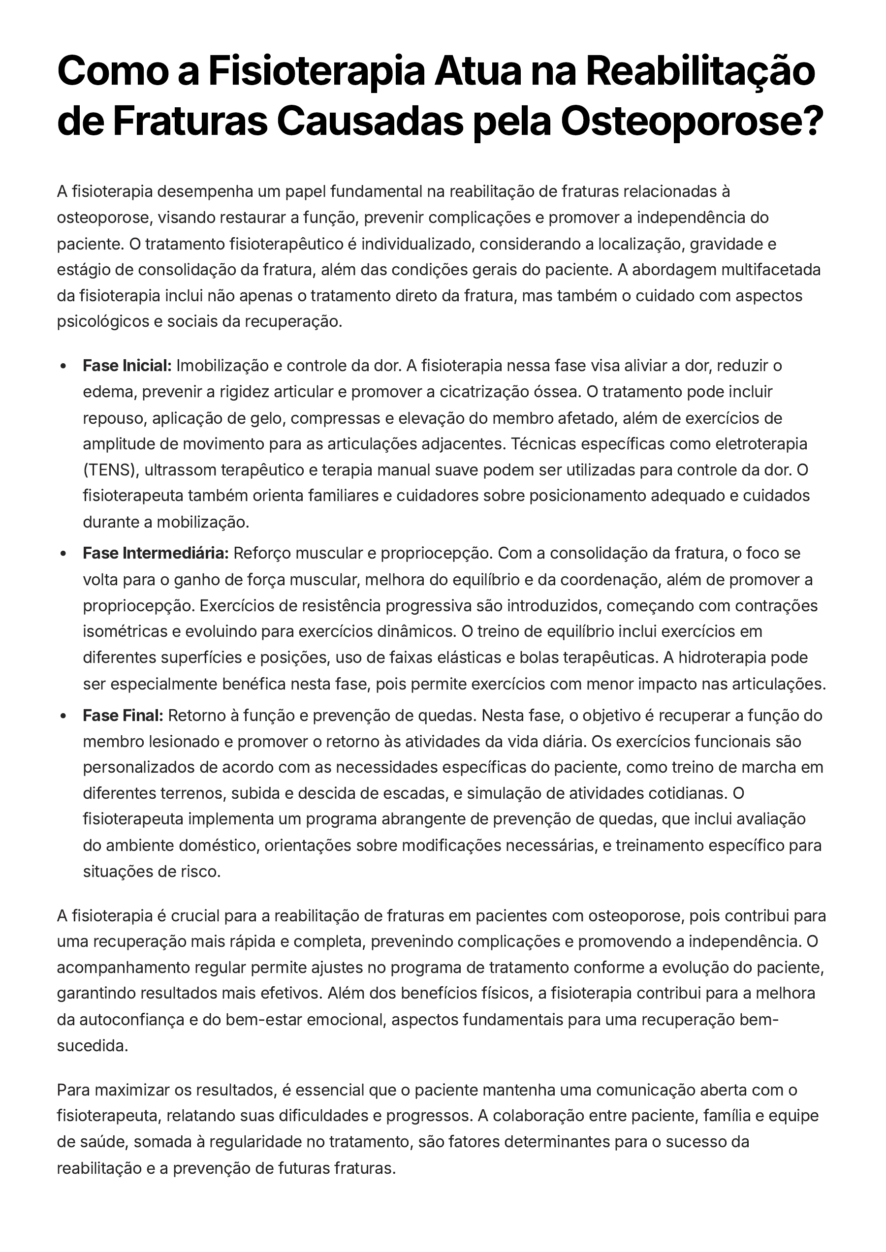 Como a Fisioterapia Atua na Reabilitação de Fraturas Causadas pela Osteoporose? A fisioterapia desempenha um papel fundamental na reabilitação de fraturas relacionadas à osteoporose, visando restaurar a função, prevenir complicações e promover a independência do paciente. O tratamento fisioterapêutico é individualizado, considerando a localização, gravidade e estágio de consolidação da fratura, além das condições gerais do paciente. A abordagem multifacetada da fisioterapia inclui não apenas o tratamento direto da fratura, mas também o cuidado com aspectos psicológicos e sociais da recuperação. Fase Inicial: Imobilização e controle da dor. A fisioterapia nessa fase visa aliviar a dor, reduzir o edema, prevenir a rigidez articular e promover a cicatrização óssea. O tratamento pode incluir repouso, aplicação de gelo, compressas e elevação do membro afetado, além de exercícios de amplitude de movimento para as articulações adjacentes. Técnicas específicas como eletroterapia (TENS), ultrassom terapêutico e terapia manual suave podem ser utilizadas para controle da dor. O fisioterapeuta também orienta familiares e cuidadores sobre posicionamento adequado e cuidados durante a mobilização. Fase Intermediária: Reforço muscular e propriocepção. Com a consolidação da fratura, o foco se volta para o ganho de força muscular, melhora do equilíbrio e da coordenação, além de promover a propriocepção. Exercícios de resistência progressiva são introduzidos, começando com contrações isométricas e evoluindo para exercícios dinâmicos. O treino de equilíbrio inclui exercícios em diferentes superfícies e posições, uso de faixas elásticas e bolas terapêuticas. A hidroterapia pode ser especialmente benéfica nesta fase, pois permite exercícios com menor impacto nas articulações. Fase Final: Retorno à função e prevenção de quedas. Nesta fase, o objetivo é recuperar a função do membro lesionado e promover o retorno às atividades da vida diária. Os exercícios funcionais são personalizados de acordo com as necessidades específicas do paciente, como treino de marcha em diferentes terrenos, subida e descida de escadas, e simulação de atividades cotidianas. O fisioterapeuta implementa um programa abrangente de prevenção de quedas, que inclui avaliação do ambiente doméstico, orientações sobre modificações necessárias, e treinamento específico para situações de risco. A fisioterapia é crucial para a reabilitação de fraturas em pacientes com osteoporose, pois contribui para uma recuperação mais rápida e completa, prevenindo complicações e promovendo a independência. O acompanhamento regular permite ajustes no programa de tratamento conforme a evolução do paciente, garantindo resultados mais efetivos. Além dos benefícios físicos, a fisioterapia contribui para a melhora da autoconfiança e do bem-estar emocional, aspectos fundamentais para uma recuperação bem- sucedida. Para maximizar os resultados, é essencial que o paciente mantenha uma comunicação aberta com o fisioterapeuta, relatando suas dificuldades e progressos. A colaboração entre paciente, família e equipe de saúde, somada à regularidade no tratamento, são fatores determinantes para o sucesso da reabilitação e a prevenção de futuras fraturas.