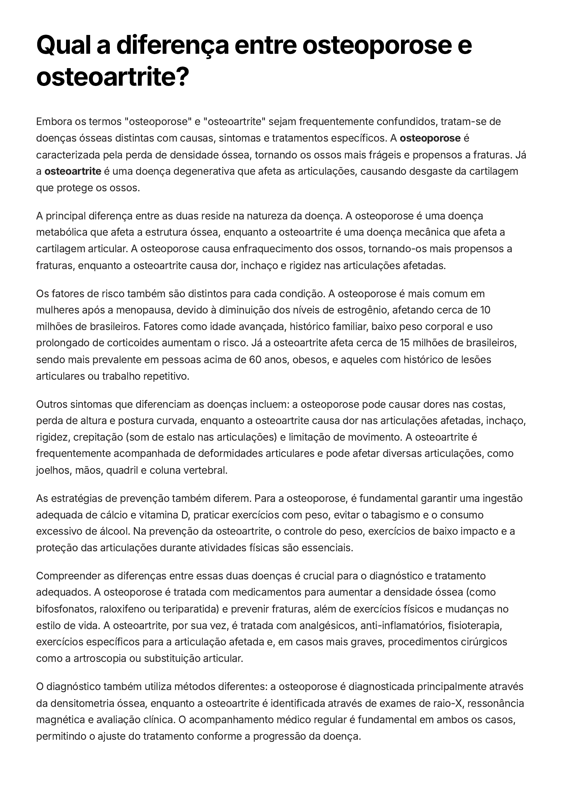 Qual a diferença entre osteoporose e osteoartrite? Embora os termos "osteoporose" e "osteoartrite" sejam frequentemente confundidos, tratam-se de doenças ósseas distintas com causas, sintomas e tratamentos específicos. A osteoporose é caracterizada pela perda de densidade óssea, tornando os ossos mais frágeis e propensos a fraturas. Já a osteoartrite é uma doença degenerativa que afeta as articulações, causando desgaste da cartilagem que protege os ossos. A principal diferença entre as duas reside na natureza da doença. A osteoporose é uma doença metabólica que afeta a estrutura óssea, enquanto a osteoartrite é uma doença mecânica que afeta a cartilagem articular. A osteoporose causa enfraquecimento dos ossos, tornando-os mais propensos a fraturas, enquanto a osteoartrite causa dor, inchaço e rigidez nas articulações afetadas. Os fatores de risco também são distintos para cada condição. A osteoporose é mais comum em mulheres após a menopausa, devido à diminuição dos níveis de estrogênio, afetando cerca de 10 milhões de brasileiros. Fatores como idade avançada, histórico familiar, baixo peso corporal e uso prolongado de corticoides aumentam o risco. Já a osteoartrite afeta cerca de 15 milhões de brasileiros, sendo mais prevalente em pessoas acima de 60 anos, obesos, e aqueles com histórico de lesões articulares ou trabalho repetitivo. Outros sintomas que diferenciam as doenças incluem: a osteoporose pode causar dores nas costas, perda de altura e postura curvada, enquanto a osteoartrite causa dor nas articulações afetadas, inchaço, rigidez, crepitação (som de estalo nas articulações) e limitação de movimento. A osteoartrite é frequentemente acompanhada de deformidades articulares e pode afetar diversas articulações, como joelhos, mãos, quadril e coluna vertebral. As estratégias de prevenção também diferem. Para a osteoporose, é fundamental garantir uma ingestão adequada de cálcio e vitamina D, praticar exercícios com peso, evitar o tabagismo e o consumo excessivo de álcool. Na prevenção da osteoartrite, o controle do peso, exercícios de baixo impacto e a proteção das articulações durante atividades físicas são essenciais. Compreender as diferenças entre essas duas doenças é crucial para o diagnóstico e tratamento adequados. A osteoporose é tratada com medicamentos para aumentar a densidade óssea (como bifosfonatos, raloxifeno ou teriparatida) e prevenir fraturas, além de exercícios físicos e mudanças no estilo de vida. A osteoartrite, por sua vez, é tratada com analgésicos, anti-inflamatórios, fisioterapia, exercícios específicos para a articulação afetada e, em casos mais graves, procedimentos cirúrgicos como a artroscopia ou substituição articular. O diagnóstico também utiliza métodos diferentes: a osteoporose é diagnosticada principalmente através da densitometria óssea, enquanto a osteoartrite é identificada através de exames de raio-X, ressonância magnética e avaliação clínica. O acompanhamento médico regular é fundamental em ambos os casos, permitindo o ajuste do tratamento conforme a progressão da doença.