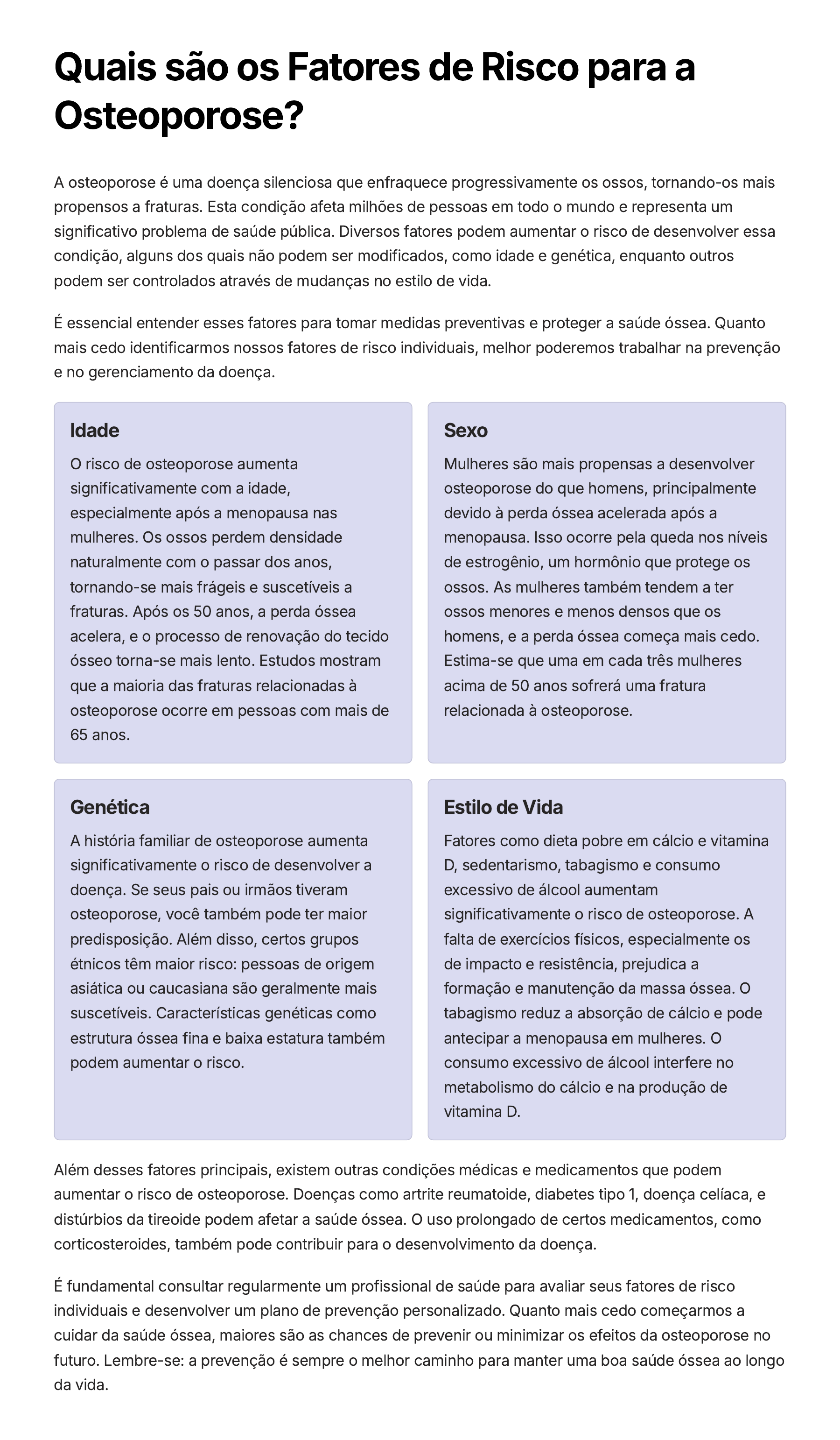 Quais são os Fatores de Risco para a Osteoporose? A osteoporose é uma doença silenciosa que enfraquece progressivamente os ossos, tornando-os mais propensos a fraturas. Esta condição afeta milhões de pessoas em todo o mundo e representa um significativo problema de saúde pública. Diversos fatores podem aumentar o risco de desenvolver essa condição, alguns dos quais não podem ser modificados, como idade e genética, enquanto outros podem ser controlados através de mudanças no estilo de vida. É essencial entender esses fatores para tomar medidas preventivas e proteger a saúde óssea. Quanto mais cedo identificarmos nossos fatores de risco individuais, melhor poderemos trabalhar na prevenção e no gerenciamento da doença. Idade O risco de osteoporose aumenta significativamente com a idade, especialmente após a menopausa nas mulheres. Os ossos perdem densidade naturalmente com o passar dos anos, tornando-se mais frágeis e suscetíveis a fraturas. Após os 50 anos, a perda óssea acelera, e o processo de renovação do tecido ósseo torna-se mais lento. Estudos mostram que a maioria das fraturas relacionadas à osteoporose ocorre em pessoas com mais de 65 anos. Sexo Mulheres são mais propensas a desenvolver osteoporose do que homens, principalmente devido à perda óssea acelerada após a menopausa. Isso ocorre pela queda nos níveis de estrogênio, um hormônio que protege os ossos. As mulheres também tendem a ter ossos menores e menos densos que os homens, e a perda óssea começa mais cedo. Estima-se que uma em cada três mulheres acima de 50 anos sofrerá uma fratura relacionada à osteoporose. Genética A história familiar de osteoporose aumenta significativamente o risco de desenvolver a doença. Se seus pais ou irmãos tiveram osteoporose, você também pode ter maior predisposição. Além disso, certos grupos étnicos têm maior risco: pessoas de origem asiática ou caucasiana são geralmente mais suscetíveis. Características genéticas como estrutura óssea fina e baixa estatura também podem aumentar o risco. Estilo de Vida Fatores como dieta pobre em cálcio e vitamina D, sedentarismo, tabagismo e consumo excessivo de álcool aumentam significativamente o risco de osteoporose. A falta de exercícios físicos, especialmente os de impacto e resistência, prejudica a formação e manutenção da massa óssea. O tabagismo reduz a absorção de cálcio e pode antecipar a menopausa em mulheres. O consumo excessivo de álcool interfere no metabolismo do cálcio e na produção de vitamina D. Além desses fatores principais, existem outras condições médicas e medicamentos que podem aumentar o risco de osteoporose. Doenças como artrite reumatoide, diabetes tipo 1, doença celíaca, e distúrbios da tireoide podem afetar a saúde óssea. O uso prolongado de certos medicamentos, como corticosteroides, também pode contribuir para o desenvolvimento da doença. É fundamental consultar regularmente um profissional de saúde para avaliar seus fatores de risco individuais e desenvolver um plano de prevenção personalizado. Quanto mais cedo começarmos a cuidar da saúde óssea, maiores são as chances de prevenir ou minimizar os efeitos da osteoporose no futuro. Lembre-se: a prevenção é sempre o melhor caminho para manter uma boa saúde óssea ao longo da vida.