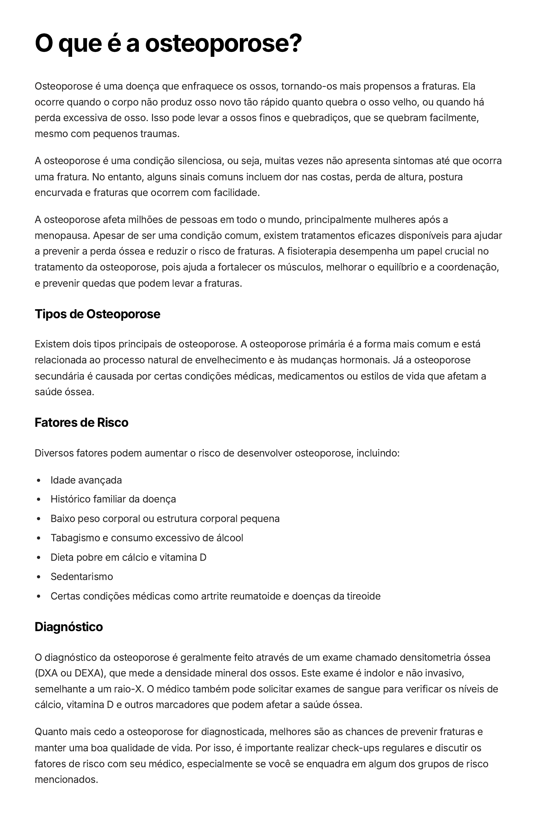 O que é a osteoporose? Osteoporose é uma doença que enfraquece os ossos, tornando-os mais propensos a fraturas. Ela ocorre quando o corpo não produz osso novo tão rápido quanto quebra o osso velho, ou quando há perda excessiva de osso. Isso pode levar a ossos finos e quebradiços, que se quebram facilmente, mesmo com pequenos traumas. A osteoporose é uma condição silenciosa, ou seja, muitas vezes não apresenta sintomas até que ocorra uma fratura. No entanto, alguns sinais comuns incluem dor nas costas, perda de altura, postura encurvada e fraturas que ocorrem com facilidade. A osteoporose afeta milhões de pessoas em todo o mundo, principalmente mulheres após a menopausa. Apesar de ser uma condição comum, existem tratamentos eficazes disponíveis para ajudar a prevenir a perda óssea e reduzir o risco de fraturas. A fisioterapia desempenha um papel crucial no tratamento da osteoporose, pois ajuda a fortalecer os músculos, melhorar o equilíbrio e a coordenação, e prevenir quedas que podem levar a fraturas. Tipos de Osteoporose Existem dois tipos principais de osteoporose. A osteoporose primária é a forma mais comum e está relacionada ao processo natural de envelhecimento e às mudanças hormonais. Já a osteoporose secundária é causada por certas condições médicas, medicamentos ou estilos de vida que afetam a saúde óssea. Fatores de Risco Diversos fatores podem aumentar o risco de desenvolver osteoporose, incluindo: Idade avançada Histórico familiar da doença Baixo peso corporal ou estrutura corporal pequena Tabagismo e consumo excessivo de álcool Dieta pobre em cálcio e vitamina D Sedentarismo Certas condições médicas como artrite reumatoide e doenças da tireoide Diagnóstico O diagnóstico da osteoporose é geralmente feito através de um exame chamado densitometria óssea (DXA ou DEXA), que mede a densidade mineral dos ossos. Este exame é indolor e não invasivo, semelhante a um raio-X. O médico também pode solicitar exames de sangue para verificar os níveis de cálcio, vitamina D e outros marcadores que podem afetar a saúde óssea. Quanto mais cedo a osteoporose for diagnosticada, melhores são as chances de prevenir fraturas e manter uma boa qualidade de vida. Por isso, é importante realizar check-ups regulares e discutir os fatores de risco com seu médico, especialmente se você se enquadra em algum dos grupos de risco mencionados.