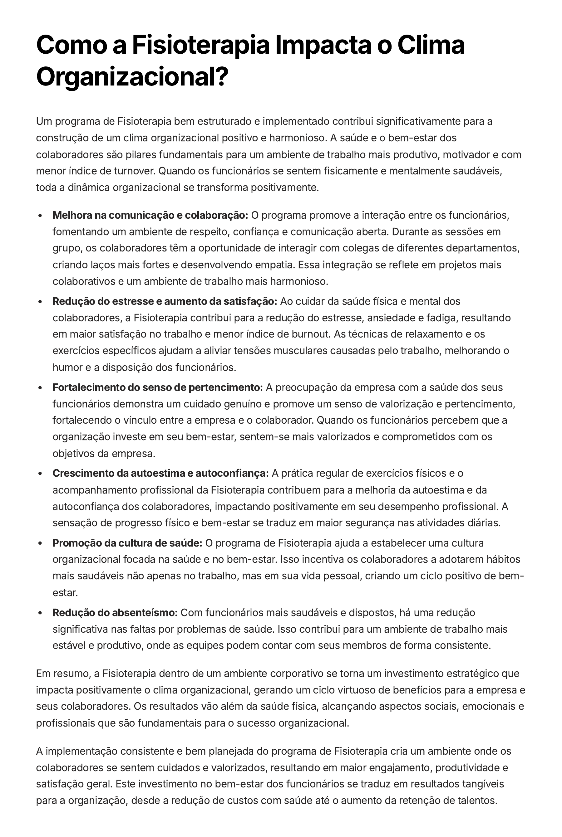 Como a Fisioterapia Impacta o Clima Organizacional? Um programa de Fisioterapia bem estruturado e implementado contribui significativamente para a construção de um clima organizacional positivo e harmonioso. A saúde e o bem-estar dos colaboradores são pilares fundamentais para um ambiente de trabalho mais produtivo, motivador e com menor índice de turnover. Quando os funcionários se sentem fisicamente e mentalmente saudáveis, toda a dinâmica organizacional se transforma positivamente. Melhora na comunicação e colaboração: O programa promove a interação entre os funcionários, fomentando um ambiente de respeito, confiança e comunicação aberta. Durante as sessões em grupo, os colaboradores têm a oportunidade de interagir com colegas de diferentes departamentos, criando laços mais fortes e desenvolvendo empatia. Essa integração se reflete em projetos mais colaborativos e um ambiente de trabalho mais harmonioso. Redução do estresse e aumento da satisfação: Ao cuidar da saúde física e mental dos colaboradores, a Fisioterapia contribui para a redução do estresse, ansiedade e fadiga, resultando em maior satisfação no trabalho e menor índice de burnout. As técnicas de relaxamento e os exercícios específicos ajudam a aliviar tensões musculares causadas pelo trabalho, melhorando o humor e a disposição dos funcionários. Fortalecimento do senso de pertencimento: A preocupação da empresa com a saúde dos seus funcionários demonstra um cuidado genuíno e promove um senso de valorização e pertencimento, fortalecendo o vínculo entre a empresa e o colaborador. Quando os funcionários percebem que a organização investe em seu bem-estar, sentem-se mais valorizados e comprometidos com os objetivos da empresa. Crescimento da autoestima e autoconfiança: A prática regular de exercícios físicos e o acompanhamento profissional da Fisioterapia contribuem para a melhoria da autoestima e da autoconfiança dos colaboradores, impactando positivamente em seu desempenho profissional. A sensação de progresso físico e bem-estar se traduz em maior segurança nas atividades diárias. Promoção da cultura de saúde: O programa de Fisioterapia ajuda a estabelecer uma cultura organizacional focada na saúde e no bem-estar. Isso incentiva os colaboradores a adotarem hábitos mais saudáveis não apenas no trabalho, mas em sua vida pessoal, criando um ciclo positivo de bem- estar. Redução do absenteísmo: Com funcionários mais saudáveis e dispostos, há uma redução significativa nas faltas por problemas de saúde. Isso contribui para um ambiente de trabalho mais estável e produtivo, onde as equipes podem contar com seus membros de forma consistente. Em resumo, a Fisioterapia dentro de um ambiente corporativo se torna um investimento estratégico que impacta positivamente o clima organizacional, gerando um ciclo virtuoso de benefícios para a empresa e seus colaboradores. Os resultados vão além da saúde física, alcançando aspectos sociais, emocionais e profissionais que são fundamentais para o sucesso organizacional. A implementação consistente e bem planejada do programa de Fisioterapia cria um ambiente onde os colaboradores se sentem cuidados e valorizados, resultando em maior engajamento, produtividade e satisfação geral. Este investimento no bem-estar dos funcionários se traduz em resultados tangíveis para a organização, desde a redução de custos com saúde até o aumento da retenção de talentos.