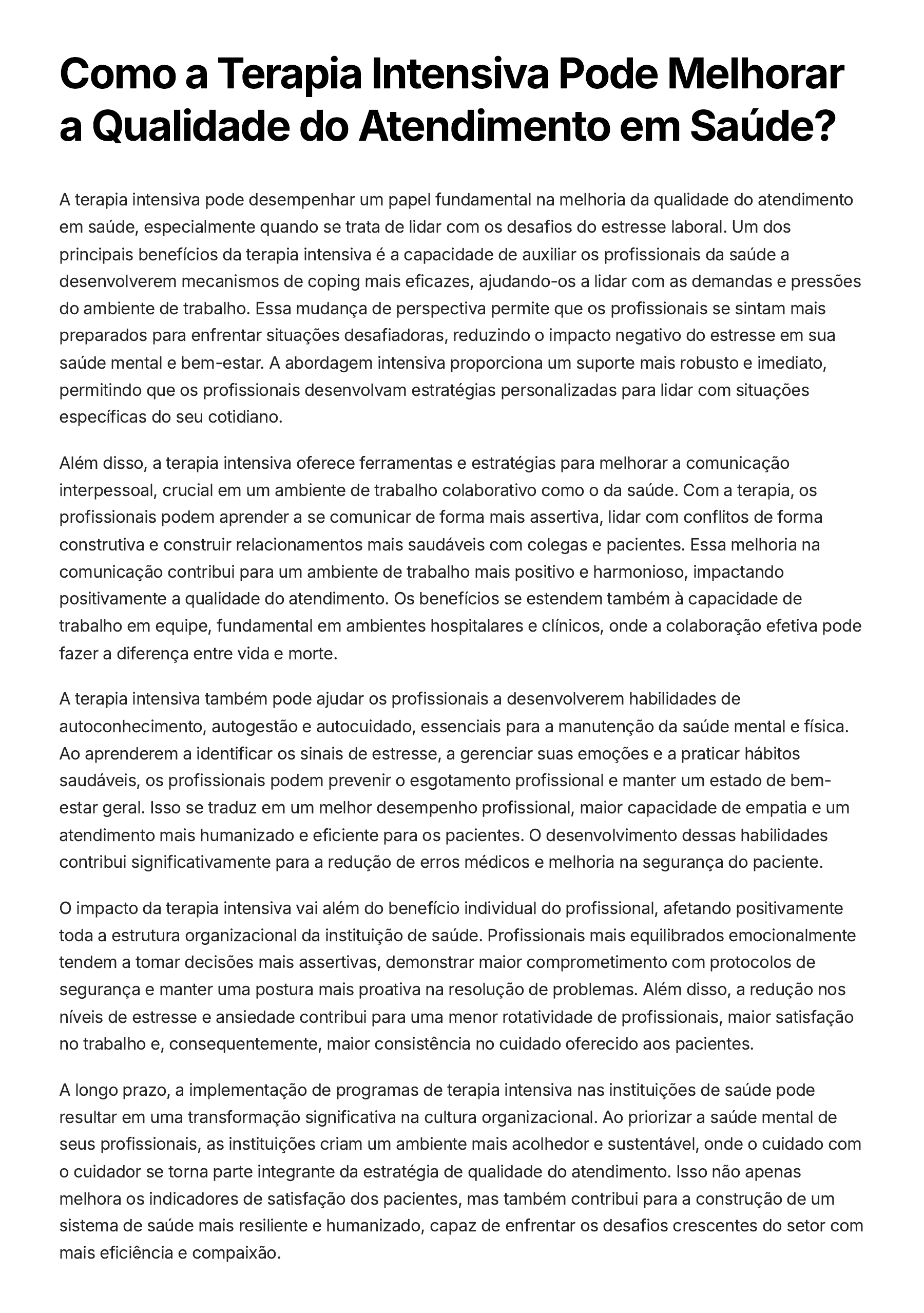 Como a Terapia Intensiva Pode Melhorar a Qualidade do Atendimento em Saúde? A terapia intensiva pode desempenhar um papel fundamental na melhoria da qualidade do atendimento em saúde, especialmente quando se trata de lidar com os desafios do estresse laboral. Um dos principais benefícios da terapia intensiva é a capacidade de auxiliar os profissionais da saúde a desenvolverem mecanismos de coping mais eficazes, ajudando-os a lidar com as demandas e pressões do ambiente de trabalho. Essa mudança de perspectiva permite que os profissionais se sintam mais preparados para enfrentar situações desafiadoras, reduzindo o impacto negativo do estresse em sua saúde mental e bem-estar. A abordagem intensiva proporciona um suporte mais robusto e imediato, permitindo que os profissionais desenvolvam estratégias personalizadas para lidar com situações específicas do seu cotidiano. Além disso, a terapia intensiva oferece ferramentas e estratégias para melhorar a comunicação interpessoal, crucial em um ambiente de trabalho colaborativo como o da saúde. Com a terapia, os profissionais podem aprender a se comunicar de forma mais assertiva, lidar com conflitos de forma construtiva e construir relacionamentos mais saudáveis com colegas e pacientes. Essa melhoria na comunicação contribui para um ambiente de trabalho mais positivo e harmonioso, impactando positivamente a qualidade do atendimento. Os benefícios se estendem também à capacidade de trabalho em equipe, fundamental em ambientes hospitalares e clínicos, onde a colaboração efetiva pode fazer a diferença entre vida e morte. A terapia intensiva também pode ajudar os profissionais a desenvolverem habilidades de autoconhecimento, autogestão e autocuidado, essenciais para a manutenção da saúde mental e física. Ao aprenderem a identificar os sinais de estresse, a gerenciar suas emoções e a praticar hábitos saudáveis, os profissionais podem prevenir o esgotamento profissional e manter um estado de bem- estar geral. Isso se traduz em um melhor desempenho profissional, maior capacidade de empatia e um atendimento mais humanizado e eficiente para os pacientes. O desenvolvimento dessas habilidades contribui significativamente para a redução de erros médicos e melhoria na segurança do paciente. O impacto da terapia intensiva vai além do benefício individual do profissional, afetando positivamente toda a estrutura organizacional da instituição de saúde. Profissionais mais equilibrados emocionalmente tendem a tomar decisões mais assertivas, demonstrar maior comprometimento com protocolos de segurança e manter uma postura mais proativa na resolução de problemas. Além disso, a redução nos níveis de estresse e ansiedade contribui para uma menor rotatividade de profissionais, maior satisfação no trabalho e, consequentemente, maior consistência no cuidado oferecido aos pacientes. A longo prazo, a implementação de programas de terapia intensiva nas instituições de saúde pode resultar em uma transformação significativa na cultura organizacional. Ao priorizar a saúde mental de seus profissionais, as instituições criam um ambiente mais acolhedor e sustentável, onde o cuidado com o cuidador se torna parte integrante da estratégia de qualidade do atendimento. Isso não apenas melhora os indicadores de satisfação dos pacientes, mas também contribui para a construção de um sistema de saúde mais resiliente e humanizado, capaz de enfrentar os desafios crescentes do setor com mais eficiência e compaixão.