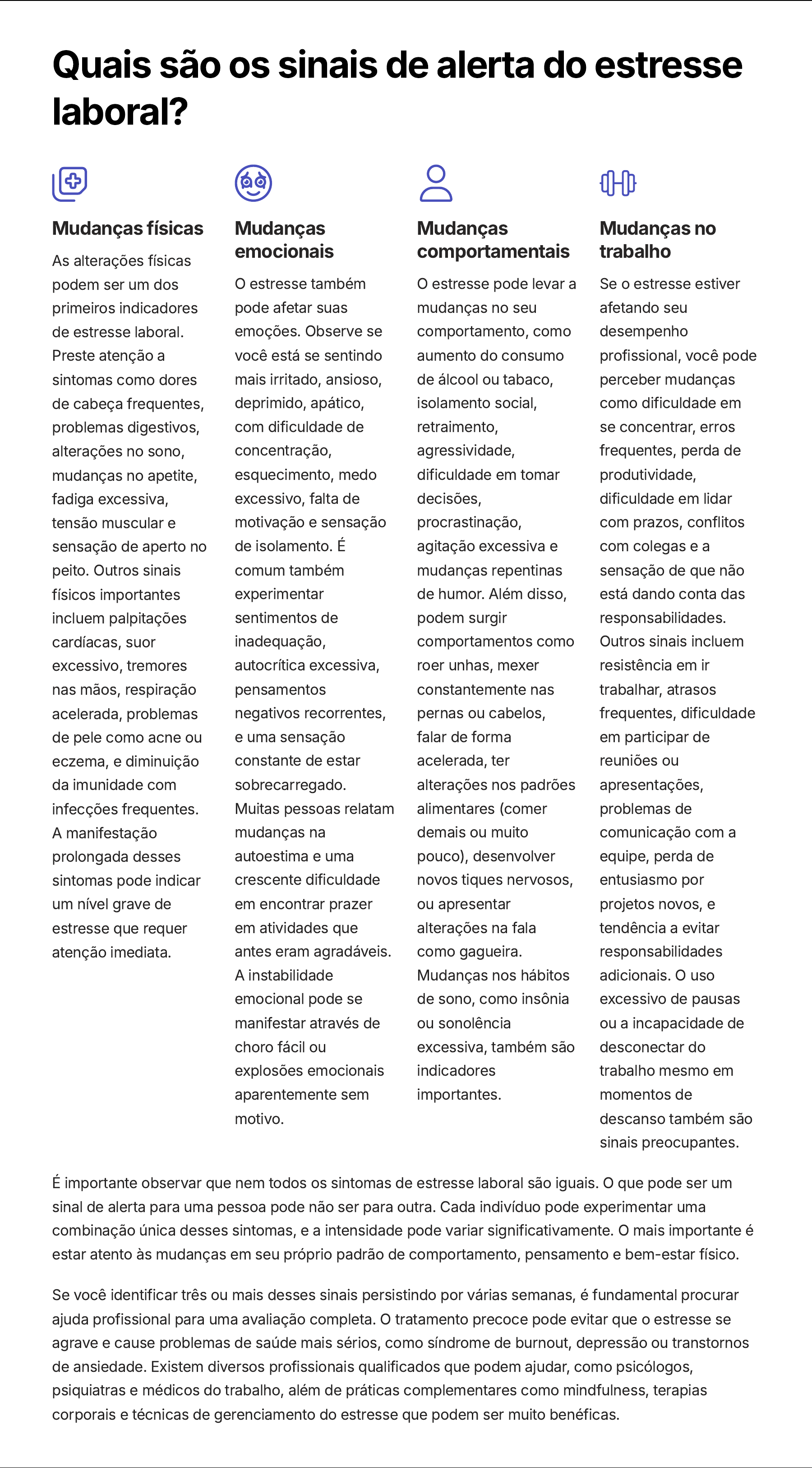 Quais são os sinais de alerta do estresse laboral? Mudanças físicas As alterações físicas podem ser um dos primeiros indicadores de estresse laboral. Preste atenção a sintomas como dores de cabeça frequentes, problemas digestivos, alterações no sono, mudanças no apetite, fadiga excessiva, tensão muscular e sensação de aperto no peito. Outros sinais físicos importantes incluem palpitações cardíacas, suor excessivo, tremores nas mãos, respiração acelerada, problemas de pele como acne ou eczema, e diminuição da imunidade com infecções frequentes. A manifestação prolongada desses sintomas pode indicar um nível grave de estresse que requer atenção imediata. Mudanças emocionais O estresse também pode afetar suas emoções. Observe se você está se sentindo mais irritado, ansioso, deprimido, apático, com dificuldade de concentração, esquecimento, medo excessivo, falta de motivação e sensação de isolamento. É comum também experimentar sentimentos de inadequação, autocrítica excessiva, pensamentos negativos recorrentes, e uma sensação constante de estar sobrecarregado. Muitas pessoas relatam mudanças na autoestima e uma crescente dificuldade em encontrar prazer em atividades que antes eram agradáveis. A instabilidade emocional pode se manifestar através de choro fácil ou explosões emocionais aparentemente sem motivo. Mudanças comportamentais O estresse pode levar a mudanças no seu comportamento, como aumento do consumo de álcool ou tabaco, isolamento social, retraimento, agressividade, dificuldade em tomar decisões, procrastinação, agitação excessiva e mudanças repentinas de humor. Além disso, podem surgir comportamentos como roer unhas, mexer constantemente nas pernas ou cabelos, falar de forma acelerada, ter alterações nos padrões alimentares (comer demais ou muito pouco), desenvolver novos tiques nervosos, ou apresentar alterações na fala como gagueira. Mudanças nos hábitos de sono, como insônia ou sonolência excessiva, também são indicadores importantes. Mudanças no trabalho Se o estresse estiver afetando seu desempenho profissional, você pode perceber mudanças como dificuldade em se concentrar, erros frequentes, perda de produtividade, dificuldade em lidar com prazos, conflitos com colegas e a sensação de que não está dando conta das responsabilidades. Outros sinais incluem resistência em ir trabalhar, atrasos frequentes, dificuldade em participar de reuniões ou apresentações, problemas de comunicação com a equipe, perda de entusiasmo por projetos novos, e tendência a evitar responsabilidades adicionais. O uso excessivo de pausas ou a incapacidade de desconectar do trabalho mesmo em momentos de descanso também são sinais preocupantes. É importante observar que nem todos os sintomas de estresse laboral são iguais. O que pode ser um sinal de alerta para uma pessoa pode não ser para outra. Cada indivíduo pode experimentar uma combinação única desses sintomas, e a intensidade pode variar significativamente. O mais importante é estar atento às mudanças em seu próprio padrão de comportamento, pensamento e bem-estar físico. Se você identificar três ou mais desses sinais persistindo por várias semanas, é fundamental procurar ajuda profissional para uma avaliação completa. O tratamento precoce pode evitar que o estresse se agrave e cause problemas de saúde mais sérios, como síndrome de burnout, depressão ou transtornos de ansiedade. Existem diversos profissionais qualificados que podem ajudar, como psicólogos, psiquiatras e médicos do trabalho, além de práticas complementares como mindfulness, terapias corporais e técnicas de gerenciamento do estresse que podem ser muito benéficas.