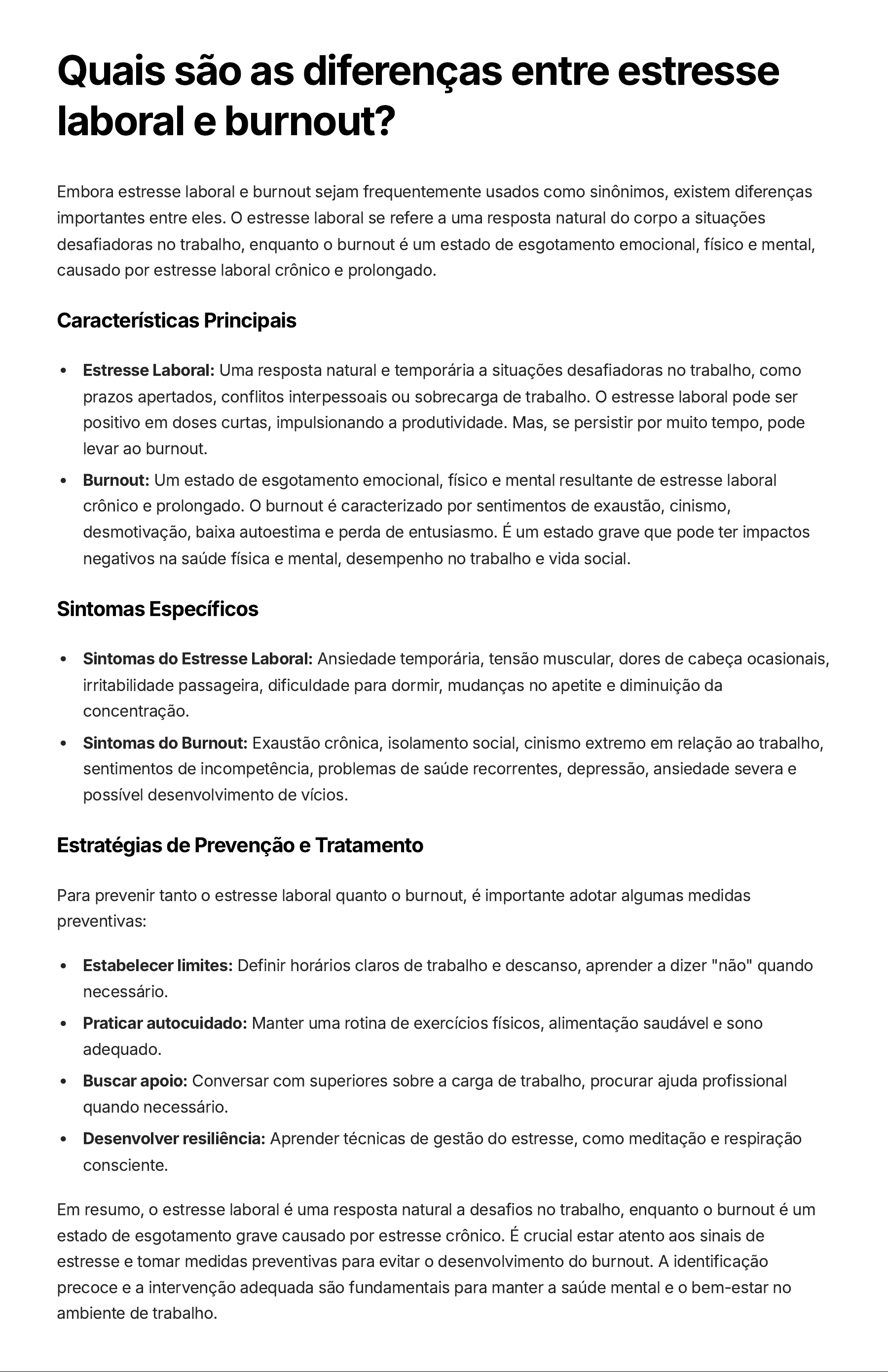 Quais são as diferenças entre estresse laboral e burnout? Embora estresse laboral e burnout sejam frequentemente usados como sinônimos, existem diferenças importantes entre eles. O estresse laboral se refere a uma resposta natural do corpo a situações desafiadoras no trabalho, enquanto o burnout é um estado de esgotamento emocional, físico e mental, causado por estresse laboral crônico e prolongado. Características Principais Estresse Laboral: Uma resposta natural e temporária a situações desafiadoras no trabalho, como prazos apertados, conflitos interpessoais ou sobrecarga de trabalho. O estresse laboral pode ser positivo em doses curtas, impulsionando a produtividade. Mas, se persistir por muito tempo, pode levar ao burnout. Burnout: Um estado de esgotamento emocional, físico e mental resultante de estresse laboral crônico e prolongado. O burnout é caracterizado por sentimentos de exaustão, cinismo, desmotivação, baixa autoestima e perda de entusiasmo. É um estado grave que pode ter impactos negativos na saúde física e mental, desempenho no trabalho e vida social. Sintomas Específicos Sintomas do Estresse Laboral: Ansiedade temporária, tensão muscular, dores de cabeça ocasionais, irritabilidade passageira, dificuldade para dormir, mudanças no apetite e diminuição da concentração. Sintomas do Burnout: Exaustão crônica, isolamento social, cinismo extremo em relação ao trabalho, sentimentos de incompetência, problemas de saúde recorrentes, depressão, ansiedade severa e possível desenvolvimento de vícios. Estratégias de Prevenção e Tratamento Para prevenir tanto o estresse laboral quanto o burnout, é importante adotar algumas medidas preventivas: Estabelecer limites: Definir horários claros de trabalho e descanso, aprender a dizer "não" quando necessário. Praticar autocuidado: Manter uma rotina de exercícios físicos, alimentação saudável e sono adequado. Buscar apoio: Conversar com superiores sobre a carga de trabalho, procurar ajuda profissional quando necessário. Desenvolver resiliência: Aprender técnicas de gestão do estresse, como meditação e respiração consciente. Em resumo, o estresse laboral é uma resposta natural a desafios no trabalho, enquanto o burnout é um estado de esgotamento grave causado por estresse crônico. É crucial estar atento aos sinais de estresse e tomar medidas preventivas para evitar o desenvolvimento do burnout. A identificação precoce e a intervenção adequada são fundamentais para manter a saúde mental e o bem-estar no ambiente de trabalho.