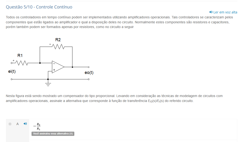 Questão 5/10 - Controle Contínuo Ler em alta Todos os controladores em tempo contínuo podem ser implementados utilizando amplificadores operacionais. Tais controladores se caracterizam pelos componentes que estão ligados ao amplificador e qual a disposição deles no circuito. Normalmente estes componentes são resistores e capacitores, porém também podem ser formados apenas por resistores, como no circuito a seguir R2 R1 ei(t) + eo(t) Nesta figura está sendo mostrado um compensador do tipo proporcional. Levando em consideração as técnicas de modelagem de circuitos com amplificadores operacionais, assinale a alternativa que corresponde à função de transferência do referido circuito. A R2 R1 Você assinalou essa alternativa (A)