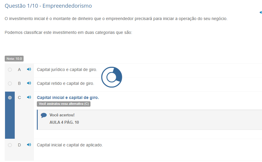 Questão 1/10 - Empreendedorismo investimento inicial é o montante de dinheiro que empreendedor precisará para iniciar a operação do seu negócio. Podemos classificar este investimento em duas categorias que são: Nota: 10.0 A Capital jurídico e capital de giro. B Capital retido e capital de giro. C Capital inicial e capital de giro. Você assinalou essa alternativa (C) Você acertou! AULA 4 10 D Capital inicial e capital de aplicado.