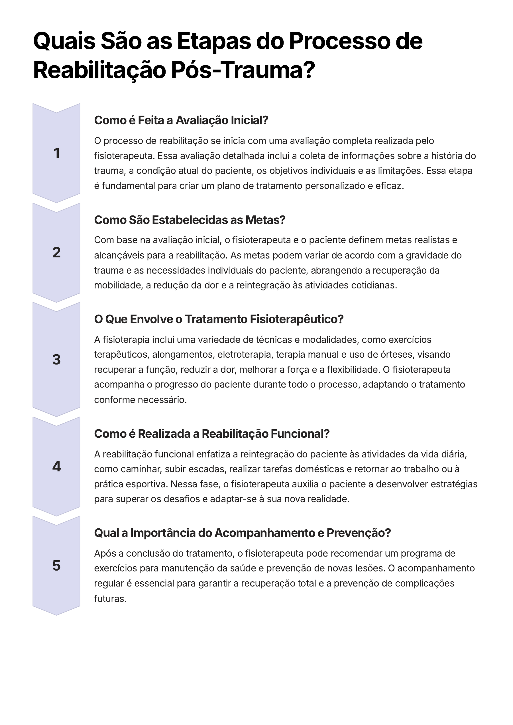 Quais São as Etapas do Processo de Reabilitação Pós-Trauma? 1 Como é Feita a Avaliação Inicial? O processo de reabilitação se inicia com uma avaliação completa realizada pelo fisioterapeuta. Essa avaliação detalhada inclui a coleta de informações sobre a história do trauma, a condição atual do paciente, os objetivos individuais e as limitações. Essa etapa é fundamental para criar um plano de tratamento personalizado e eficaz. 2 Como São Estabelecidas as Metas? Com base na avaliação inicial, o fisioterapeuta e o paciente definem metas realistas e alcançáveis para a reabilitação. As metas podem variar de acordo com a gravidade do trauma e as necessidades individuais do paciente, abrangendo a recuperação da mobilidade, a redução da dor e a reintegração às atividades cotidianas. 3 O Que Envolve o Tratamento Fisioterapêutico? A fisioterapia inclui uma variedade de técnicas e modalidades, como exercícios terapêuticos, alongamentos, eletroterapia, terapia manual e uso de órteses, visando recuperar a função, reduzir a dor, melhorar a força e a flexibilidade. O fisioterapeuta acompanha o progresso do paciente durante todo o processo, adaptando o tratamento conforme necessário. 4 Como é Realizada a Reabilitação Funcional? A reabilitação funcional enfatiza a reintegração do paciente às atividades da vida diária, como caminhar, subir escadas, realizar tarefas domésticas e retornar ao trabalho ou à prática esportiva. Nessa fase, o fisioterapeuta auxilia o paciente a desenvolver estratégias para superar os desafios e adaptar-se à sua nova realidade. 5 Qual a Importância do Acompanhamento e Prevenção? Após a conclusão do tratamento, o fisioterapeuta pode recomendar um programa de exercícios para manutenção da saúde e prevenção de novas lesões. O acompanhamento regular é essencial para garantir a recuperação total e a prevenção de complicações futuras. Qual é a Duração Típica do Tratamento Fisioterapêutico? A duração do tratamento fisioterapêutico após um trauma varia consideravelmente, dependendo de diversos fatores, como a gravidade do trauma, a idade do paciente, sua condição geral de saúde, o tipo de lesão e a resposta individual ao tratamento. Em geral, o tratamento fisioterapêutico pode durar semanas, meses ou até mesmo anos, com o objetivo de restaurar a função física, reduzir a dor e prevenir complicações. Tipo de Trauma Duração Aproximada do Tratamento Fraturas ósseas simples 6-12 semanas Lesões de ligamentos e tendões 4-8 semanas a 6 meses Acidente vascular cerebral (AVC) Variavelmente, podendo durar meses ou anos Lesões de coluna vertebral Variavelmente, podendo durar meses ou anos É importante destacar que a tabela acima apresenta apenas durações aproximadas e que o tempo real de tratamento pode variar significativamente. O fisioterapeuta irá avaliar cada caso individualmente e definir o plano de tratamento mais adequado, com base nas necessidades específicas do paciente.