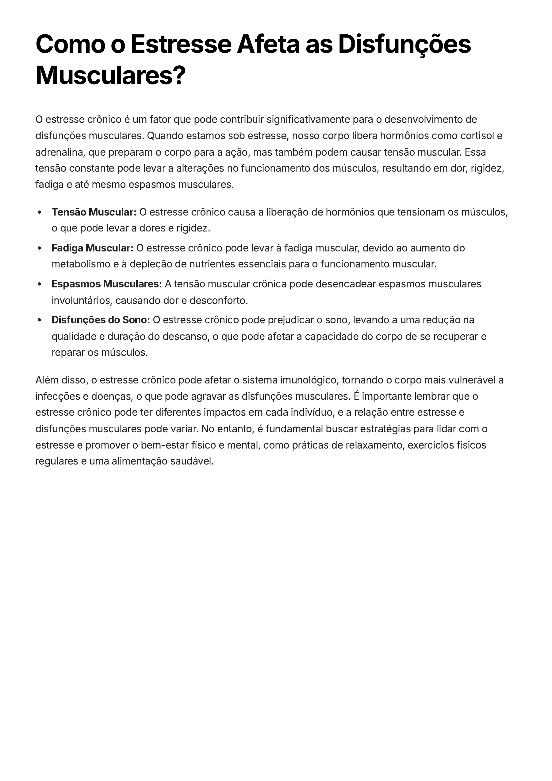 Como o Estresse Afeta as Disfunções Musculares? O estresse crônico é um fator que pode contribuir significativamente para o desenvolvimento de disfunções musculares. Quando estamos sob estresse, nosso corpo libera hormônios como cortisol e adrenalina, que preparam o corpo para a ação, mas também podem causar tensão muscular. Essa tensão constante pode levar a alterações no funcionamento dos músculos, resultando em dor, rigidez, fadiga e até mesmo espasmos musculares. Tensão Muscular: O estresse crônico causa a liberação de hormônios que tensionam os músculos, o que pode levar a dores e rigidez. Fadiga Muscular: O estresse crônico pode levar à fadiga muscular, devido ao aumento do metabolismo e à depleção de nutrientes essenciais para o funcionamento muscular. Espasmos Musculares: A tensão muscular crônica pode desencadear espasmos musculares involuntários, causando dor e desconforto. Disfunções do Sono: O estresse crônico pode prejudicar o sono, levando a uma redução na qualidade e duração do descanso, o que pode afetar a capacidade do corpo de se recuperar e reparar os músculos. Além disso, o estresse crônico pode afetar o sistema imunológico, tornando o corpo mais vulnerável a infecções e doenças, o que pode agravar as disfunções musculares. É importante lembrar que o estresse crônico pode ter diferentes impactos em cada indivíduo, e a relação entre estresse e disfunções musculares pode variar. No entanto, é fundamental buscar estratégias para lidar com o estresse e promover o bem-estar físico e mental, como práticas de relaxamento, exercícios físicos regulares e uma alimentação saudável. Quais são as Disfunções Musculares Comuns em Idosos? Por que as costas doem em idosos? A dor nas costas é uma das disfunções musculares mais comuns em idosos, frequentemente resultante de desgaste natural dos discos intervertebrais, fraqueza muscular e osteoporose. O envelhecimento causa diminuição da flexibilidade da coluna vertebral, tornando-a mais suscetível a lesões e dores. Essa dor pode ser localizada na região lombar, dorsal ou cervical, e pode ser agravada por atividades físicas intensas, má postura e movimentos repetitivos. Qual a causa da dor no quadril em idosos? A dor no quadril, conhecida como artrite, é outra disfunção muscular comum em idosos. O desgaste da cartilagem e a redução da lubrificação nas articulações do quadril podem causar dor, rigidez e limitação de movimentos. A dor pode se irradiar para a perna e afetar a capacidade de caminhar, subir escadas e realizar atividades diárias. Como surge a dor no joelho em idosos? A dor no joelho é um problema comum em idosos, frequentemente causada pela osteoartrite, desgaste da cartilagem articular e fraqueza muscular. O envelhecimento e o uso excessivo podem levar ao desgaste da cartilagem, resultando em dor, inchaço e dificuldade de mobilidade. A dor no joelho pode afetar a capacidade de caminhar, subir escadas e realizar atividades físicas. O que é tendinite e como afeta os idosos? A tendinite é uma inflamação dos tendões, que são os tecidos que conectam os músculos aos ossos. O envelhecimento pode causar perda de elasticidade e resistência nos tendões, tornando-os mais suscetíveis a inflamações. A tendinite pode afetar os tendões do ombro, cotovelo, punho, quadril e joelho, causando dor, rigidez e dificuldade de movimento.