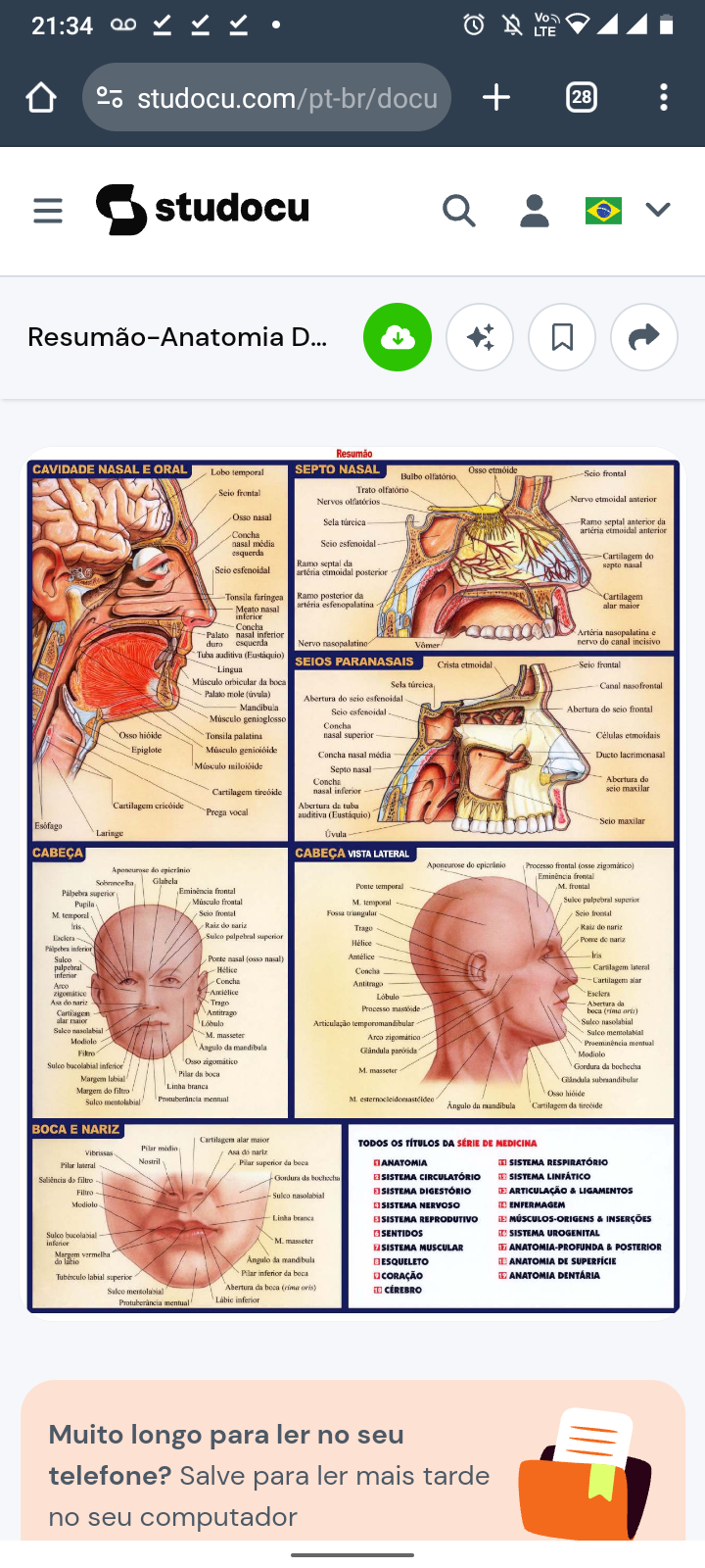 21:34 LTE studocu.com/pt-br/docu + 28 studocu D... Resumão CAVIDADE NASAL E ORAL Lobo temporal SEPTO NASAL Osso Bulbo frontal Sejo frontal Trato Nervos Nervo etmoidal anterior Osso nasal Sela túrcica septal anterior da Concha artéria etmoidal anterior nasal média Scio esfenoidal esquerda do Ramo septal da esfenoidal septo nasal artéria posterior Tonsila faringea Ramo da Cartilagem Meato nasal esfenopalatina alar maior inferior Concha Palato inferior nasopalatina e duro esquerda Nervo nervo do canal Tuba auditiva SEIOS PARANASAIS Crista etmoidal Lingua Músculo orbicular da boca túrcica nasofrontal mole (úvula) Abertura do esfenoidal Abertura de frontal Concha Osso Tonsila palatina nasal superior Epiglote Concha nasal média Ducto nasal Concha Abertura do Cartilagem nasal inferior maxilar Cartilagem Abertura da tuba Prega vocal auditiva (Eustáquio) maxilar Laringe CABEÇA VISTA LATERAL de Processor frontal zigomático) Glabela Eminência frontal Eminência frontal temporal M frontal superior Pupila frontal temporal pulpebral superior M temporal frontal Fossa triangular Sejo frontal Raiz do Raiz naria Sulco superior Hélice Pome inferior Sulco Ponte nasal Iris Hélice Cartilagem lateral inferior Concha Antitrago alar do nariz Abertura da boca Articulação Saleo M masseter memolabial Mediale Angulo da Preeminência mentual bucolabial M masseter Gordura da bochecha boca labial Glindula Linha filtre Osso mentolshial mentual M BOCA E NARIZ TODOS os TÍTULOS DA SÉRIE DE MEDICINA Pilar médio Vibrissas nariz Nostril Pila lateral Pilar de ANATOMIA SISTEMA RESPIRATÓRIO film SISTEMA CIRCULATÓRIO SISTEMA LINFÁTICO Filtro SISTEMA DIGESTÓRIO Sulco ARTICULAÇÃO & LIGAMENTOS SISTEMA NERVOSO ENFERMAGEM Linha SISTEMA REPRODUTIVO & INSERÇÕES bucolabial SENTIDOS SISTEMA UROGENITAL masseter SISTEMA MUSCULAR ANATOMIA-PROFUNDA & POSTERIOR Margem do Angulo da mandibula ANATOMIA DE SUPERFÍCIE Pilar inferior da boca labial superior CORAÇÃO ANATOMIA DENTÁRIA Abertura da boca CÉREBRO mentual inferior Muito longo para ler no seu telefone? Salve para ler mais tarde no seu computador