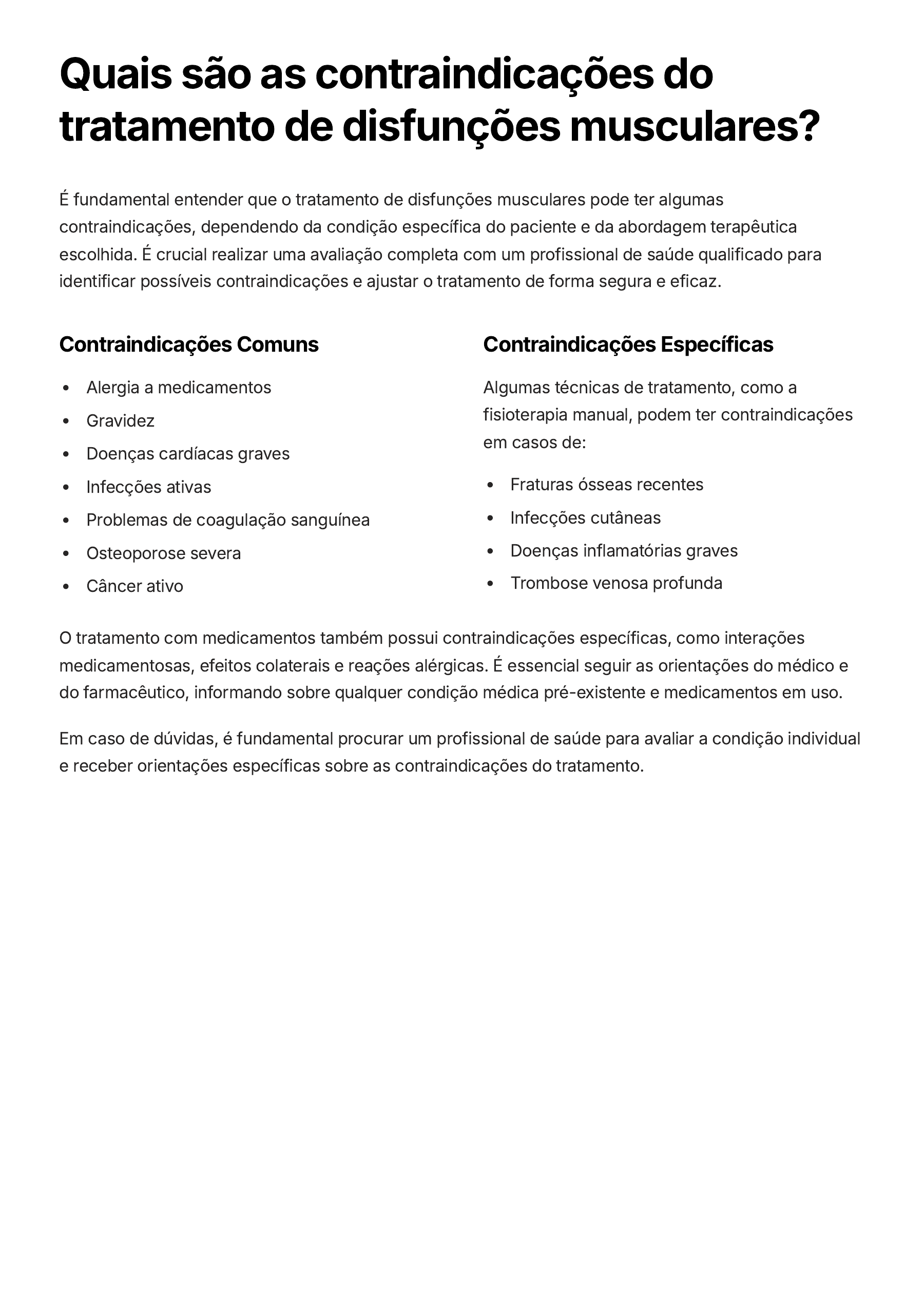 Quais são as contraindicações do tratamento de disfunções musculares? É fundamental entender que o tratamento de disfunções musculares pode ter algumas contraindicações, dependendo da condição específica do paciente e da abordagem terapêutica escolhida. É crucial realizar uma avaliação completa com um profissional de saúde qualificado para identificar possíveis contraindicações e ajustar o tratamento de forma segura e eficaz. Contraindicações Comuns Alergia a medicamentos Gravidez Doenças cardíacas graves Infecções ativas Problemas de coagulação sanguínea Osteoporose severa Câncer ativo Contraindicações Específicas Algumas técnicas de tratamento, como a fisioterapia manual, podem ter contraindicações em casos de: Fraturas ósseas recentes Infecções cutâneas Doenças inflamatórias graves Trombose venosa profunda O tratamento com medicamentos também possui contraindicações específicas, como interações medicamentosas, efeitos colaterais e reações alérgicas. É essencial seguir as orientações do médico e do farmacêutico, informando sobre qualquer condição médica pré-existente e medicamentos em uso. Em caso de dúvidas, é fundamental procurar um profissional de saúde para avaliar a condição individual e receber orientações específicas sobre as contraindicações do tratamento. Qual é o Tempo Médio de Recuperação? O tempo de recuperação de disfunções musculares varia consideravelmente, dependendo da gravidade da condição, da localização do problema, da idade do paciente, do histórico de saúde e da resposta individual ao tratamento. 2 Semanas 4 Semanas 12 Semanas 6 Meses Para disfunções musculares leves, como cãibras ou fadiga muscular, a recuperação pode levar de 2 a 4 semanas. Já para casos mais graves, como tendinite ou estiramento muscular, o tempo de recuperação pode variar de 4 a 12 semanas. Em situações complexas, como ruptura muscular ou síndrome do desfiladeiro torácico, a recuperação pode levar até 6 meses. É importante ressaltar que o tratamento adequado, incluindo fisioterapia, medicamentos e repouso, contribui significativamente para a recuperação e acelera o processo de cura. O acompanhamento médico regular e a adesão ao plano de tratamento recomendado pelo profissional de saúde são fundamentais para a recuperação completa e prevenção de complicações.