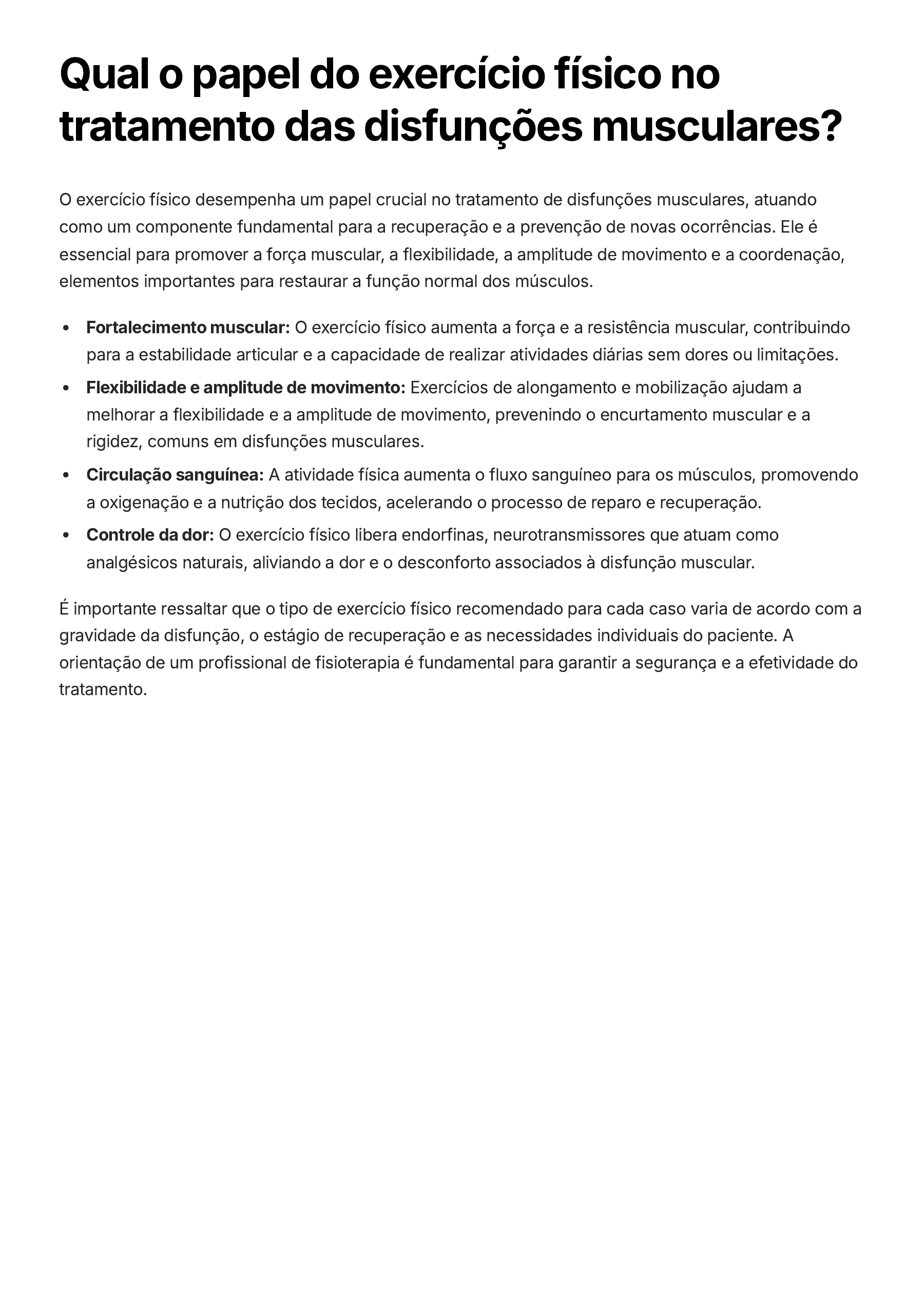 Qual o papel do exercício físico no tratamento das disfunções musculares? O exercício físico desempenha um papel crucial no tratamento de disfunções musculares, atuando como um componente fundamental para a recuperação e a prevenção de novas ocorrências. Ele é essencial para promover a força muscular, a flexibilidade, a amplitude de movimento e a coordenação, elementos importantes para restaurar a função normal dos músculos. Fortalecimento muscular: O exercício físico aumenta a força e a resistência muscular, contribuindo para a estabilidade articular e a capacidade de realizar atividades diárias sem dores ou limitações. Flexibilidade e amplitude de movimento: Exercícios de alongamento e mobilização ajudam a melhorar a flexibilidade e a amplitude de movimento, prevenindo o encurtamento muscular e a rigidez, comuns em disfunções musculares. Circulação sanguínea: A atividade física aumenta o fluxo sanguíneo para os músculos, promovendo a oxigenação e a nutrição dos tecidos, acelerando o processo de reparo e recuperação. Controle da dor: O exercício físico libera endorfinas, neurotransmissores que atuam como analgésicos naturais, aliviando a dor e o desconforto associados à disfunção muscular. É importante ressaltar que o tipo de exercício físico recomendado para cada caso varia de acordo com a gravidade da disfunção, o estágio de recuperação e as necessidades individuais do paciente. A orientação de um profissional de fisioterapia é fundamental para garantir a segurança e a efetividade do tratamento. Como são tratadas as disfunções musculares? O tratamento para disfunções musculares visa aliviar a dor, reduzir a inflamação, restaurar a função muscular e prevenir recorrências. Existem diversas abordagens terapêuticas, que podem ser combinadas de acordo com a necessidade de cada paciente. 1 O que é o tratamento conservador? Engloba medidas não invasivas, como repouso, aplicação de gelo, compressas, elevação do membro afetado, medicamentos analgésicos e anti- inflamatórios, fisioterapia e exercícios de reabilitação. É a primeira linha de tratamento para a maioria das disfunções musculares. 2 Como a fisioterapia auxilia no tratamento? A fisioterapia é essencial para o tratamento das disfunções musculares, desempenhando um papel fundamental na reabilitação. O fisioterapeuta avalia a condição do paciente, define um plano de tratamento individualizado e utiliza técnicas como exercícios de mobilização, alongamento, fortalecimento muscular, terapia manual, eletroterapia, ultrassom e outras modalidades para auxiliar na recuperação da função muscular e na prevenção de novas lesões. 3 Qual o papel da medicação? Medicamentos como analgésicos, anti- inflamatórios e relaxantes musculares podem ser prescritos para aliviar a dor e a inflamação. A escolha do medicamento e a dosagem são determinadas pelo médico, com base na gravidade da disfunção muscular, na presença de outras condições médicas e na tolerância do paciente. 4 Quando são necessárias as injeções? Em alguns casos, o médico pode optar por realizar injeções de corticosteroides no local da disfunção muscular para reduzir a inflamação e aliviar a dor. Essas injeções são geralmente usadas para tratar casos mais graves e persistentes, e seus efeitos podem ser temporários.
