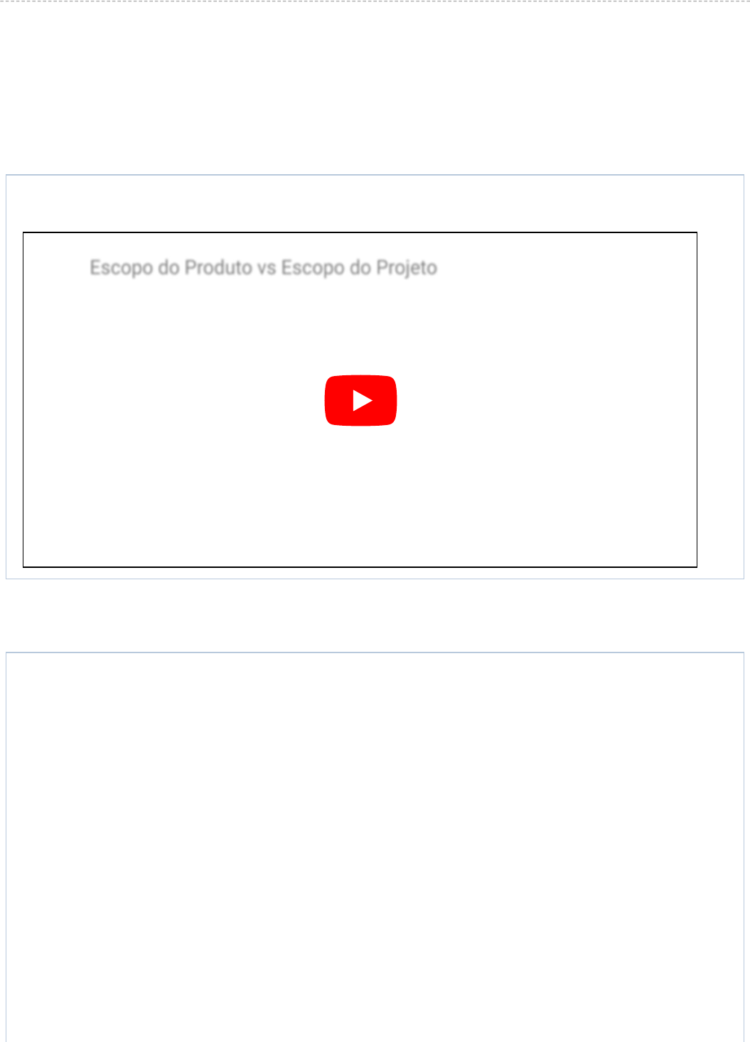 14/03/24, 20:41 EaDTEC AVA https://eadtec.cps.sp.gov.br/atividades/apresentacao.php?id_aula=647&id_atividade=2884&id_turma=14734 1/2 GP Agenda 05: Escopo de um Projeto – do início ao controle de mudanças. Ampliando Horizontes Assista a um vídeo que mostra as fases de definição do escopo e a diferença entre escopo do projeto e escopo do produto. Escopo do Produto vs Escopo do Projeto. Escopo do Produto vs Escopo do ProjetoEscopo do Produto vs Escopo do Projeto Assista a um vídeo que fala sobre a importância de se definir a EAP (Estrutura Analítica do Projeto). Técnica: Criar a EAP (Estrutura Analítica do Projeto). https://www.youtube.com/watch?v=pDeD5JKBjkQ 14/03/24, 20:41 EaDTEC AVA https://eadtec.cps.sp.gov.br/atividades/apresentacao.php?id_aula=647&id_atividade=2884&id_turma=14734 2/2 Técnica: Criar a EAP (Estrutura Analítica do Projeto)Técnica: Criar a EAP (Estrutura Analítica do Projeto) Assista a um vídeo que explica exatamente o que é e como se desenvolve uma EAP, sua decomposição e o estabelecimento de níveis ou pacotes de trabalho. Leia o post a seguir e compreenda a importância da definição do escopo, suas fases, desafios etc. Como definir o escopo do projeto? 4 processos de entrada fundamentais. https://www.youtube.com/watch?v=qQQ5RHuDA6A https://www.projectbuilder.com.br/blog/como-definir-o-escopo-do-projeto-4-processos-de-entrada-fundamentais/
