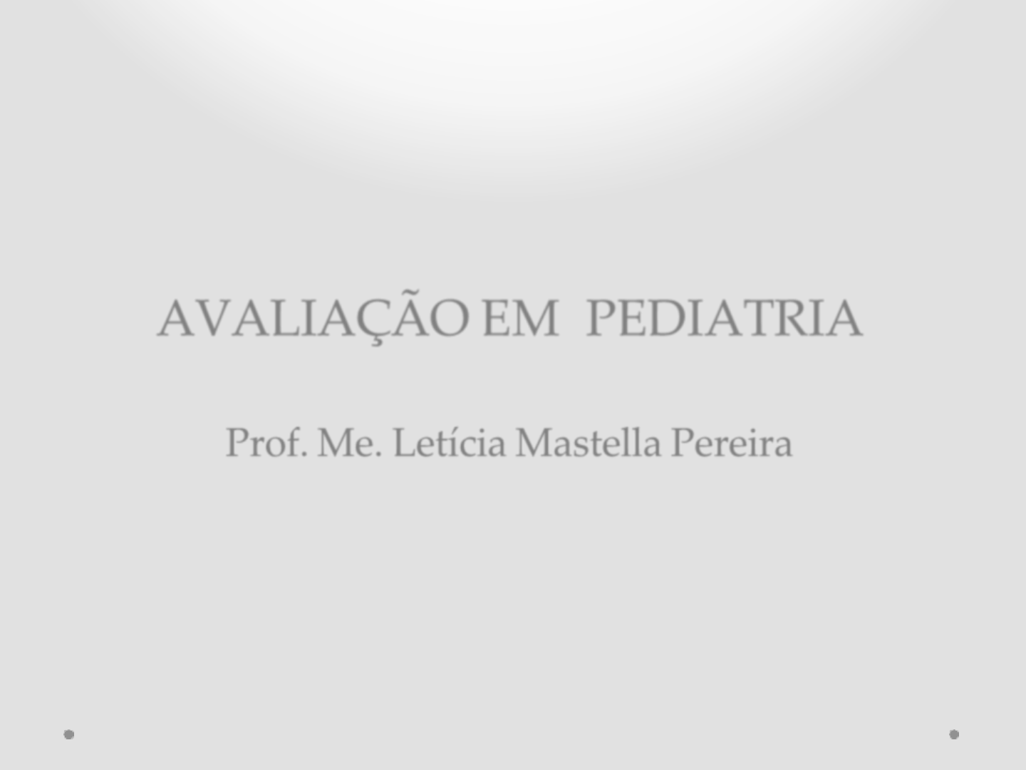 AVALIAÇÃO EM PEDIATRIA Prof. Me. Letícia Mastella Pereira Quais os Objetivos da Fisioterapia? Avaliação Pediátrica Semiologia Neonatal O exame do recém-nascido (RN) é de fundamental importância, pois ao contrário do paciente adulto, as únicas informações que o bebê pode nos fornecer são seus sinais e sintomas. Anamnese 1) Identificação 2) Queixa principal 3) História da doença atual 4) História de patologias pregressas e na família 5) Gestação, parto (tipo de parto, idade materna) 6) Alimentação (AME) 7) Desenvolvimento neuropsicomotor 8) Vacinações 9) História social (estrutura familiar, ambiente/contexto, perfil socioeconômico, habitação) Anamnese Identificação - Nome completo e data de nascimento - Cor - Sexo - Naturalidade e nacionalidade - Endereço, procedência e contato - Tipo de residência (água encanada, esgoto, saneamento básico...) - Profissão e ocupação dos pais Anamnese História da Gestação, parto e nascimento - Idade materna - Saúde da mãe - Se fez pré-natal - Doenças durante a gravidez (rubéola, herpes, intoxicação alimentar, toxoplasmose, hepatite, HIV) - Nº de gestações - Hábitos alimentares da mãe, medicamentos, tabagismo, drogas - Tipo de parto (normal ou cesariana), local, uso de fórceps no parto - Idade gestacional data da última menstruação pré-termo X a termo - Peso ao nascimento - Índice de Apgar (grau de atividade do RN) - Intercorrências durante o parto Sinais 0 1 2 Frequência Cardíaca Ausente 100 bpm Esforço respiratório Ausente Lento, irregular, choro fraco Regular, choro forte Tônus muscular Flácido Alguma flexão de extremidades Movimento ativo Irritabilidade reflexa Sem reposta Careta, espirro Choro Cor Cianose ou palidez Rosada, extremidade cianótica Rosada Índice de Apgar (Rodrigues & Rodrigues, 2012) Anamnese Alimentação - Aleitamento materno exclusivo (AME), até quando? Desmame precoce ou tardio? - Alimentação atual - Alergia ou intolerância alimentar Anamnese Avaliação do desenvolvimento Neuropsicomotor - Habilidades motoras, cognitivas - Sono - Controle dos esfíncteres, enurese diurna e/ou noturna - Agressividade ou passividade - Adaptação social, emotividade, hábitos diários, relação familiar Avaliação do desenvolvimento motor de crianças de 0 a 18 meses Peso - Peso ao nascimento é realizado com o RN uma a 2 horas de vida - Classificação segundo OMS: * Peso entre 3000 e 3999g – RN com peso adequado * Peso ou = a 4000g – RN macrossômico - Pesagem realizada de 0 a 23 meses Comprimento - Ao nascer, em torno de 50 cm - Com a criança em DD , de 0 a 23 meses Perímetro Cefálico Maior diâmetro ao nascimento: 35 cm (meninos) e 34 cm (meninas) Marcador do crescimento e desenvolvimento SNC Macrocefalia, hidrocefalia e microcefalia Perímetro Torácico Ao nível dos mamilos, com a criança em DD, entre a inspiração e expiração completas Exemplo: Beatriz nasceu em 18 de maio de 2009, com 28 semanas gestacionais. Quando ela completou 9 meses (36 semanas) de idade cronológica, qual seria sua idade corrigida? 40 semanas – 28 semanas = 12 semanas (3 meses) Aos 9 meses 6 meses de idade corrigida IDADE CRONOLÓGICA MENOS AS SEMANAS QUE FALTARAM PARA COMPLETAR AS 40 SEMANAS DE GESTAÇÃO IDADE CORRIGIDA • O perímetro cefálico deve ser corrigido até 1 ano e meio; • Peso e o DNPM até 2 anos; • Altura deve ser corrigida até 3 anos e meio. Estes limites de idade se baseiam na época em que a diferença devido a prematuridade passa a não ter mais importância. Para os prematuros de extremo baixo peso e menores que 28 semanas, recomenda-se corrigir a idade até os 3 anos.