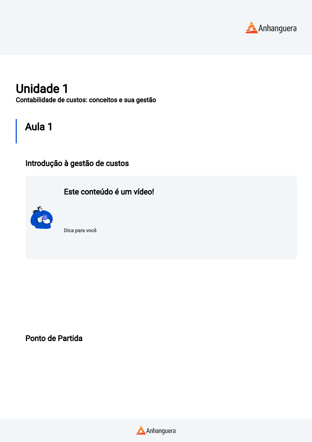 Disciplina ANÁLISE DE CUSTOS Unidade 1 Contabilidade de custos: conceitos e sua gestão Aula 1 Introdução à gestão de custos Introdução à gestão de custos Este conteúdo é um vídeo! Para assistir este conteúdo é necessário que você acesse o AVA pelo computador ou pelo aplicativo. Você pode baixar os vídeos direto no aplicativo para assistir mesmo sem conexão à internet. Dica para você Aproveite o acesso para baixar os slides do vídeo, isso pode deixar sua aprendizagem ainda mais completa. Olá, estudante! Nesta videoaula, você vai obter mais informações sobre a introdução à gestão de custos. Este conteúdo é importante para a sua prática pro�ssional, pois a contabilidade é uma ciência com o objetivo de mensurar, registrar, interpretar e avaliar as mudanças que possam vir a ocorrer na estrutura patrimonial de uma organização. Isso signi�ca que a contabilidade fornece aos seus usuários dados e informações sobre a situação econômica e �nanceira da empresa. Prepare-se para esta jornada de conhecimento! Vamos lá! Ponto de Partida A Best Foods é uma organização familiar, atuante no ramo de processamento de alimentos há vinte anos. É uma empresa que fornece alimentos para hotéis, restaurantes, bares, além de empresas para eventos corporativos. O quadro funcional compõe-se atualmente por 75 funcionários, tendo capacidade de produção de 15 toneladas de alimentos por mês. O investimento em equipamentos e estruturação foi de R$ 12.000.000,00, cujo retorno os proprietários esperam que seja no médio prazo. O trabalho inicial será classi�car os gastos em custos e despesas, projetando os valores totais para os próximos dois meses a �m de veri�car a evolução dos gastos nos períodos. O volume de Disciplina ANÁLISE DE CUSTOS produção para o mês 1 está estimado em 123.500 unidades; para o mês 2, em 128.200 unidades. Os dados existentes nos controles da empresa estão descritos conforme o quadro a seguir: Custo unitário (mês 1) Custo unitário (mês 2) Material escritório R$ 0,08 R$ 0,03 Energia (produção) R$ 0,02 R$ 0,03 Matéria-prima e transporte R$ 0,23 R$ 0,20 Fretes R$ 0,03 R$ 0,03 Mão de obra (produção) R$ 0,32 R$ 0,34 Salários (administração) R$ 0,50 R$ 0,40 Quadro 1 | Composição dos gastos Best Foods. Fonte: Paim (2016). Para esta atividade, é preciso estudar as informações contábeis, suas regras, o conceito da contabilidade de custos e sua formação, além do uso de terminologias utilizadas para o setor industrial, que é o nosso exemplo, e para o setor de serviços. A contabilidade é a base das discussões para as �nanças. Todas as organizações são obrigadas a prestar contas sobre seu patrimônio, utilizando-se da contabilidade. Entretanto, é possível utilizar os dados contábeis para tomar decisões gerenciais, por exemplo: avaliar os resultados passados para prospectar o futuro. Assim, entender a dinâmica dos gastos da empresa é um ponto de partida para olhar dados contábeis de forma mais gerencial Vamos Começar! Fundamentos da contabilidade Para uma compreensão do uso da contabilidade de custos como ferramenta de gestão, é preciso reportar-nos à contabilidade para entendermos quais são as regras e os fundamentos que devem ser lembrados quando se utilizarem os conceitos e a aplicação da gestão dos custos para tomada de decisão na empresa. Como ponto de partida, vale ressaltar que a contabilidade é uma ciência com o objetivo de mensurar, registrar, interpretar e avaliar as mudanças que possam vir a ocorrer na estrutura patrimonial de uma organização. Isso signi�ca que a contabilidade fornece aos seus usuários dados e informações sobre a situação econômica e �nanceira da empresa. Se a contabilidade tem como foco de trabalho o patrimônio, o que ele vem a ser, então? Podemos resumir que o patrimônio se refere a tudo o que uma entidade possua de bens e direitos, e tudo aquilo que possua de obrigações. Ou seja, o patrimônio é formado por tudo que uma empresa tem e tudo o que possui em dívidas. Para estruturar o patrimônio de uma entidade, a regra estabelece que todos os bens e direitos existentes sejam denominados como “ativo”. Todas as obrigações da entidade, por sua vez, serão chamadas de “passivo”. Percebe-se, nesse sentido, que a classi�cação dos elementos patrimoniais deve obedecer às regras que demonstram a dimensão patrimonial das organizações. É importante ressaltar que, considerando-se a separação dos elementos patrimoniais em ativo e passivo, dentro desses dois grupos, os itens são classi�cados também em itens de curto prazo, Disciplina ANÁLISE DE CUSTOS denominados circulantes, e itens de longo prazo, denominados não circulantes. É uma maneira de organizar os dados do patrimônio a �m de permitir a interpretação. Além dessa separação que deve ser feita, as entidades mensuram a performance obtida dentro de um determinado período. A contabilidade a divide em elementos de resultados, ou seja, tudo o que a empresa gera de faturamento e todo o gasto advindo das atividades propiciarão um resultado positivo ou negativo. Nesse contexto, os eventos �nanceiros gerados pelas entidades devem ser registrados em sua contabilidade, obedecendo aos princípios que regem essas contabilizações, de maneira que possam atender aos preceitos da evidenciação aos quais toda entidade está obrigada a proceder no tocante ao processo de prestação de contas. De que maneira, então, as entidades fazem essas evidenciações? As demonstrações �nanceiras correspondem ao caminho pelo qual se apresenta essa “prestação de contas” das entidades para a sociedade. Trata-se de uma representação monetária, de forma estruturada, sobre as transações realizadas por uma entidade a cada período. Portanto, percebemos que a contabilidade é a base para as discussões dos assuntos relacionados às �nanças. O sucesso no gerenciament