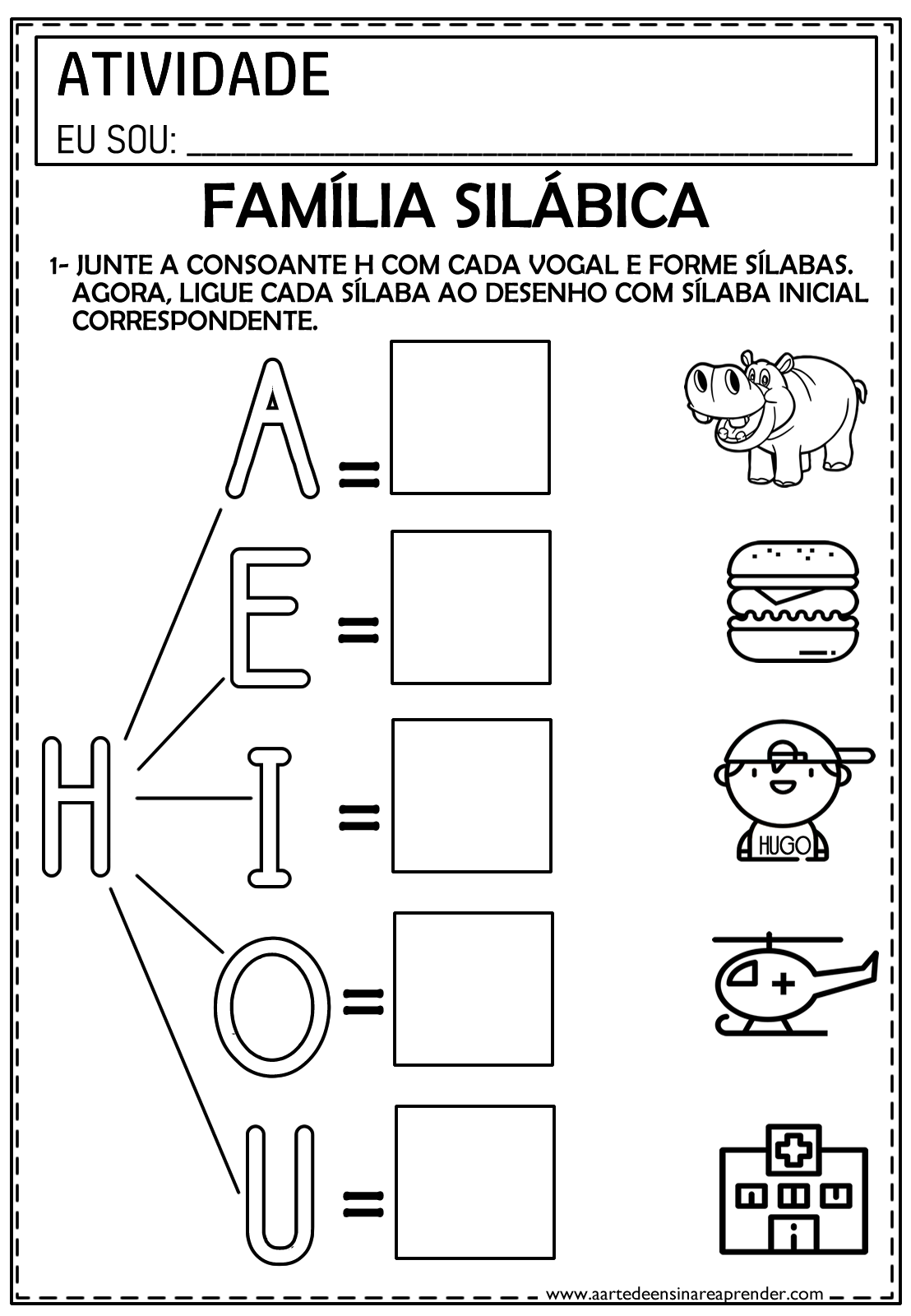 ATIVIDADE EU SOU: FAMÍLIA SILÁBICA 1- JUNTE A CONSOANTE H COM CADA VOGAL E FORME SÍLABAS. AGORA, LIGUE CADA SÍLABA AO DESENHO COM SÍLABA INICIAL CORRESPONDENTE. A I = HUGO = =