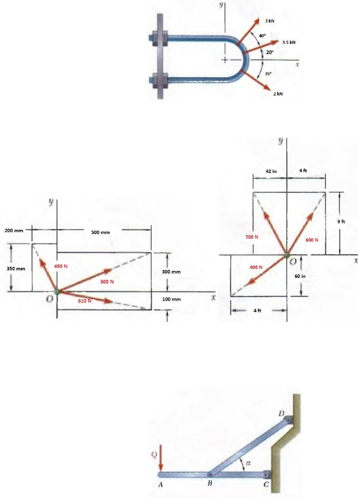 Lista de ejercicios –UNIDAD 2 1. Determine las componente y de cada una de las fuerzas que se muestran en la figura. 2. Determine las componente y de cada una de las fuerzas que se muestran en la figura. 3. El elemento BD ejerce sobre el miembro ABC una fuerza �⃗ dirigida a lo largo de la línea BD. Si �⃗ debe tener una componente vertical de 560 lb y � = �, determine a) la magnitud de la fuerza �⃗ , b) su componente horizontal. 4. Si la magnitud de la fuerza resultante que actúa sobre la ménsula debe ser de 50 lb y estar dirigida a lo largo del eje �, determine la dirección de �⃗ y su dirección �. 5. Sabiendo que � = 0�, determine la tensión a) en el cable AC, b) la cuerda BC. 6. Dos cables se amarran juntos en C y se cargan como indica la figura. Si = 0 mm, = ft, = 00 mm y = ft, determine la tensión en a) el cable AC, b) el cable BC. 7. Si la magnitud de la fuerza resultante que actúa sobre la armella es de 150 lb y su dirección medida en el sentido de las manecillas del reloj desde el eje positivo es � = 0�, determine la magnitud de �⃗⃗⃗ y del ángulo �. 8. Exprese la fuerza como un vector cartesiano. 9. Determine la magnitud y los ángulos directores coordenados de � de manera que la resultante de las dos fuerzas sea cero. 10. Dos semáforos se cuelgan temporalmente de un cable como se muestra en la figura. Si el semáforo colocado en B pesa 450 N, determine el peso del semáforo en C. Nota: Los problemas se deben de entregar en formato .pdf, con la explicación explícita de la solución de cada uno de los ejercicios. Los rubros que se tomarán para la asignación de calificación son: 1. Procedimiento explicado con sus propias palabras 2. Orden en los pasos a desarrollar 3. Resultados correctos 4. Entrega en tiempo y forma. Por favor indicar en su documento los integrantes del equipo y nombrar el documento como EQUIPO X-Ejercicios Unidad 2