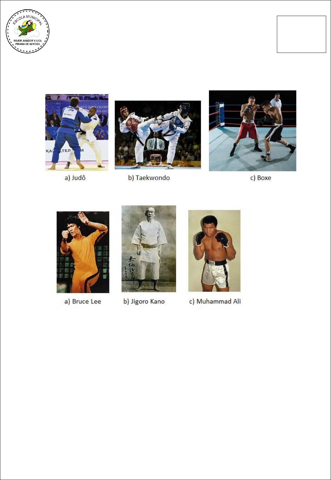 ESCOLA MUNICIPAL MAJOR AVIADOR Y- JUCA PIRAMA DE ALMEIDA PROFESSOR(A): Gustavo- Educação Física II PROFESSOR(A)Apoio: Flaviane Aluno(a):_________________________________________nº ____ Ano/ Turma:9º A Turno:MatutinoData: ___ / ___/ 2024 Prova bimestral– Esportes de Combate 1. Qual dessas modalidades tem como objetivo principal o uso de golpes com os punhos? (1 ponto) 2. O judô foi criado por: (1 ponto) 3. Em qual país o esporte de combate Taekwondo tem suas raízes? (1 ponto) a) Japão b) China c) Coreia d) Estados Unidos 4. Qual dos seguintes valores é comumente associado aos esportes de combate? (1 ponto) a) Desprezo pelo adversário b) Respeito c) Arrogância d) Orgulho 5. O MMA (Artes Marciais Mistas) é uma combinação de várias modalidades de luta, incluindo: (1 ponto) a) Apenas boxe e judô b) Apenas wrestling e karate c) Boxe, judô, wrestling, jiu-jitsu, e outras d) Somente lutas de socos e chutes 6. Associe as modalidades de luta com seus países de origem: (2 pontos) 1. Judô ( ) Kung Fu 2. Coreia ( ) MMA 3. China ( ) Taekwondo 4. EUA/Brasil ( ) Japão 7. Assinale V (verdadeiro) ou F (falso) para as afirmações a seguir: (2 ponto) ( )O boxe foi formalizado na Grécia Antiga, sendo o esporte moderno do boxe desenvolvido na Inglaterra no século XIX. ( )O Taekwondo é originário do Japão e foca no uso de chaves articulares. ( )O judô é uma modalidade de luta onde os atletas tentam derrubar o oponente usando técnicas de projeção, imobilização, e chaves articulares. ( ) O MMA (Mixed Martial Arts) é um esporte que combina técnicas de diferentes artes marciais e permite o uso de golpes de diversas modalidades em um único combate. 8. Quais são os principais valores que os esportes de combate buscam desenvolver nos praticantes? (1 ponto) a) Disciplina, respeito, autoconfiança e controle emocional. b) Violência, agressividade, egoísmo e desrespeito. c) Preguiça, desmotivação, indisciplina e irresponsabilidade