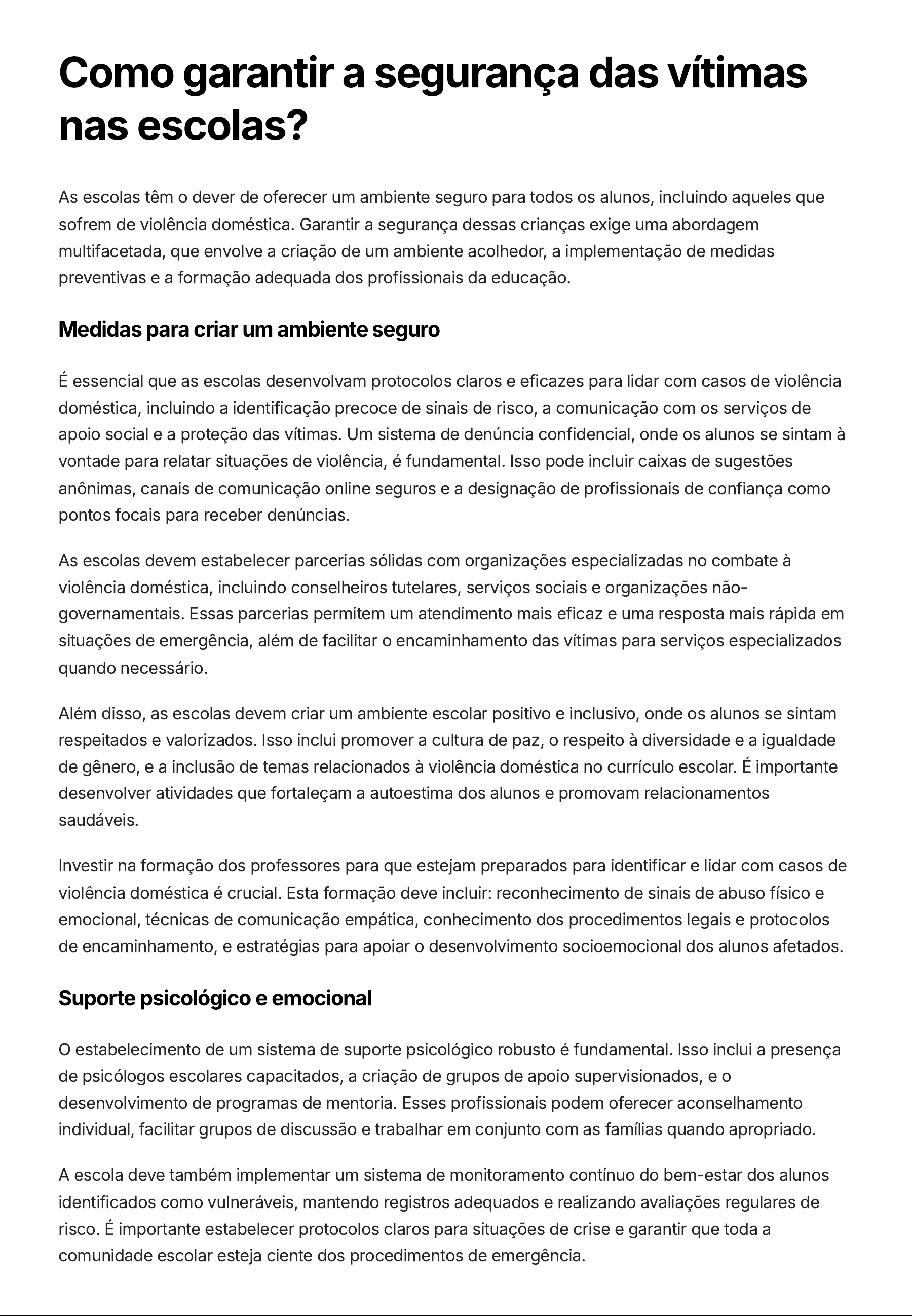 Como garantir a segurança das vítimas nas escolas? As escolas têm o dever de oferecer um ambiente seguro para todos os alunos, incluindo aqueles que sofrem de violência doméstica. Garantir a segurança dessas crianças exige uma abordagem multifacetada, que envolve a criação de um ambiente acolhedor, a implementação de medidas preventivas e a formação adequada dos profissionais da educação. Medidas para criar um ambiente seguro É essencial que as escolas desenvolvam protocolos claros e eficazes para lidar com casos de violência doméstica, incluindo a identificação precoce de sinais de risco, a comunicação com os serviços de apoio social e a proteção das vítimas. Um sistema de denúncia confidencial, onde os alunos se sintam à vontade para relatar situações de violência, é fundamental. Isso pode incluir caixas de sugestões anônimas, canais de comunicação online seguros e a designação de profissionais de confiança como pontos focais para receber denúncias. As escolas devem estabelecer parcerias sólidas com organizações especializadas no combate à violência doméstica, incluindo conselheiros tutelares, serviços sociais e organizações não- governamentais. Essas parcerias permitem um atendimento mais eficaz e uma resposta mais rápida em situações de emergência, além de facilitar o encaminhamento das vítimas para serviços especializados quando necessário. Além disso, as escolas devem criar um ambiente escolar positivo e inclusivo, onde os alunos se sintam respeitados e valorizados. Isso inclui promover a cultura de paz, o respeito à diversidade e a igualdade de gênero, e a inclusão de temas relacionados à violência doméstica no currículo escolar. É importante desenvolver atividades que fortaleçam a autoestima dos alunos e promovam relacionamentos saudáveis. Investir na formação dos professores para que estejam preparados para identificar e lidar com casos de violência doméstica é crucial. Esta formação deve incluir: reconhecimento de sinais de abuso físico e emocional, técnicas de comunicação empática, conhecimento dos procedimentos legais e protocolos de encaminhamento, e estratégias para apoiar o desenvolvimento socioemocional dos alunos afetados. Suporte psicológico e emocional O estabelecimento de um sistema de suporte psicológico robusto é fundamental. Isso inclui a presença de psicólogos escolares capacitados, a criação de grupos de apoio supervisionados, e o desenvolvimento de programas de mentoria. Esses profissionais podem oferecer aconselhamento individual, facilitar grupos de discussão e trabalhar em conjunto com as famílias quando apropriado. A escola deve também implementar um sistema de monitoramento contínuo do bem-estar dos alunos identificados como vulneráveis, mantendo registros adequados e realizando avaliações regulares de risco. É importante estabelecer protocolos claros para situações de crise e garantir que toda a comunidade escolar esteja ciente dos procedimentos de emergência.