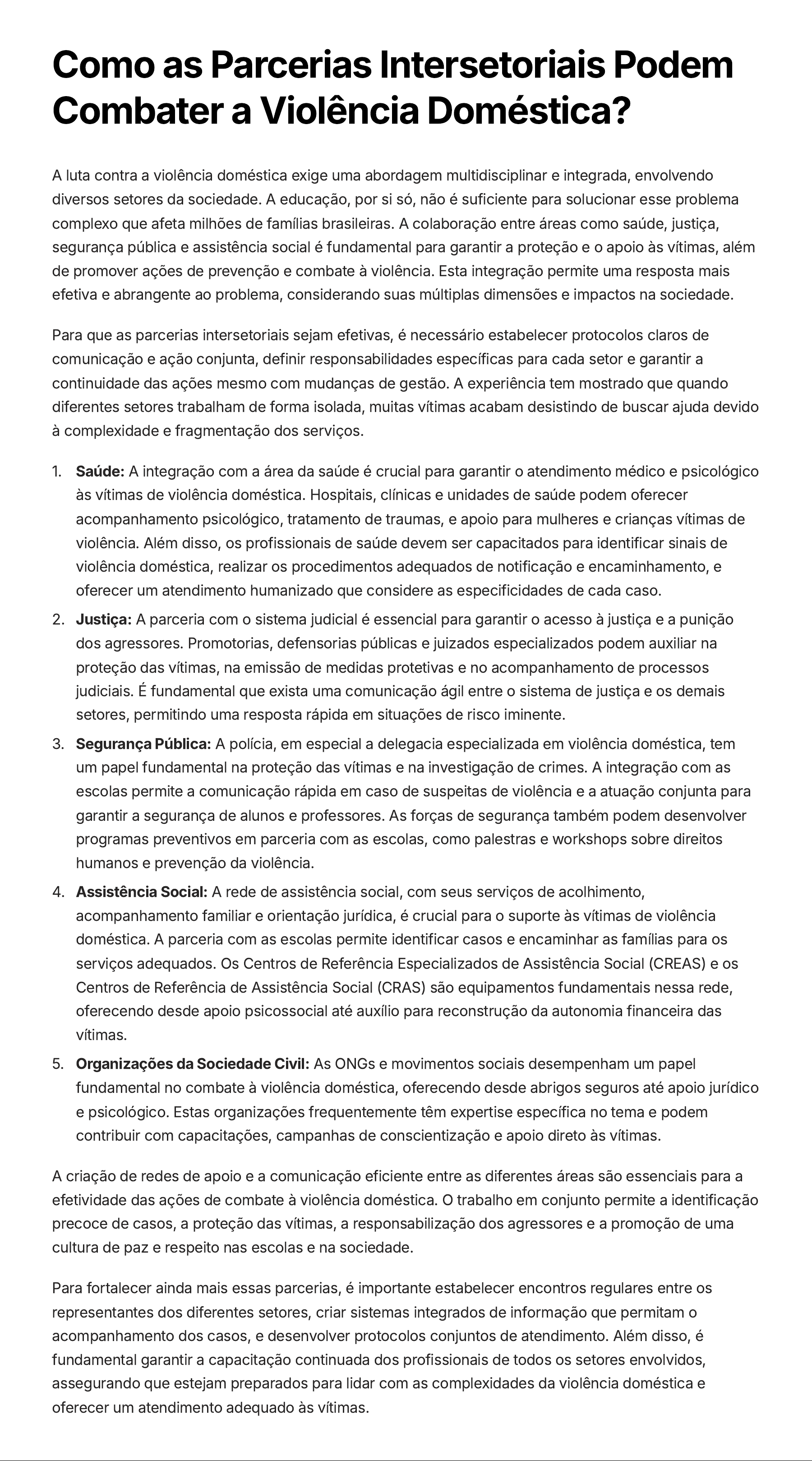 Como as Parcerias Intersetoriais Podem Combater a Violência Doméstica? A luta contra a violência doméstica exige uma abordagem multidisciplinar e integrada, envolvendo diversos setores da sociedade. A educação, por si só, não é suficiente para solucionar esse problema complexo que afeta milhões de famílias brasileiras. A colaboração entre áreas como saúde, justiça, segurança pública e assistência social é fundamental para garantir a proteção e o apoio às vítimas, além de promover ações de prevenção e combate à violência. Esta integração permite uma resposta mais efetiva e abrangente ao problema, considerando suas múltiplas dimensões e impactos na sociedade. Para que as parcerias intersetoriais sejam efetivas, é necessário estabelecer protocolos claros de comunicação e ação conjunta, definir responsabilidades específicas para cada setor e garantir a continuidade das ações mesmo com mudanças de gestão. A experiência tem mostrado que quando diferentes setores trabalham de forma isolada, muitas vítimas acabam desistindo de buscar ajuda devido à complexidade e fragmentação dos serviços. Saúde: A integração com a área da saúde é crucial para garantir o atendimento médico e psicológico às vítimas de violência doméstica. Hospitais, clínicas e unidades de saúde podem oferecer acompanhamento psicológico, tratamento de traumas, e apoio para mulheres e crianças vítimas de violência. Além disso, os profissionais de saúde devem ser capacitados para identificar sinais de violência doméstica, realizar os procedimentos adequados de notificação e encaminhamento, e oferecer um atendimento humanizado que considere as especificidades de cada caso. 1. Justiça: A parceria com o sistema judicial é essencial para garantir o acesso à justiça e a punição dos agressores. Promotorias, defensorias públicas e juizados especializados podem auxiliar na proteção das vítimas, na emissão de medidas protetivas e no acompanhamento de processos judiciais. É fundamental que exista uma comunicação ágil entre o sistema de justiça e os demais setores, permitindo uma resposta rápida em situações de risco iminente. 2. Segurança Pública: A polícia, em especial a delegacia especializada em violência doméstica, tem um papel fundamental na proteção das vítimas e na investigação de crimes. A integração com as escolas permite a comunicação rápida em caso de suspeitas de violência e a atuação conjunta para garantir a segurança de alunos e professores. As forças de segurança também podem desenvolver programas preventivos em parceria com as escolas, como palestras e workshops sobre direitos humanos e prevenção da violência. 3. Assistência Social: A rede de assistência social, com seus serviços de acolhimento, acompanhamento familiar e orientação jurídica, é crucial para o suporte às vítimas de violência doméstica. A parceria com as escolas permite identificar casos e encaminhar as famílias para os serviços adequados. Os Centros de Referência Especializados de Assistência Social (CREAS) e os Centros de Referência de Assistência Social (CRAS) são equipamentos fundamentais nessa rede, oferecendo desde apoio psicossocial até auxílio para reconstrução da autonomia financeira das vítimas. 4. Organizações da Sociedade Civil: As ONGs e movimentos sociais desempenham um papel fundamental no combate à violência doméstica, oferecendo desde abrigos seguros até apoio jurídico e psicológico. Estas organizações frequentemente têm expertise específica no tema e podem contribuir com capacitações, campanhas de conscientização e apoio direto às vítimas. 5. A criação de redes de apoio e a comunicação eficiente entre as diferentes áreas são essenciais para a efetividade das ações de combate à violência doméstica. O trabalho em conjunto permite a identificação precoce de casos, a proteção das vítimas, a responsabilização dos agressores e a promoção de uma cultura de paz e respeito nas escolas e na sociedade. Para fortalecer ainda mais essas parcerias, é importante estabelecer encontros regulares entre os representantes dos diferentes setores, criar sistemas integrados de informação que permitam o acompanhamento dos casos, e desenvolver protocolos conjuntos de atendimento. Além disso, é fundamental garantir a capacitação continuada dos profissionais de todos os setores envolvidos, assegurando que estejam preparados para lidar com as complexidades da violência doméstica e oferecer um atendimento adequado às vítimas.
