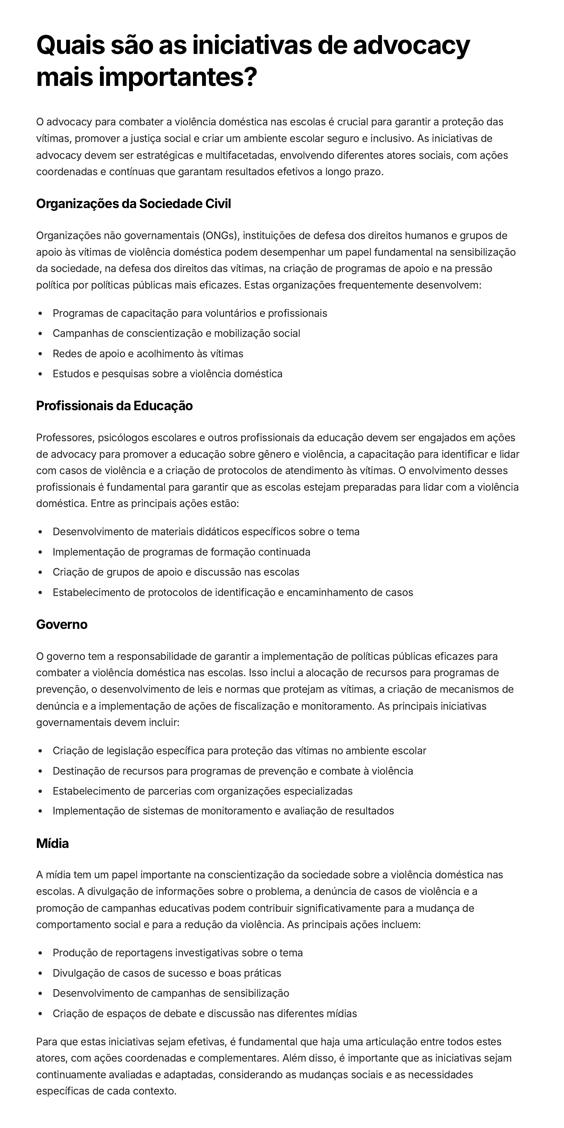 Quais são as iniciativas de advocacy mais importantes? O advocacy para combater a violência doméstica nas escolas é crucial para garantir a proteção das vítimas, promover a justiça social e criar um ambiente escolar seguro e inclusivo. As iniciativas de advocacy devem ser estratégicas e multifacetadas, envolvendo diferentes atores sociais, com ações coordenadas e contínuas que garantam resultados efetivos a longo prazo. Organizações da Sociedade Civil Organizações não governamentais (ONGs), instituições de defesa dos direitos humanos e grupos de apoio às vítimas de violência doméstica podem desempenhar um papel fundamental na sensibilização da sociedade, na defesa dos direitos das vítimas, na criação de programas de apoio e na pressão política por políticas públicas mais eficazes. Estas organizações frequentemente desenvolvem: Programas de capacitação para voluntários e profissionais Campanhas de conscientização e mobilização social Redes de apoio e acolhimento às vítimas Estudos e pesquisas sobre a violência doméstica Profissionais da Educação Professores, psicólogos escolares e outros profissionais da educação devem ser engajados em ações de advocacy para promover a educação sobre gênero e violência, a capacitação para identificar e lidar com casos de violência e a criação de protocolos de atendimento às vítimas. O envolvimento desses profissionais é fundamental para garantir que as escolas estejam preparadas para lidar com a violência doméstica. Entre as principais ações estão: Desenvolvimento de materiais didáticos específicos sobre o tema Implementação de programas de formação continuada Criação de grupos de apoio e discussão nas escolas Estabelecimento de protocolos de identificação e encaminhamento de casos Governo O governo tem a responsabilidade de garantir a implementação de políticas públicas eficazes para combater a violência doméstica nas escolas. Isso inclui a alocação de recursos para programas de prevenção, o desenvolvimento de leis e normas que protejam as vítimas, a criação de mecanismos de denúncia e a implementação de ações de fiscalização e monitoramento. As principais iniciativas governamentais devem incluir: Criação de legislação específica para proteção das vítimas no ambiente escolar Destinação de recursos para programas de prevenção e combate à violência Estabelecimento de parcerias com organizações especializadas Implementação de sistemas de monitoramento e avaliação de resultados Mídia A mídia tem um papel importante na conscientização da sociedade sobre a violência doméstica nas escolas. A divulgação de informações sobre o problema, a denúncia de casos de violência e a promoção de campanhas educativas podem contribuir significativamente para a mudança de comportamento social e para a redução da violência. As principais ações incluem: Produção de reportagens investigativas sobre o tema Divulgação de casos de sucesso e boas práticas Desenvolvimento de campanhas de sensibilização Criação de espaços de debate e discussão nas diferentes mídias Para que estas iniciativas sejam efetivas, é fundamental que haja uma articulação entre todos estes atores, com ações coordenadas e complementares. Além disso, é importante que as iniciativas sejam continuamente avaliadas e adaptadas, considerando as mudanças sociais e as necessidades específicas de cada contexto.