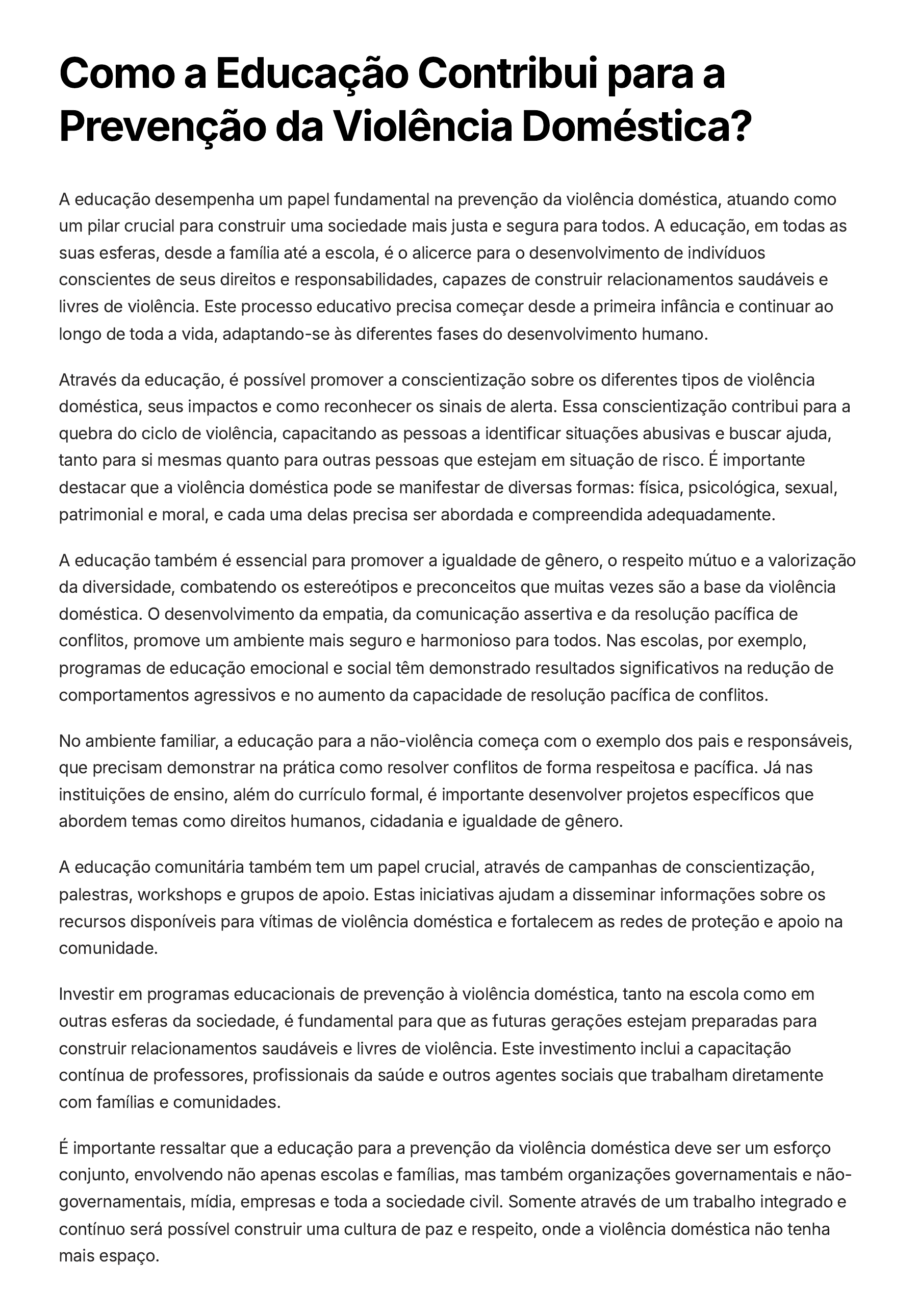 Como a Educação Contribui para a Prevenção da Violência Doméstica? A educação desempenha um papel fundamental na prevenção da violência doméstica, atuando como um pilar crucial para construir uma sociedade mais justa e segura para todos. A educação, em todas as suas esferas, desde a família até a escola, é o alicerce para o desenvolvimento de indivíduos conscientes de seus direitos e responsabilidades, capazes de construir relacionamentos saudáveis e livres de violência. Este processo educativo precisa começar desde a primeira infância e continuar ao longo de toda a vida, adaptando-se às diferentes fases do desenvolvimento humano. Através da educação, é possível promover a conscientização sobre os diferentes tipos de violência doméstica, seus impactos e como reconhecer os sinais de alerta. Essa conscientização contribui para a quebra do ciclo de violência, capacitando as pessoas a identificar situações abusivas e buscar ajuda, tanto para si mesmas quanto para outras pessoas que estejam em situação de risco. É importante destacar que a violência doméstica pode se manifestar de diversas formas: física, psicológica, sexual, patrimonial e moral, e cada uma delas precisa ser abordada e compreendida adequadamente. A educação também é essencial para promover a igualdade de gênero, o respeito mútuo e a valorização da diversidade, combatendo os estereótipos e preconceitos que muitas vezes são a base da violência doméstica. O desenvolvimento da empatia, da comunicação assertiva e da resolução pacífica de conflitos, promove um ambiente mais seguro e harmonioso para todos. Nas escolas, por exemplo, programas de educação emocional e social têm demonstrado resultados significativos na redução de comportamentos agressivos e no aumento da capacidade de resolução pacífica de conflitos. No ambiente familiar, a educação para a não-violência começa com o exemplo dos pais e responsáveis, que precisam demonstrar na prática como resolver conflitos de forma respeitosa e pacífica. Já nas instituições de ensino, além do currículo formal, é importante desenvolver projetos específicos que abordem temas como direitos humanos, cidadania e igualdade de gênero. A educação comunitária também tem um papel crucial, através de campanhas de conscientização, palestras, workshops e grupos de apoio. Estas iniciativas ajudam a disseminar informações sobre os recursos disponíveis para vítimas de violência doméstica e fortalecem as redes de proteção e apoio na comunidade. Investir em programas educacionais de prevenção à violência doméstica, tanto na escola como em outras esferas da sociedade, é fundamental para que as futuras gerações estejam preparadas para construir relacionamentos saudáveis e livres de violência. Este investimento inclui a capacitação contínua de professores, profissionais da saúde e outros agentes sociais que trabalham diretamente com famílias e comunidades. É importante ressaltar que a educação para a prevenção da violência doméstica deve ser um esforço conjunto, envolvendo não apenas escolas e famílias, mas também organizações governamentais e não- governamentais, mídia, empresas e toda a sociedade civil. Somente através de um trabalho integrado e contínuo será possível construir uma cultura de paz e respeito, onde a violência doméstica não tenha mais espaço.