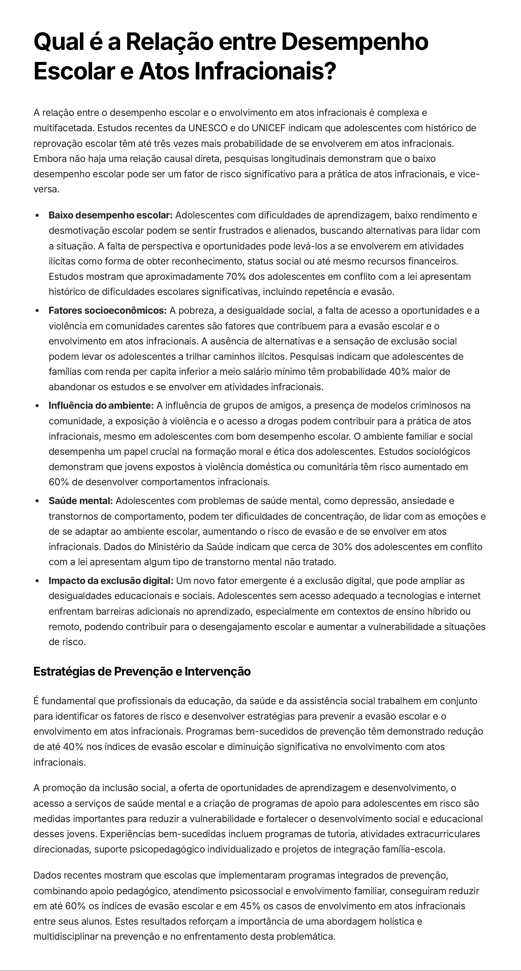 Qual é a Relação entre Desempenho Escolar e Atos Infracionais? A relação entre o desempenho escolar e o envolvimento em atos infracionais é complexa e multifacetada. Estudos recentes da UNESCO e do UNICEF indicam que adolescentes com histórico de reprovação escolar têm até três vezes mais probabilidade de se envolverem em atos infracionais. Embora não haja uma relação causal direta, pesquisas longitudinais demonstram que o baixo desempenho escolar pode ser um fator de risco significativo para a prática de atos infracionais, e vice- versa. Baixo desempenho escolar: Adolescentes com dificuldades de aprendizagem, baixo rendimento e desmotivação escolar podem se sentir frustrados e alienados, buscando alternativas para lidar com a situação. A falta de perspectiva e oportunidades pode levá-los a se envolverem em atividades ilícitas como forma de obter reconhecimento, status social ou até mesmo recursos financeiros. Estudos mostram que aproximadamente 70% dos adolescentes em conflito com a lei apresentam histórico de dificuldades escolares significativas, incluindo repetência e evasão. Fatores socioeconômicos: A pobreza, a desigualdade social, a falta de acesso a oportunidades e a violência em comunidades carentes são fatores que contribuem para a evasão escolar e o envolvimento em atos infracionais. A ausência de alternativas e a sensação de exclusão social podem levar os adolescentes a trilhar caminhos ilícitos. Pesquisas indicam que adolescentes de famílias com renda per capita inferior a meio salário mínimo têm probabilidade 40% maior de abandonar os estudos e se envolver em atividades infracionais. Influência do ambiente: A influência de grupos de amigos, a presença de modelos criminosos na comunidade, a exposição à violência e o acesso a drogas podem contribuir para a prática de atos infracionais, mesmo em adolescentes com bom desempenho escolar. O ambiente familiar e social desempenha um papel crucial na formação moral e ética dos adolescentes. Estudos sociológicos demonstram que jovens expostos à violência doméstica ou comunitária têm risco aumentado em 60% de desenvolver comportamentos infracionais. Saúde mental: Adolescentes com problemas de saúde mental, como depressão, ansiedade e transtornos de comportamento, podem ter dificuldades de concentração, de lidar com as emoções e de se adaptar ao ambiente escolar, aumentando o risco de evasão e de se envolver em atos infracionais. Dados do Ministério da Saúde indicam que cerca de 30% dos adolescentes em conflito com a lei apresentam algum tipo de transtorno mental não tratado. Impacto da exclusão digital: Um novo fator emergente é a exclusão digital, que pode ampliar as desigualdades educacionais e sociais. Adolescentes sem acesso adequado a tecnologias e internet enfrentam barreiras adicionais no aprendizado, especialmente em contextos de ensino híbrido ou remoto, podendo contribuir para o desengajamento escolar e aumentar a vulnerabilidade a situações de risco. Estratégias de Prevenção e Intervenção É fundamental que profissionais da educação, da saúde e da assistência social trabalhem em conjunto para identificar os fatores de risco e desenvolver estratégias para prevenir a evasão escolar e o envolvimento em atos infracionais. Programas bem-sucedidos de prevenção têm demonstrado redução de até 40% nos índices de evasão escolar e diminuição significativa no envolvimento com atos infracionais. A promoção da inclusão social, a oferta de oportunidades de aprendizagem e desenvolvimento, o acesso a serviços de saúde mental e a criação de programas de apoio para adolescentes em risco são medidas importantes para reduzir a vulnerabilidade e fortalecer o desenvolvimento social e educacional desses jovens. Experiências bem-sucedidas incluem programas de tutoria, atividades extracurriculares direcionadas, suporte psicopedagógico individualizado e projetos de integração família-escola. Dados recentes mostram que escolas que implementaram programas integrados de prevenção, combinando apoio pedagógico, atendimento psicossocial e envolvimento familiar, conseguiram reduzir em até 60% os índices de evasão escolar e em 45% os casos de envolvimento em atos infracionais entre seus alunos. Estes resultados reforçam a importância de uma abordagem holística e multidisciplinar na prevenção e no enfrentamento desta problemática.