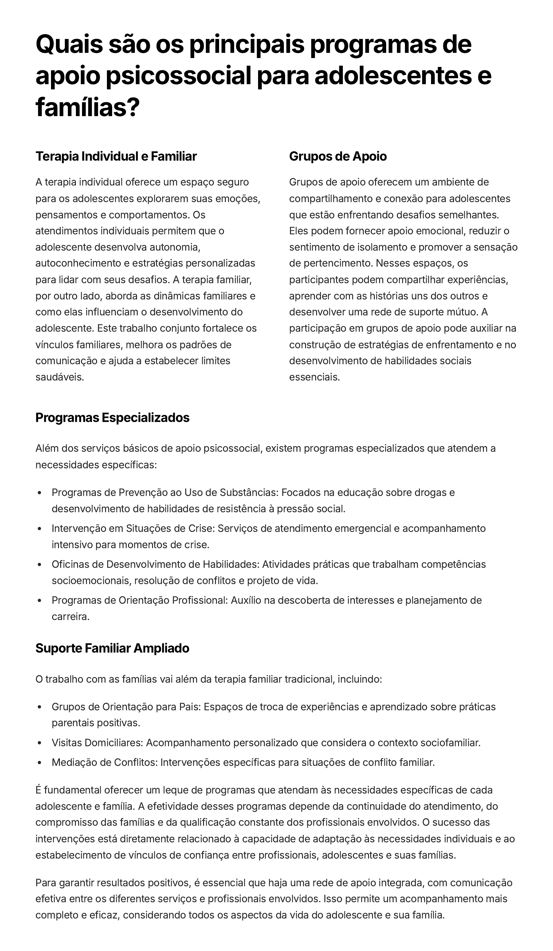 Quais são os principais programas de apoio psicossocial para adolescentes e famílias? Terapia Individual e Familiar A terapia individual oferece um espaço seguro para os adolescentes explorarem suas emoções, pensamentos e comportamentos. Os atendimentos individuais permitem que o adolescente desenvolva autonomia, autoconhecimento e estratégias personalizadas para lidar com seus desafios. A terapia familiar, por outro lado, aborda as dinâmicas familiares e como elas influenciam o desenvolvimento do adolescente. Este trabalho conjunto fortalece os vínculos familiares, melhora os padrões de comunicação e ajuda a estabelecer limites saudáveis. Grupos de Apoio Grupos de apoio oferecem um ambiente de compartilhamento e conexão para adolescentes que estão enfrentando desafios semelhantes. Eles podem fornecer apoio emocional, reduzir o sentimento de isolamento e promover a sensação de pertencimento. Nesses espaços, os participantes podem compartilhar experiências, aprender com as histórias uns dos outros e desenvolver uma rede de suporte mútuo. A participação em grupos de apoio pode auxiliar na construção de estratégias de enfrentamento e no desenvolvimento de habilidades sociais essenciais. Programas Especializados Além dos serviços básicos de apoio psicossocial, existem programas especializados que atendem a necessidades específicas: Programas de Prevenção ao Uso de Substâncias: Focados na educação sobre drogas e desenvolvimento de habilidades de resistência à pressão social. Intervenção em Situações de Crise: Serviços de atendimento emergencial e acompanhamento intensivo para momentos de crise. Oficinas de Desenvolvimento de Habilidades: Atividades práticas que trabalham competências socioemocionais, resolução de conflitos e projeto de vida. Programas de Orientação Profissional: Auxílio na descoberta de interesses e planejamento de carreira. Suporte Familiar Ampliado O trabalho com as famílias vai além da terapia familiar tradicional, incluindo: Grupos de Orientação para Pais: Espaços de troca de experiências e aprendizado sobre práticas parentais positivas. Visitas Domiciliares: Acompanhamento personalizado que considera o contexto sociofamiliar. Mediação de Conflitos: Intervenções específicas para situações de conflito familiar. É fundamental oferecer um leque de programas que atendam às necessidades específicas de cada adolescente e família. A efetividade desses programas depende da continuidade do atendimento, do compromisso das famílias e da qualificação constante dos profissionais envolvidos. O sucesso das intervenções está diretamente relacionado à capacidade de adaptação às necessidades individuais e ao estabelecimento de vínculos de confiança entre profissionais, adolescentes e suas famílias. Para garantir resultados positivos, é essencial que haja uma rede de apoio integrada, com comunicação efetiva entre os diferentes serviços e profissionais envolvidos. Isso permite um acompanhamento mais completo e eficaz, considerando todos os aspectos da vida do adolescente e sua família.