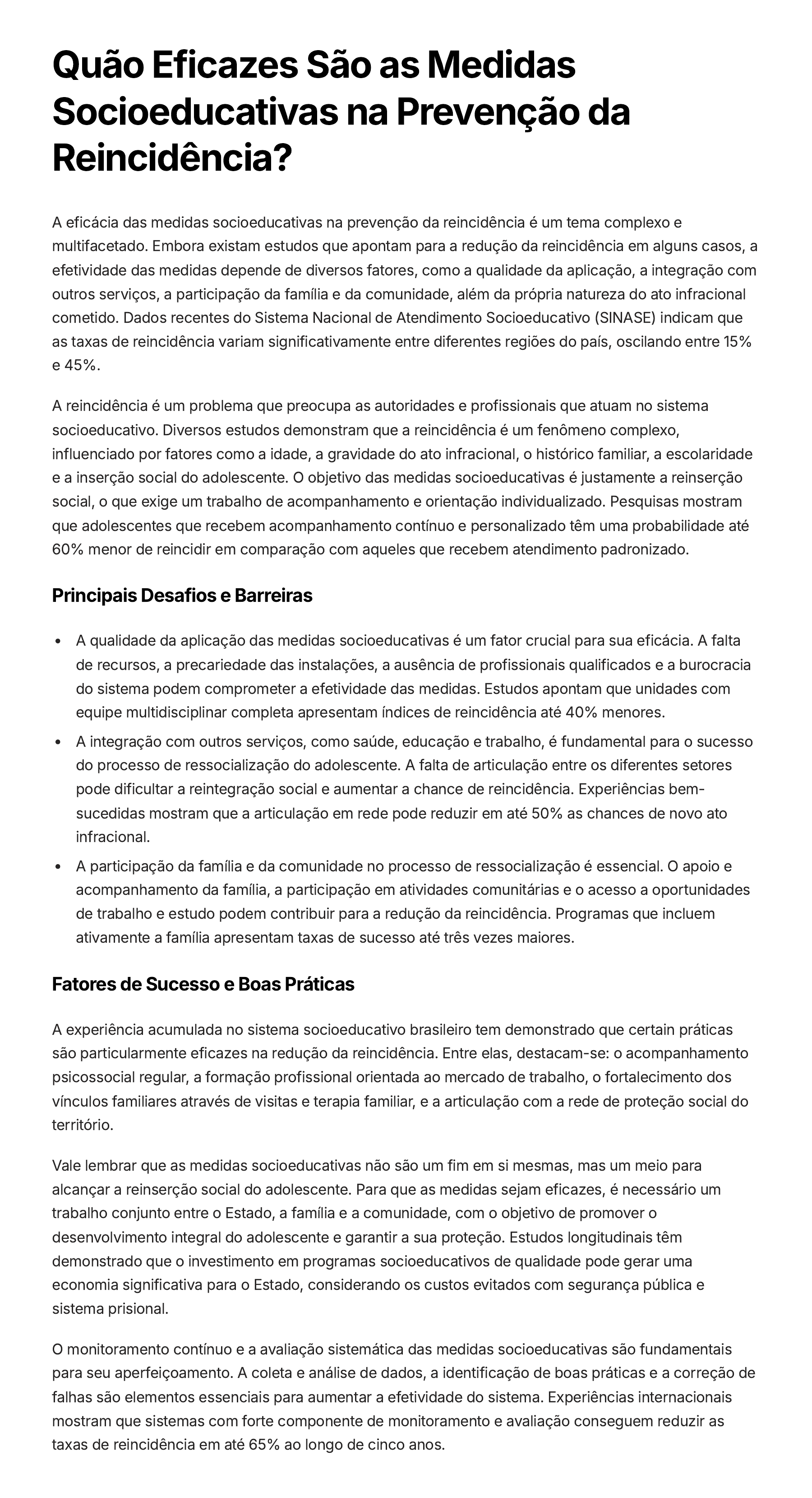 Quão Eficazes São as Medidas Socioeducativas na Prevenção da Reincidência? A eficácia das medidas socioeducativas na prevenção da reincidência é um tema complexo e multifacetado. Embora existam estudos que apontam para a redução da reincidência em alguns casos, a efetividade das medidas depende de diversos fatores, como a qualidade da aplicação, a integração com outros serviços, a participação da família e da comunidade, além da própria natureza do ato infracional cometido. Dados recentes do Sistema Nacional de Atendimento Socioeducativo (SINASE) indicam que as taxas de reincidência variam significativamente entre diferentes regiões do país, oscilando entre 15% e 45%. A reincidência é um problema que preocupa as autoridades e profissionais que atuam no sistema socioeducativo. Diversos estudos demonstram que a reincidência é um fenômeno complexo, influenciado por fatores como a idade, a gravidade do ato infracional, o histórico familiar, a escolaridade e a inserção social do adolescente. O objetivo das medidas socioeducativas é justamente a reinserção social, o que exige um trabalho de acompanhamento e orientação individualizado. Pesquisas mostram que adolescentes que recebem acompanhamento contínuo e personalizado têm uma probabilidade até 60% menor de reincidir em comparação com aqueles que recebem atendimento padronizado. Principais Desafios e Barreiras A qualidade da aplicação das medidas socioeducativas é um fator crucial para sua eficácia. A falta de recursos, a precariedade das instalações, a ausência de profissionais qualificados e a burocracia do sistema podem comprometer a efetividade das medidas. Estudos apontam que unidades com equipe multidisciplinar completa apresentam índices de reincidência até 40% menores. A integração com outros serviços, como saúde, educação e trabalho, é fundamental para o sucesso do processo de ressocialização do adolescente. A falta de articulação entre os diferentes setores pode dificultar a reintegração social e aumentar a chance de reincidência. Experiências bem- sucedidas mostram que a articulação em rede pode reduzir em até 50% as chances de novo ato infracional. A participação da família e da comunidade no processo de ressocialização é essencial. O apoio e acompanhamento da família, a participação em atividades comunitárias e o acesso a oportunidades de trabalho e estudo podem contribuir para a redução da reincidência. Programas que incluem ativamente a família apresentam taxas de sucesso até três vezes maiores. Fatores de Sucesso e Boas Práticas A experiência acumulada no sistema socioeducativo brasileiro tem demonstrado que certain práticas são particularmente eficazes na redução da reincidência. Entre elas, destacam-se: o acompanhamento psicossocial regular, a formação profissional orientada ao mercado de trabalho, o fortalecimento dos vínculos familiares através de visitas e terapia familiar, e a articulação com a rede de proteção social do território. Vale lembrar que as medidas socioeducativas não são um fim em si mesmas, mas um meio para alcançar a reinserção social do adolescente. Para que as medidas sejam eficazes, é necessário um trabalho conjunto entre o Estado, a família e a comunidade, com o objetivo de promover o desenvolvimento integral do adolescente e garantir a sua proteção. Estudos longitudinais têm demonstrado que o investimento em programas socioeducativos de qualidade pode gerar uma economia significativa para o Estado, considerando os custos evitados com segurança pública e sistema prisional. O monitoramento contínuo e a avaliação sistemática das medidas socioeducativas são fundamentais para seu aperfeiçoamento. A coleta e análise de dados, a identificação de boas práticas e a correção de falhas são elementos essenciais para aumentar a efetividade do sistema. Experiências internacionais mostram que sistemas com forte componente de monitoramento e avaliação conseguem reduzir as taxas de reincidência em até 65% ao longo de cinco anos.