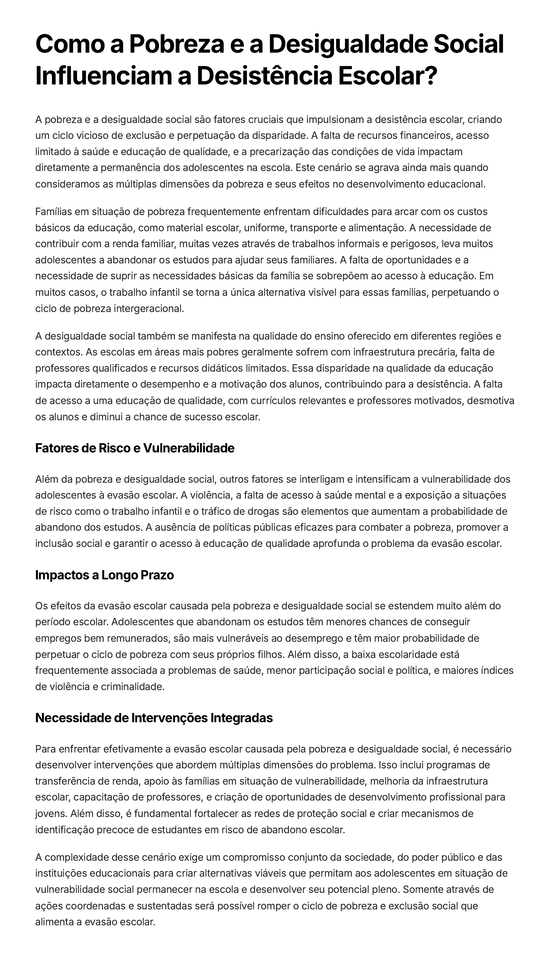 Como a Pobreza e a Desigualdade Social Influenciam a Desistência Escolar? A pobreza e a desigualdade social são fatores cruciais que impulsionam a desistência escolar, criando um ciclo vicioso de exclusão e perpetuação da disparidade. A falta de recursos financeiros, acesso limitado à saúde e educação de qualidade, e a precarização das condições de vida impactam diretamente a permanência dos adolescentes na escola. Este cenário se agrava ainda mais quando consideramos as múltiplas dimensões da pobreza e seus efeitos no desenvolvimento educacional. Famílias em situação de pobreza frequentemente enfrentam dificuldades para arcar com os custos básicos da educação, como material escolar, uniforme, transporte e alimentação. A necessidade de contribuir com a renda familiar, muitas vezes através de trabalhos informais e perigosos, leva muitos adolescentes a abandonar os estudos para ajudar seus familiares. A falta de oportunidades e a necessidade de suprir as necessidades básicas da família se sobrepõem ao acesso à educação. Em muitos casos, o trabalho infantil se torna a única alternativa visível para essas famílias, perpetuando o ciclo de pobreza intergeracional. A desigualdade social também se manifesta na qualidade do ensino oferecido em diferentes regiões e contextos. As escolas em áreas mais pobres geralmente sofrem com infraestrutura precária, falta de professores qualificados e recursos didáticos limitados. Essa disparidade na qualidade da educação impacta diretamente o desempenho e a motivação dos alunos, contribuindo para a desistência. A falta de acesso a uma educação de qualidade, com currículos relevantes e professores motivados, desmotiva os alunos e diminui a chance de sucesso escolar. Fatores de Risco e Vulnerabilidade Além da pobreza e desigualdade social, outros fatores se interligam e intensificam a vulnerabilidade dos adolescentes à evasão escolar. A violência, a falta de acesso à saúde mental e a exposição a situações de risco como o trabalho infantil e o tráfico de drogas são elementos que aumentam a probabilidade de abandono dos estudos. A ausência de políticas públicas eficazes para combater a pobreza, promover a inclusão social e garantir o acesso à educação de qualidade aprofunda o problema da evasão escolar. Impactos a Longo Prazo Os efeitos da evasão escolar causada pela pobreza e desigualdade social se estendem muito além do período escolar. Adolescentes que abandonam os estudos têm menores chances de conseguir empregos bem remunerados, são mais vulneráveis ao desemprego e têm maior probabilidade de perpetuar o ciclo de pobreza com seus próprios filhos. Além disso, a baixa escolaridade está frequentemente associada a problemas de saúde, menor participação social e política, e maiores índices de violência e criminalidade. Necessidade de Intervenções Integradas Para enfrentar efetivamente a evasão escolar causada pela pobreza e desigualdade social, é necessário desenvolver intervenções que abordem múltiplas dimensões do problema. Isso inclui programas de transferência de renda, apoio às famílias em situação de vulnerabilidade, melhoria da infraestrutura escolar, capacitação de professores, e criação de oportunidades de desenvolvimento profissional para jovens. Além disso, é fundamental fortalecer as redes de proteção social e criar mecanismos de identificação precoce de estudantes em risco de abandono escolar. A complexidade desse cenário exige um compromisso conjunto da sociedade, do poder público e das instituições educacionais para criar alternativas viáveis que permitam aos adolescentes em situação de vulnerabilidade social permanecer na escola e desenvolver seu potencial pleno. Somente através de ações coordenadas e sustentadas será possível romper o ciclo de pobreza e exclusão social que alimenta a evasão escolar.