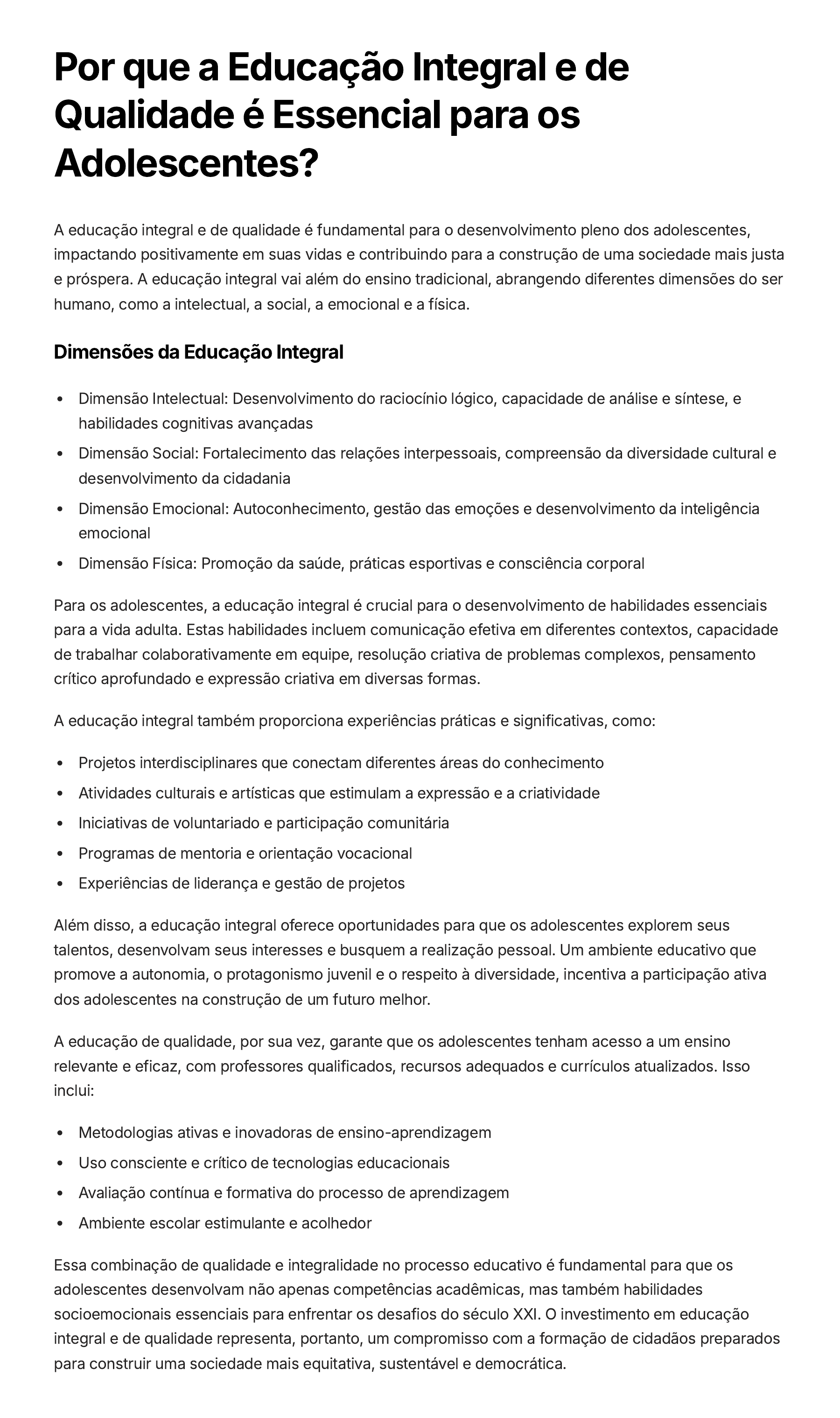 Por que a Educação Integral e de Qualidade é Essencial para os Adolescentes? A educação integral e de qualidade é fundamental para o desenvolvimento pleno dos adolescentes, impactando positivamente em suas vidas e contribuindo para a construção de uma sociedade mais justa e próspera. A educação integral vai além do ensino tradicional, abrangendo diferentes dimensões do ser humano, como a intelectual, a social, a emocional e a física. Dimensões da Educação Integral Dimensão Intelectual: Desenvolvimento do raciocínio lógico, capacidade de análise e síntese, e habilidades cognitivas avançadas Dimensão Social: Fortalecimento das relações interpessoais, compreensão da diversidade cultural e desenvolvimento da cidadania Dimensão Emocional: Autoconhecimento, gestão das emoções e desenvolvimento da inteligência emocional Dimensão Física: Promoção da saúde, práticas esportivas e consciência corporal Para os adolescentes, a educação integral é crucial para o desenvolvimento de habilidades essenciais para a vida adulta. Estas habilidades incluem comunicação efetiva em diferentes contextos, capacidade de trabalhar colaborativamente em equipe, resolução criativa de problemas complexos, pensamento crítico aprofundado e expressão criativa em diversas formas. A educação integral também proporciona experiências práticas e significativas, como: Projetos interdisciplinares que conectam diferentes áreas do conhecimento Atividades culturais e artísticas que estimulam a expressão e a criatividade Iniciativas de voluntariado e participação comunitária Programas de mentoria e orientação vocacional Experiências de liderança e gestão de projetos Além disso, a educação integral oferece oportunidades para que os adolescentes explorem seus talentos, desenvolvam seus interesses e busquem a realização pessoal. Um ambiente educativo que promove a autonomia, o protagonismo juvenil e o respeito à diversidade, incentiva a participação ativa dos adolescentes na construção de um futuro melhor. A educação de qualidade, por sua vez, garante que os adolescentes tenham acesso a um ensino relevante e eficaz, com professores qualificados, recursos adequados e currículos atualizados. Isso inclui: Metodologias ativas e inovadoras de ensino-aprendizagem Uso consciente e crítico de tecnologias educacionais Avaliação contínua e formativa do processo de aprendizagem Ambiente escolar estimulante e acolhedor Essa combinação de qualidade e integralidade no processo educativo é fundamental para que os adolescentes desenvolvam não apenas competências acadêmicas, mas também habilidades socioemocionais essenciais para enfrentar os desafios do século XXI. O investimento em educação integral e de qualidade representa, portanto, um compromisso com a formação de cidadãos preparados para construir uma sociedade mais equitativa, sustentável e democrática.