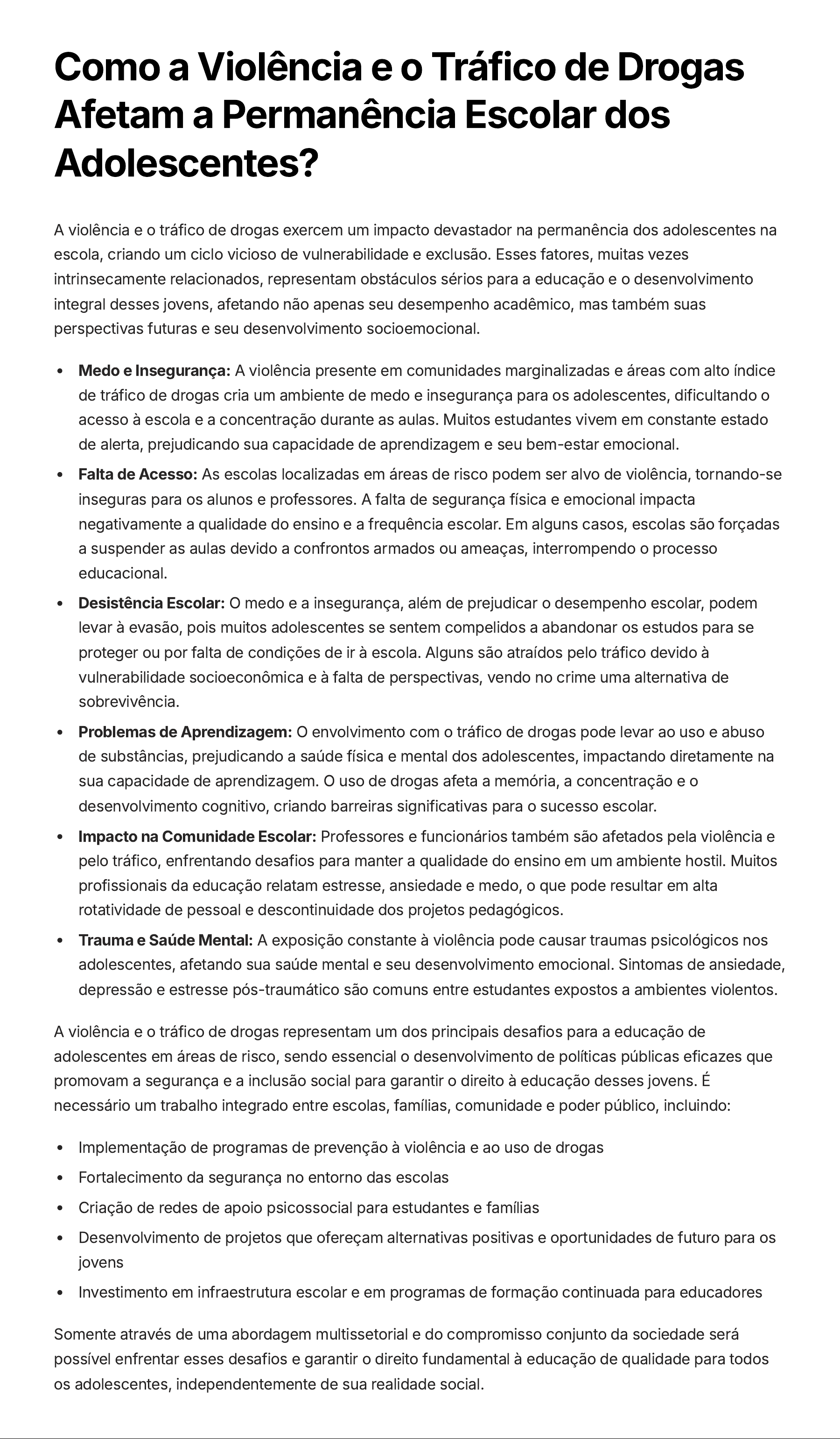 Como a Violência e o Tráfico de Drogas Afetam a Permanência Escolar dos Adolescentes? A violência e o tráfico de drogas exercem um impacto devastador na permanência dos adolescentes na escola, criando um ciclo vicioso de vulnerabilidade e exclusão. Esses fatores, muitas vezes intrinsecamente relacionados, representam obstáculos sérios para a educação e o desenvolvimento integral desses jovens, afetando não apenas seu desempenho acadêmico, mas também suas perspectivas futuras e seu desenvolvimento socioemocional. Medo e Insegurança: A violência presente em comunidades marginalizadas e áreas com alto índice de tráfico de drogas cria um ambiente de medo e insegurança para os adolescentes, dificultando o acesso à escola e a concentração durante as aulas. Muitos estudantes vivem em constante estado de alerta, prejudicando sua capacidade de aprendizagem e seu bem-estar emocional. Falta de Acesso: As escolas localizadas em áreas de risco podem ser alvo de violência, tornando-se inseguras para os alunos e professores. A falta de segurança física e emocional impacta negativamente a qualidade do ensino e a frequência escolar. Em alguns casos, escolas são forçadas a suspender as aulas devido a confrontos armados ou ameaças, interrompendo o processo educacional. Desistência Escolar: O medo e a insegurança, além de prejudicar o desempenho escolar, podem levar à evasão, pois muitos adolescentes se sentem compelidos a abandonar os estudos para se proteger ou por falta de condições de ir à escola. Alguns são atraídos pelo tráfico devido à vulnerabilidade socioeconômica e à falta de perspectivas, vendo no crime uma alternativa de sobrevivência. Problemas de Aprendizagem: O envolvimento com o tráfico de drogas pode levar ao uso e abuso de substâncias, prejudicando a saúde física e mental dos adolescentes, impactando diretamente na sua capacidade de aprendizagem. O uso de drogas afeta a memória, a concentração e o desenvolvimento cognitivo, criando barreiras significativas para o sucesso escolar. Impacto na Comunidade Escolar: Professores e funcionários também são afetados pela violência e pelo tráfico, enfrentando desafios para manter a qualidade do ensino em um ambiente hostil. Muitos profissionais da educação relatam estresse, ansiedade e medo, o que pode resultar em alta rotatividade de pessoal e descontinuidade dos projetos pedagógicos. Trauma e Saúde Mental: A exposição constante à violência pode causar traumas psicológicos nos adolescentes, afetando sua saúde mental e seu desenvolvimento emocional. Sintomas de ansiedade, depressão e estresse pós-traumático são comuns entre estudantes expostos a ambientes violentos. A violência e o tráfico de drogas representam um dos principais desafios para a educação de adolescentes em áreas de risco, sendo essencial o desenvolvimento de políticas públicas eficazes que promovam a segurança e a inclusão social para garantir o direito à educação desses jovens. É necessário um trabalho integrado entre escolas, famílias, comunidade e poder público, incluindo: Implementação de programas de prevenção à violência e ao uso de drogas Fortalecimento da segurança no entorno das escolas Criação de redes de apoio psicossocial para estudantes e famílias Desenvolvimento de projetos que ofereçam alternativas positivas e oportunidades de futuro para os jovens Investimento em infraestrutura escolar e em programas de formação continuada para educadores Somente através de uma abordagem multissetorial e do compromisso conjunto da sociedade será possível enfrentar esses desafios e garantir o direito fundamental à educação de qualidade para todos os adolescentes, independentemente de sua realidade social.